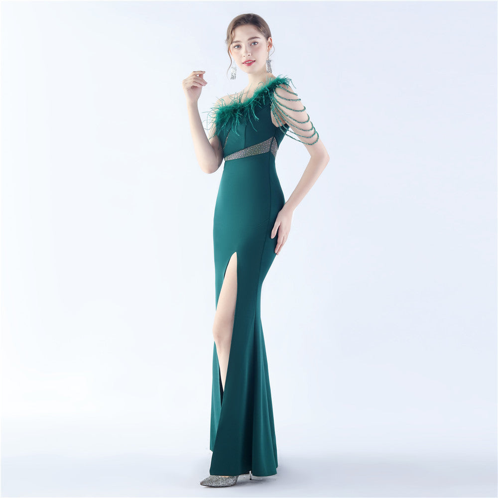 Ostrich Feather Sequined One-Shoulder Maxi Dress