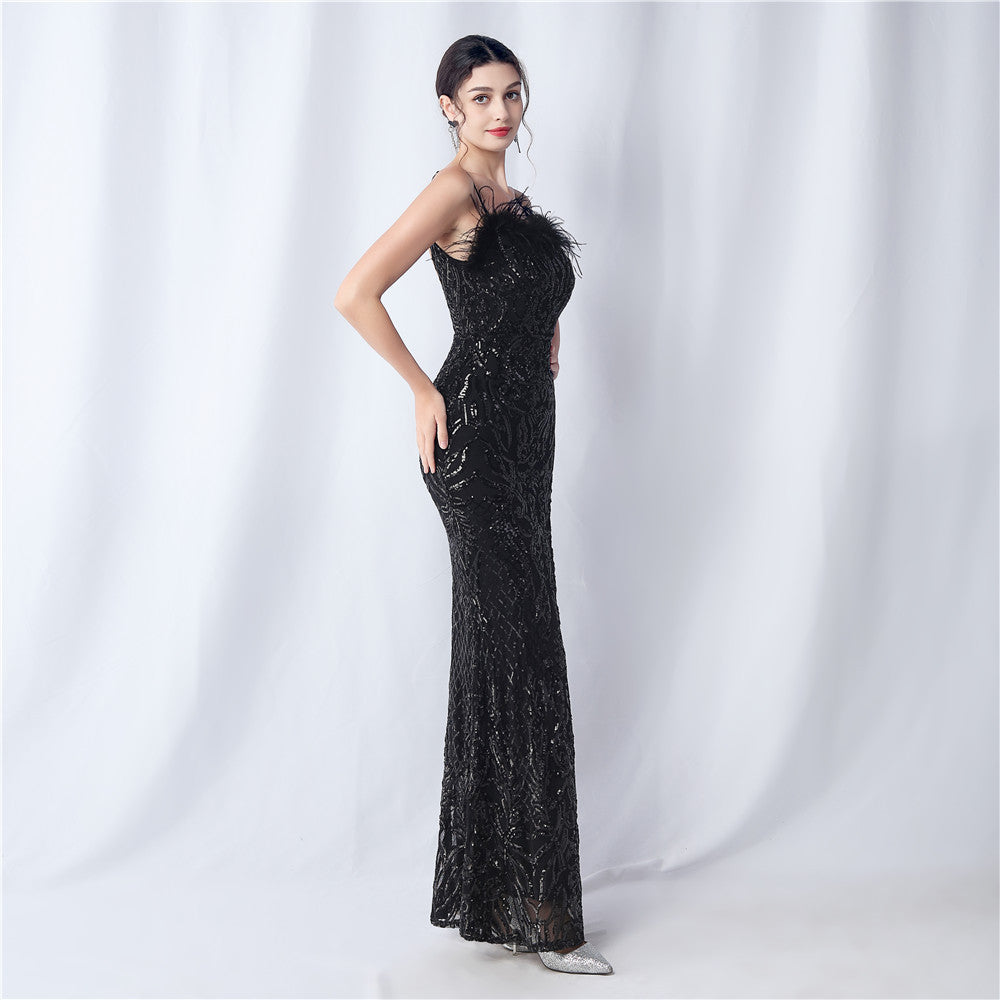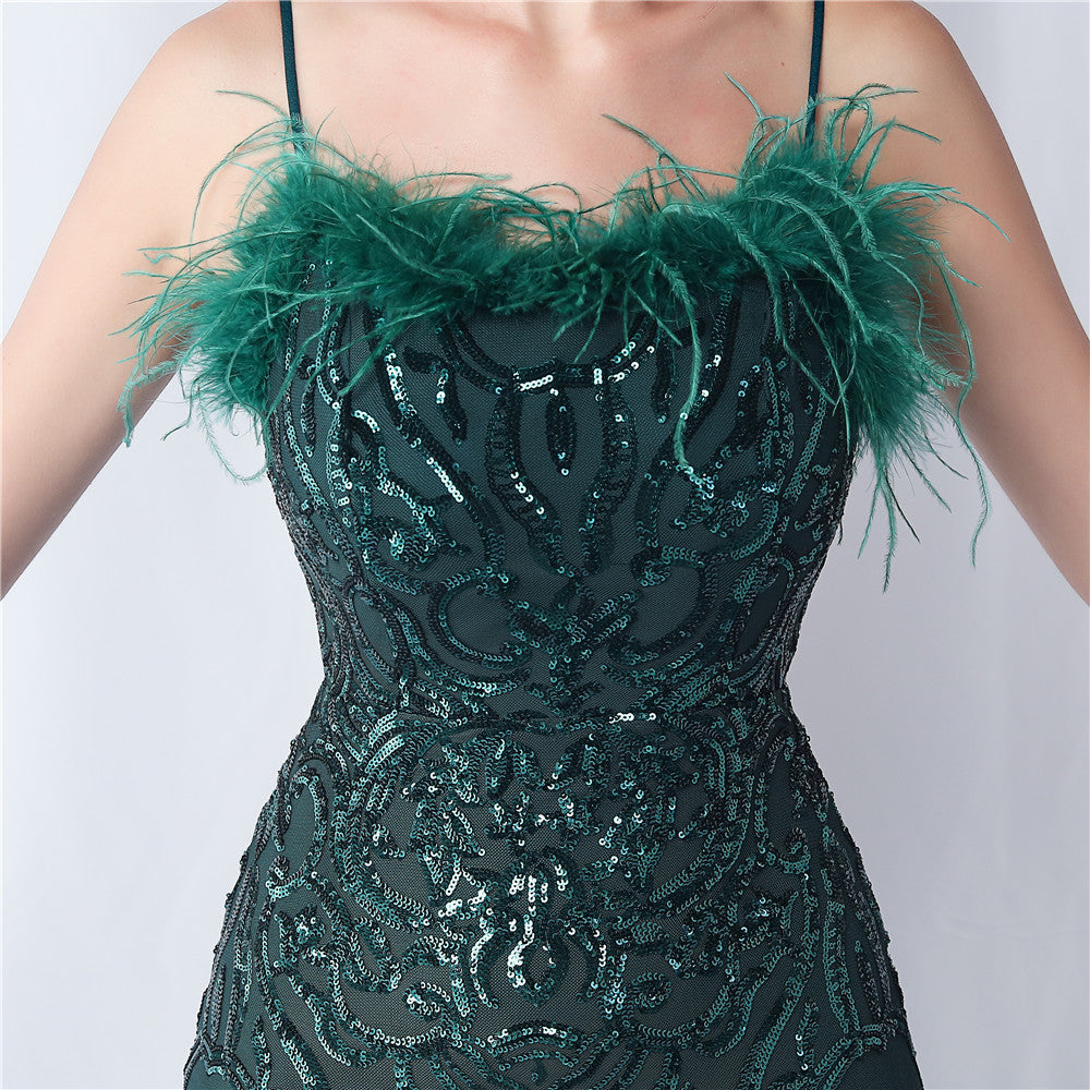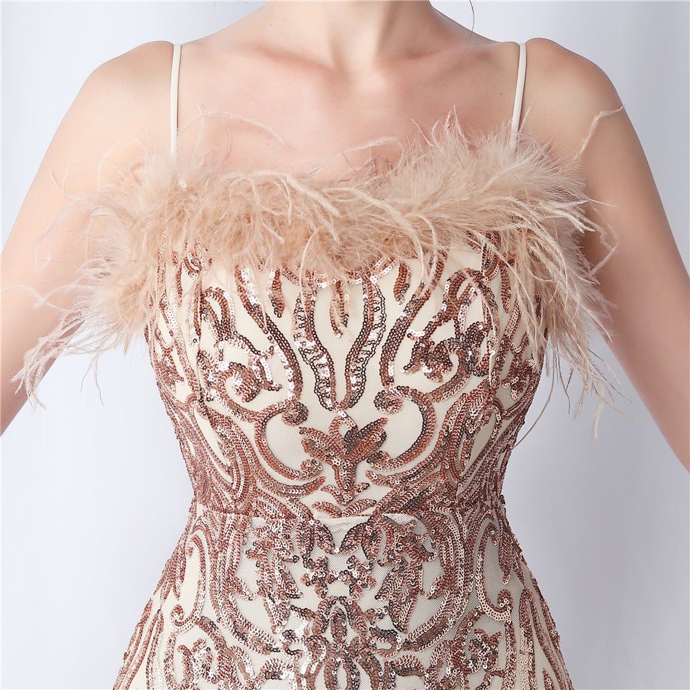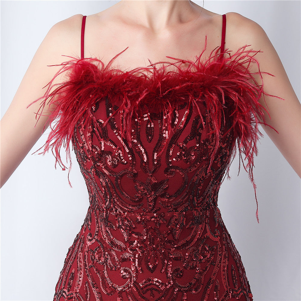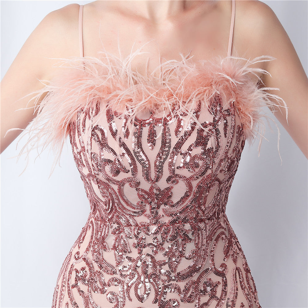 A sequined split maxi dress with a slim silhouette. The spaghetti-strap neckline features feathered sequin embellishments at the split.