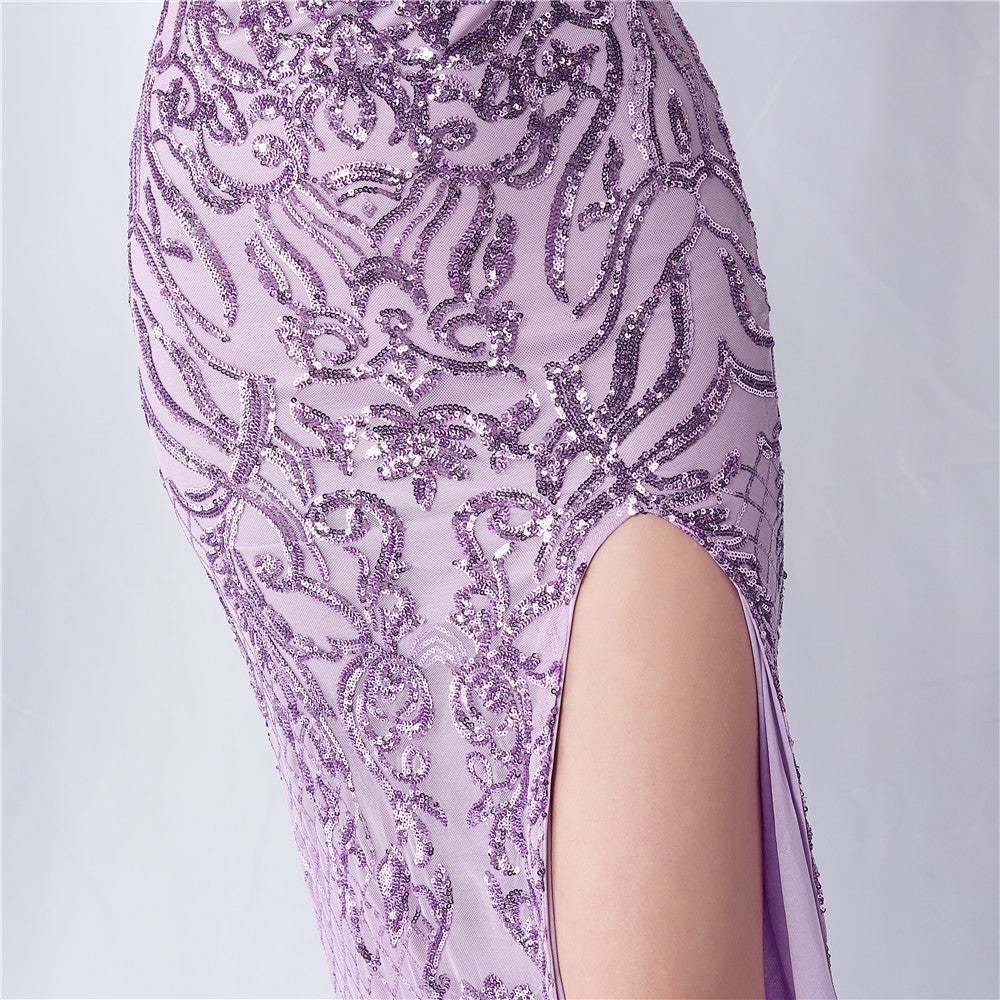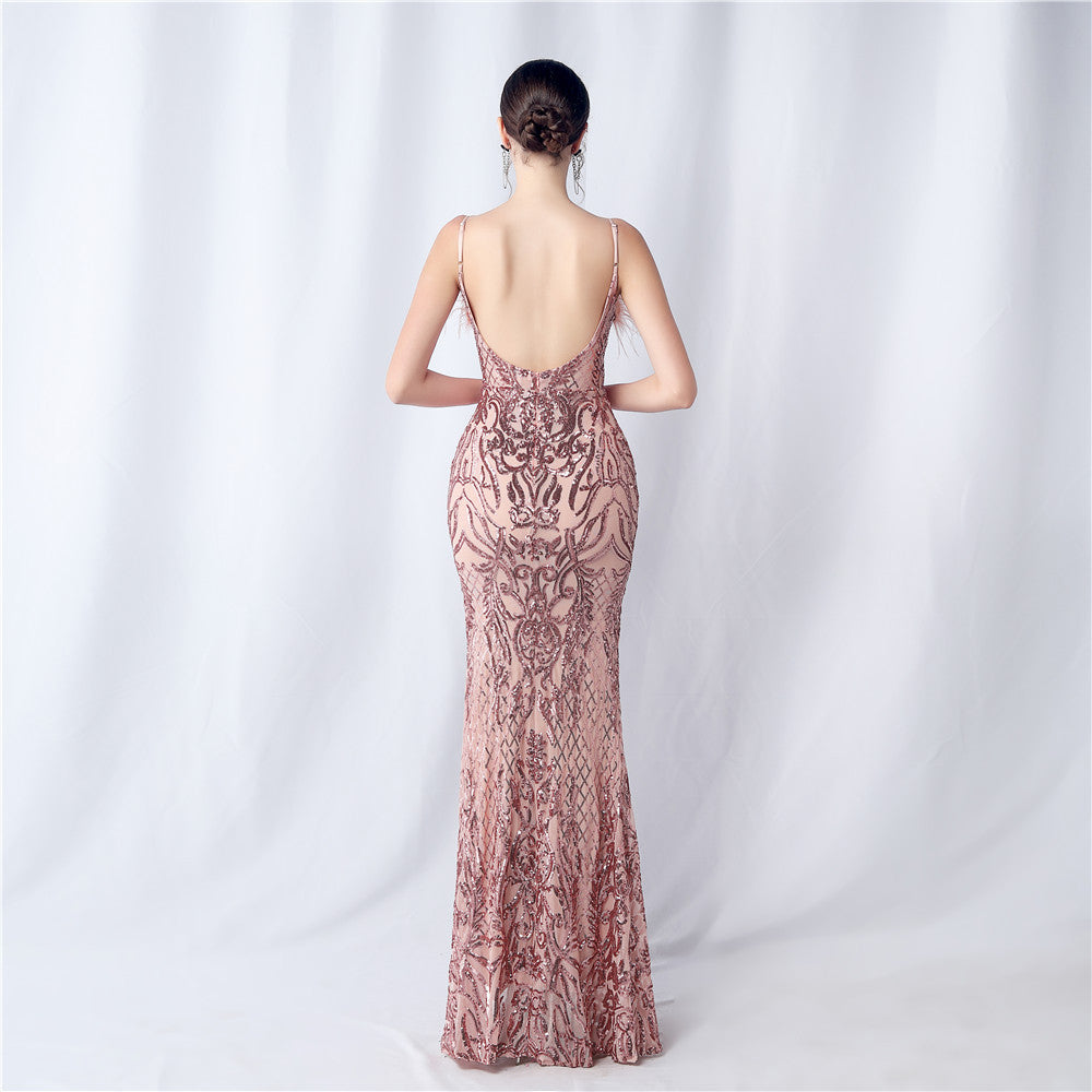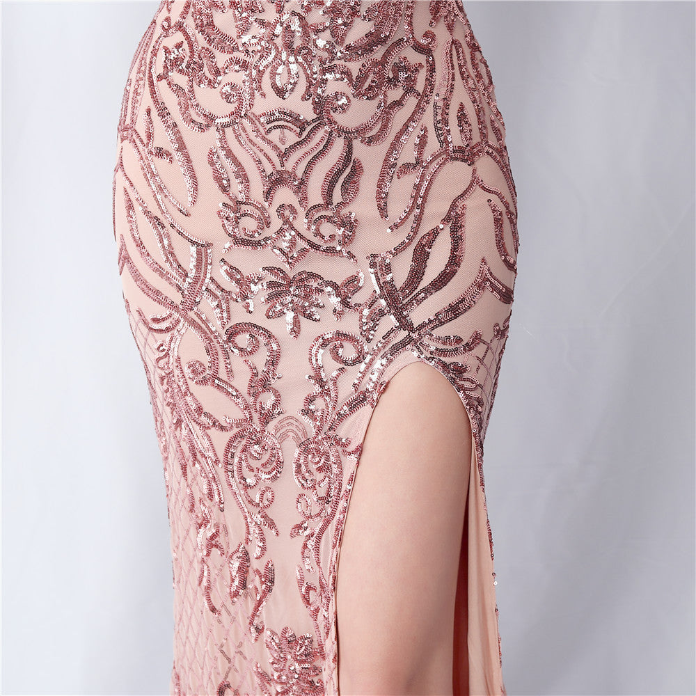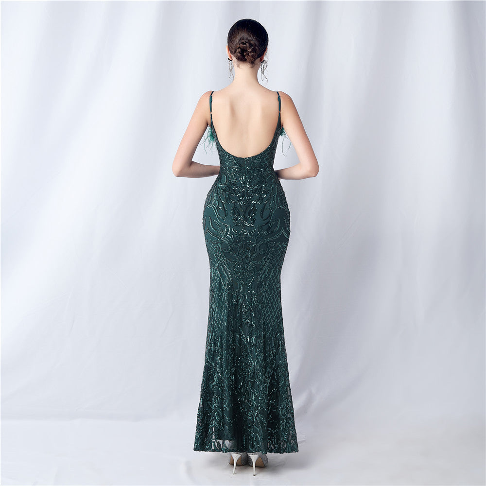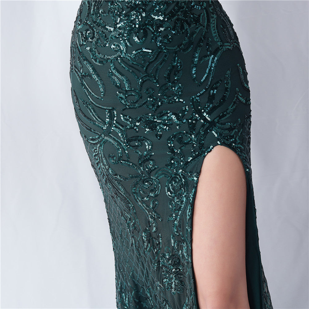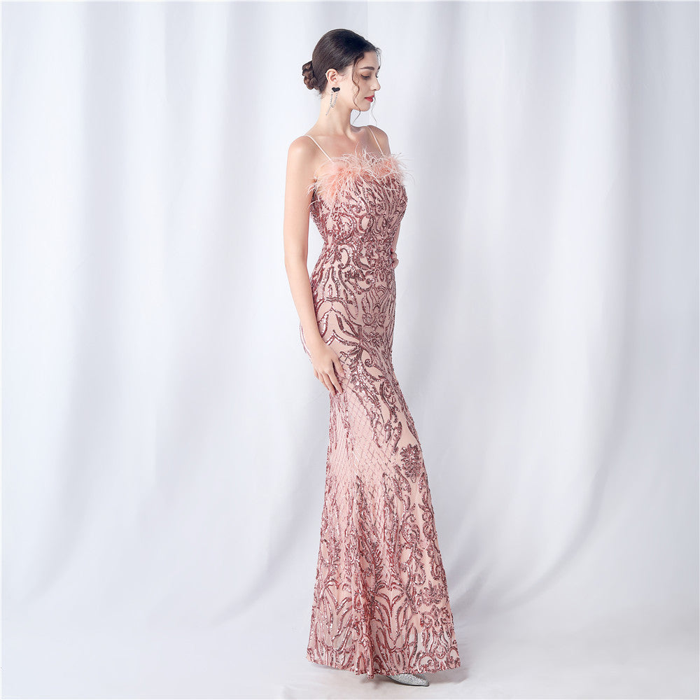 A sequined split maxi dress with a slim silhouette. The spaghetti-strap neckline features feathered sequin embellishments at the split.