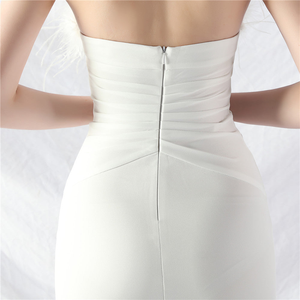 A strapless maxi with a slim, bodycon silhouette and a dramatic split. Clean lines and a solid polyester finish define its refined look.