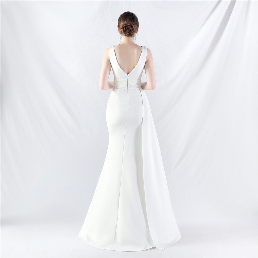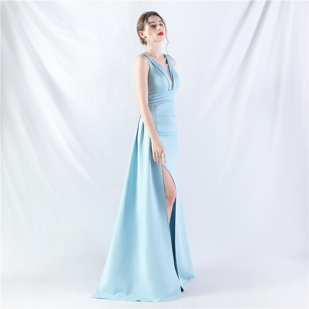A maxi dress with a sleek, floor-skimming silhouette. Lace and fishnet detailing pair with a front split and a concealed zipper.