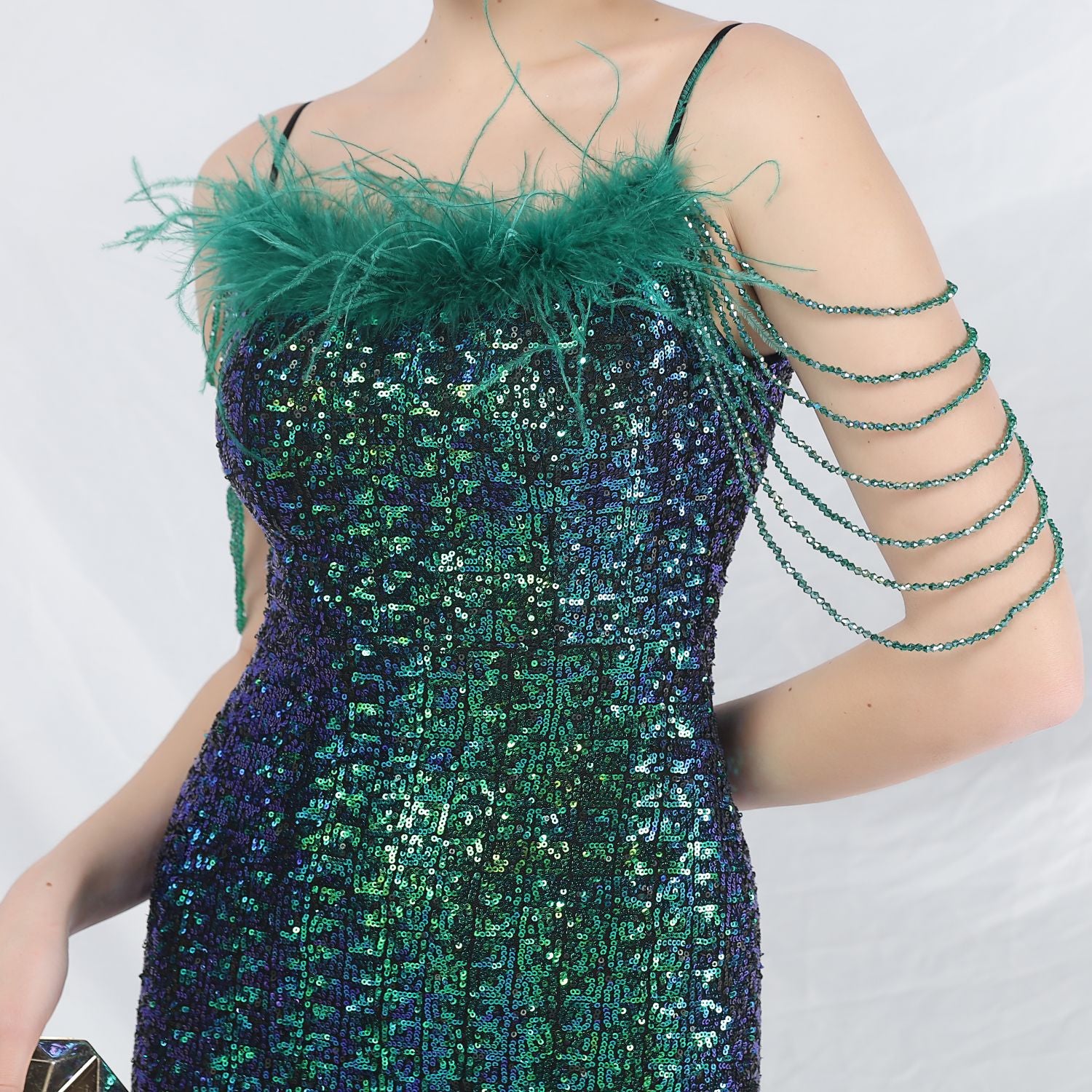 A slim, streamlined silhouette defines this maxi. Spaghetti-strap neckline and feathered sequin embellishment complete the look.