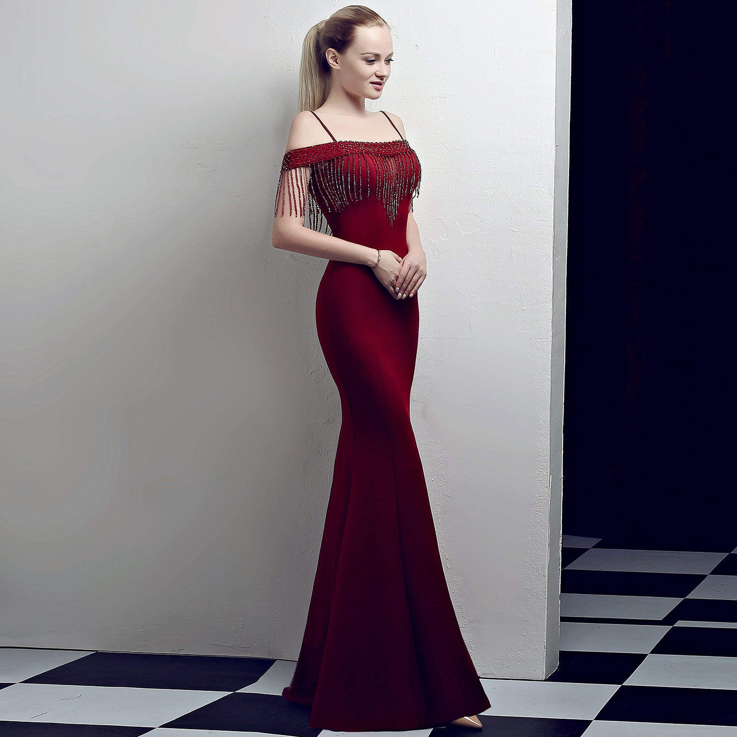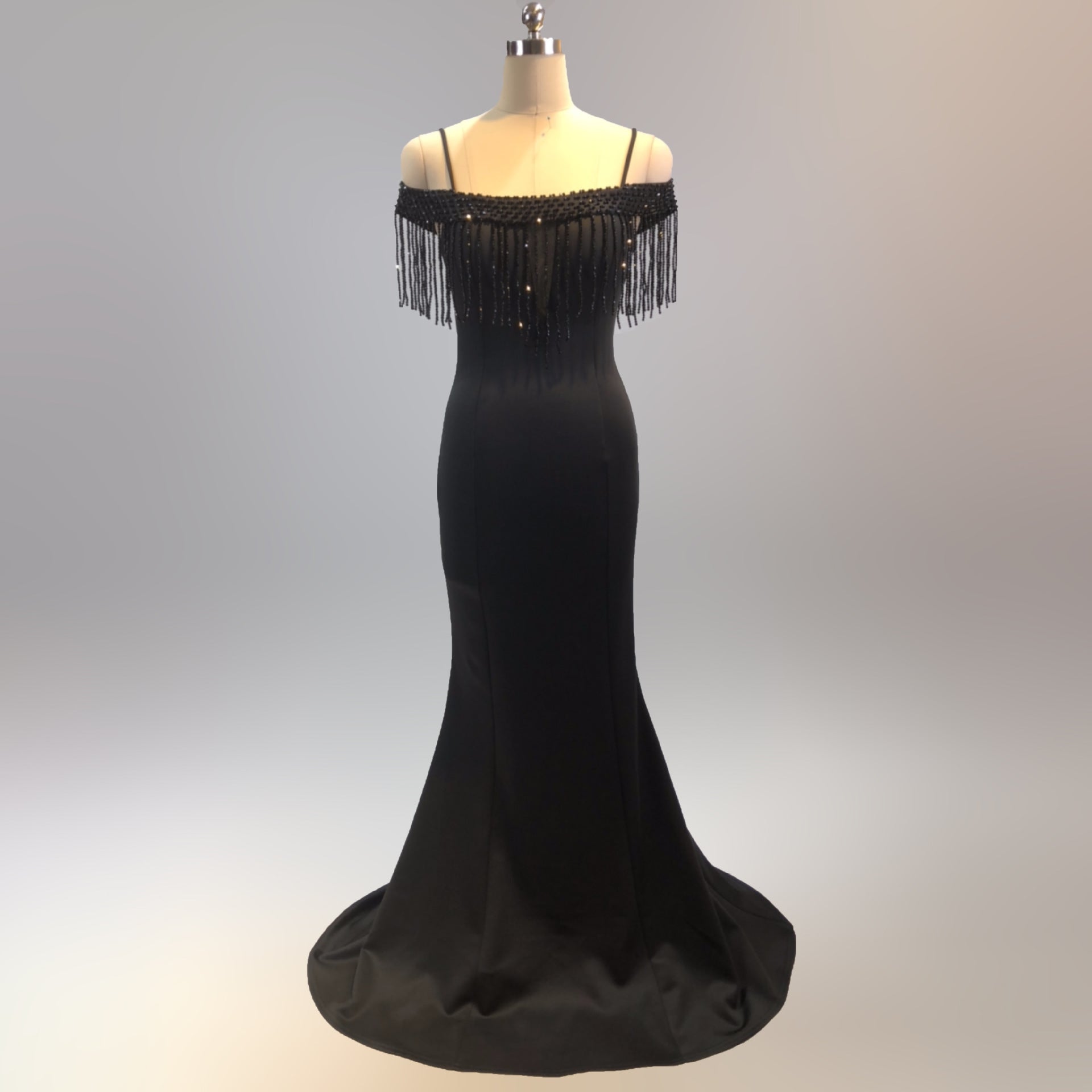 A sleek fishtail maxi with a slim silhouette. Spaghetti-strap neckline, fringe detailing, and a hidden zipper complete the solid polyester silhouette.