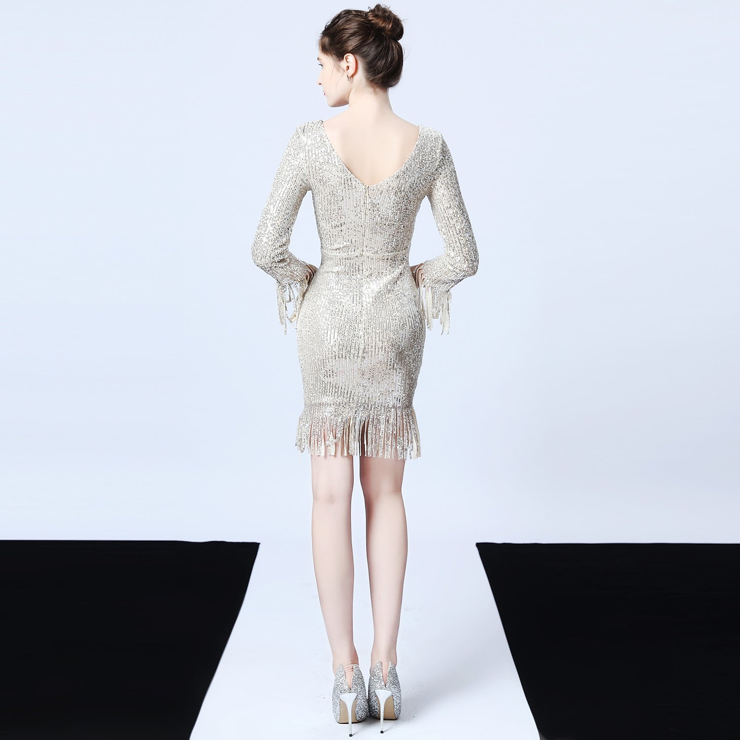 A sleek bodycon dress with a fishtail hem. A V-neckline and fringe with sequin embellishments define the look.