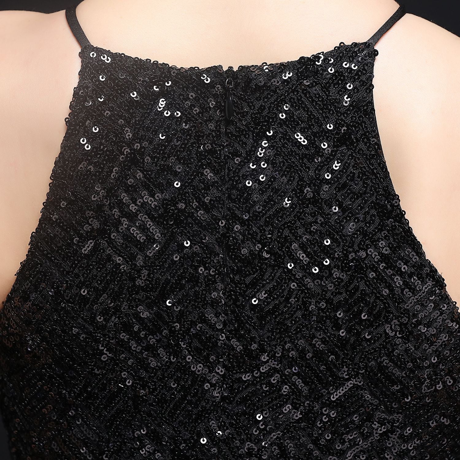 The dress drapes smoothly over the body in sequin-covered polyester; dry clean only.