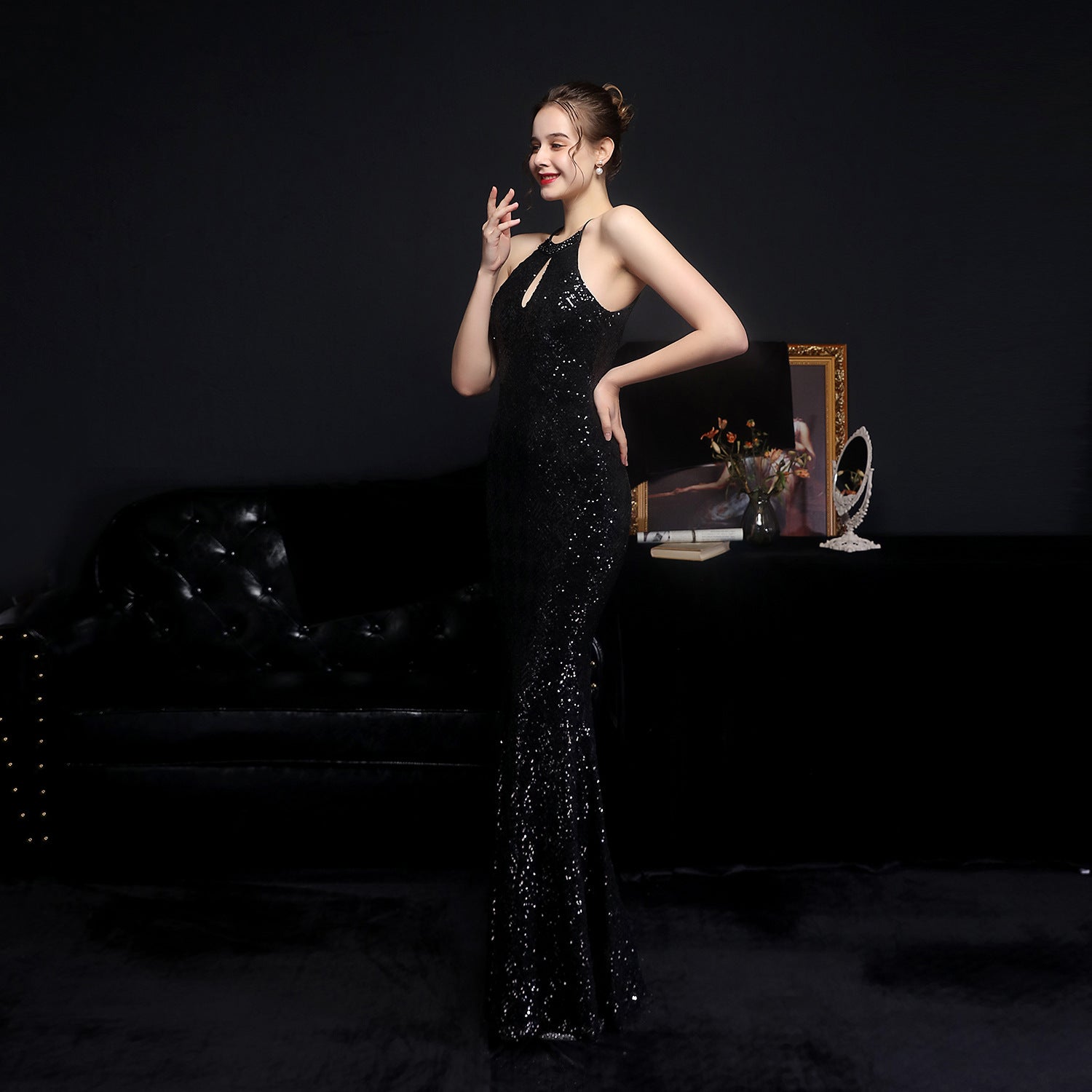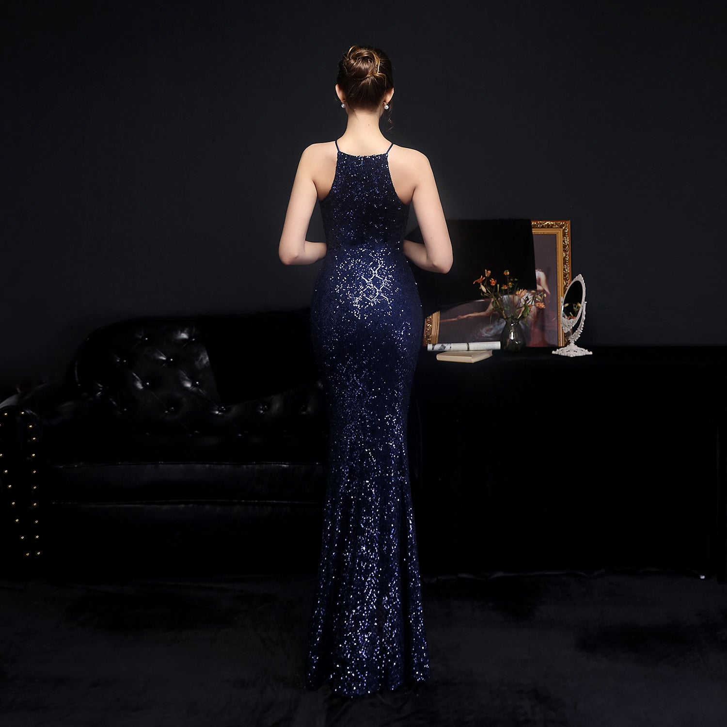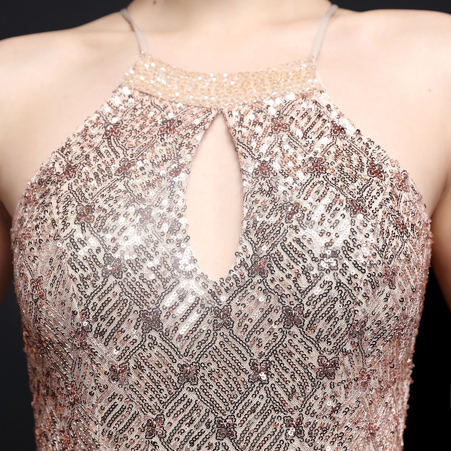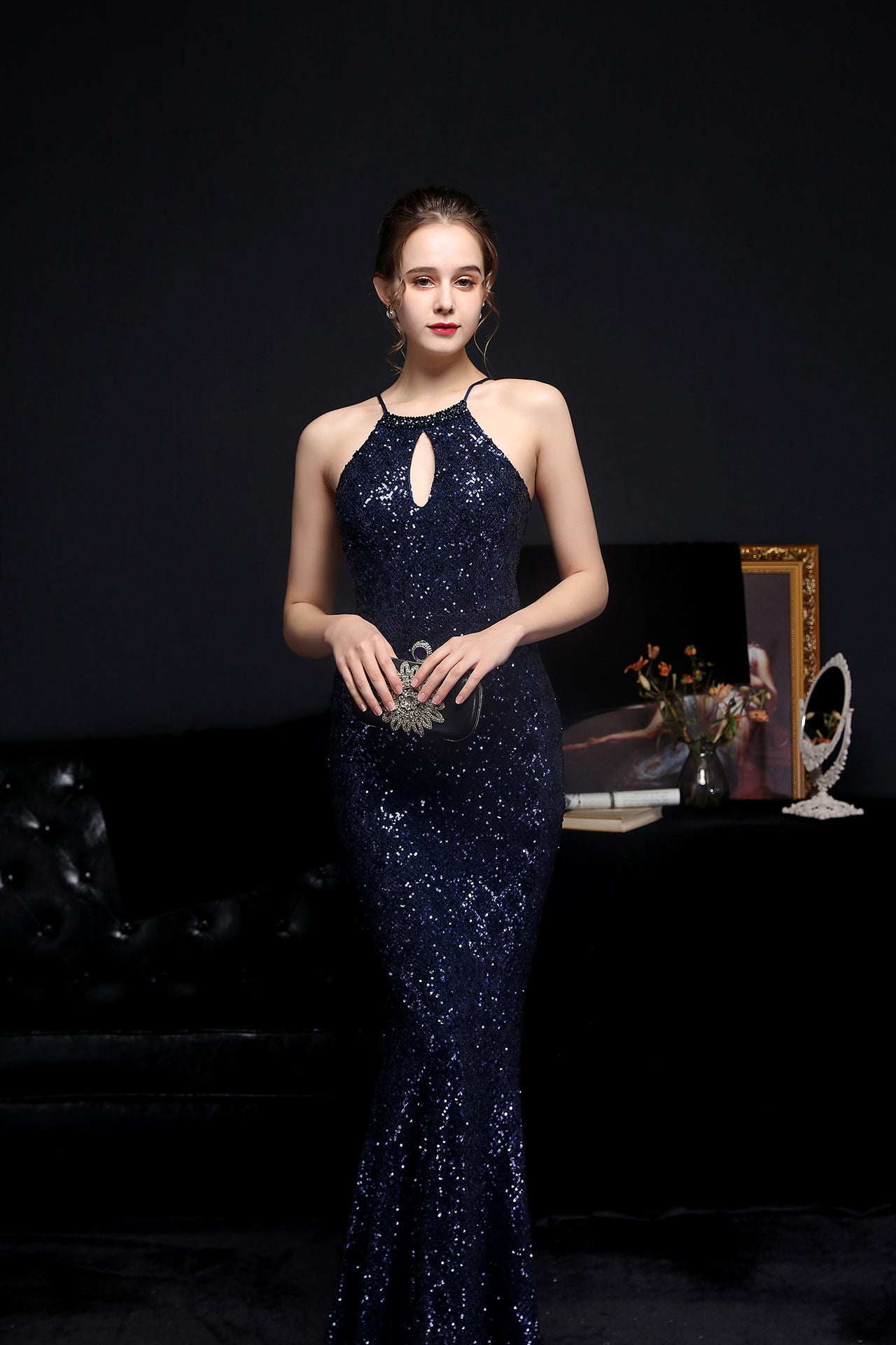 A halter-neck maxi with a slim, body-con silhouette. Cutouts, rhinestones and sequins decorate the bodice, finished with a fishtail hem.