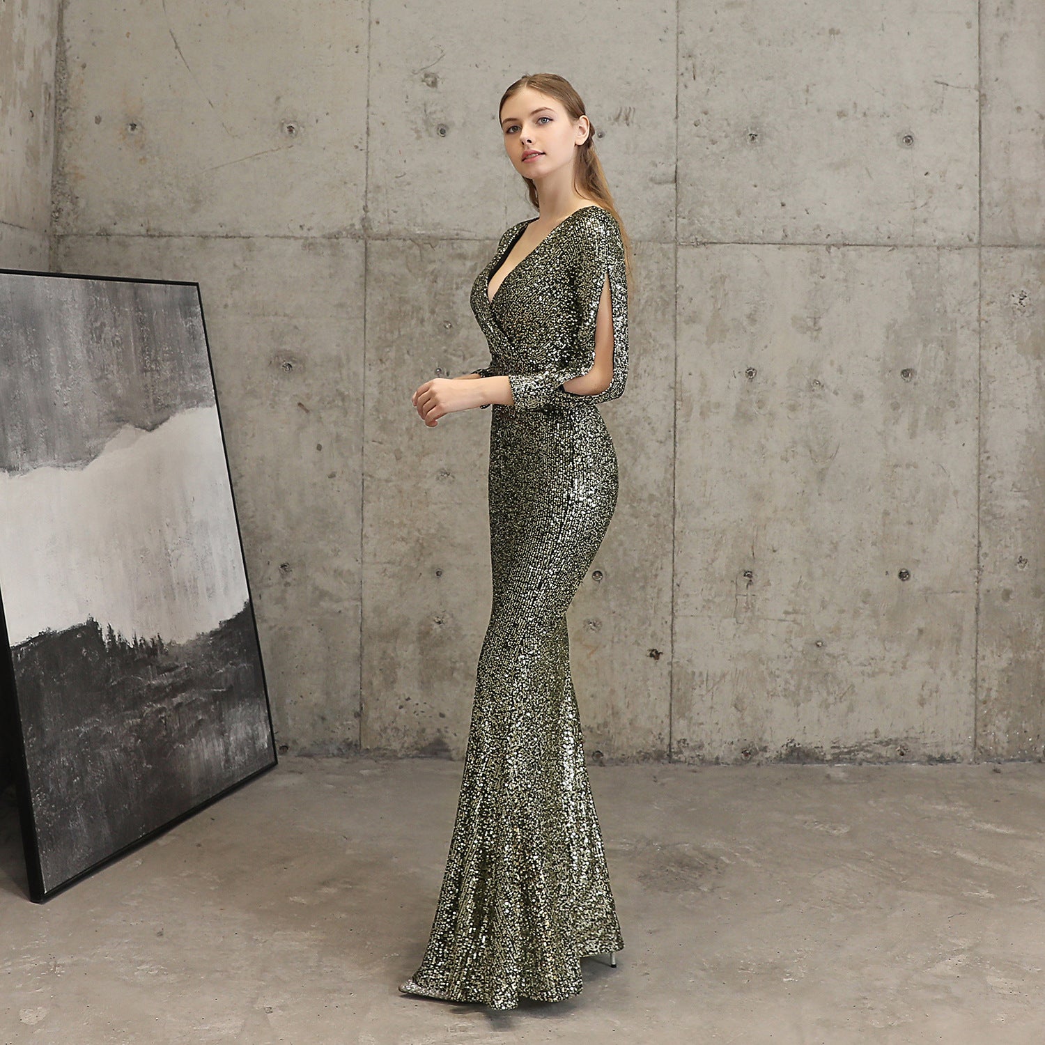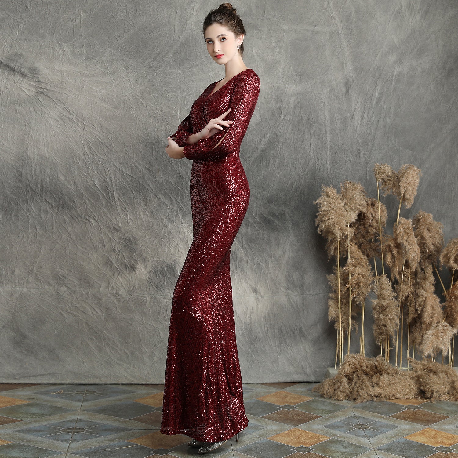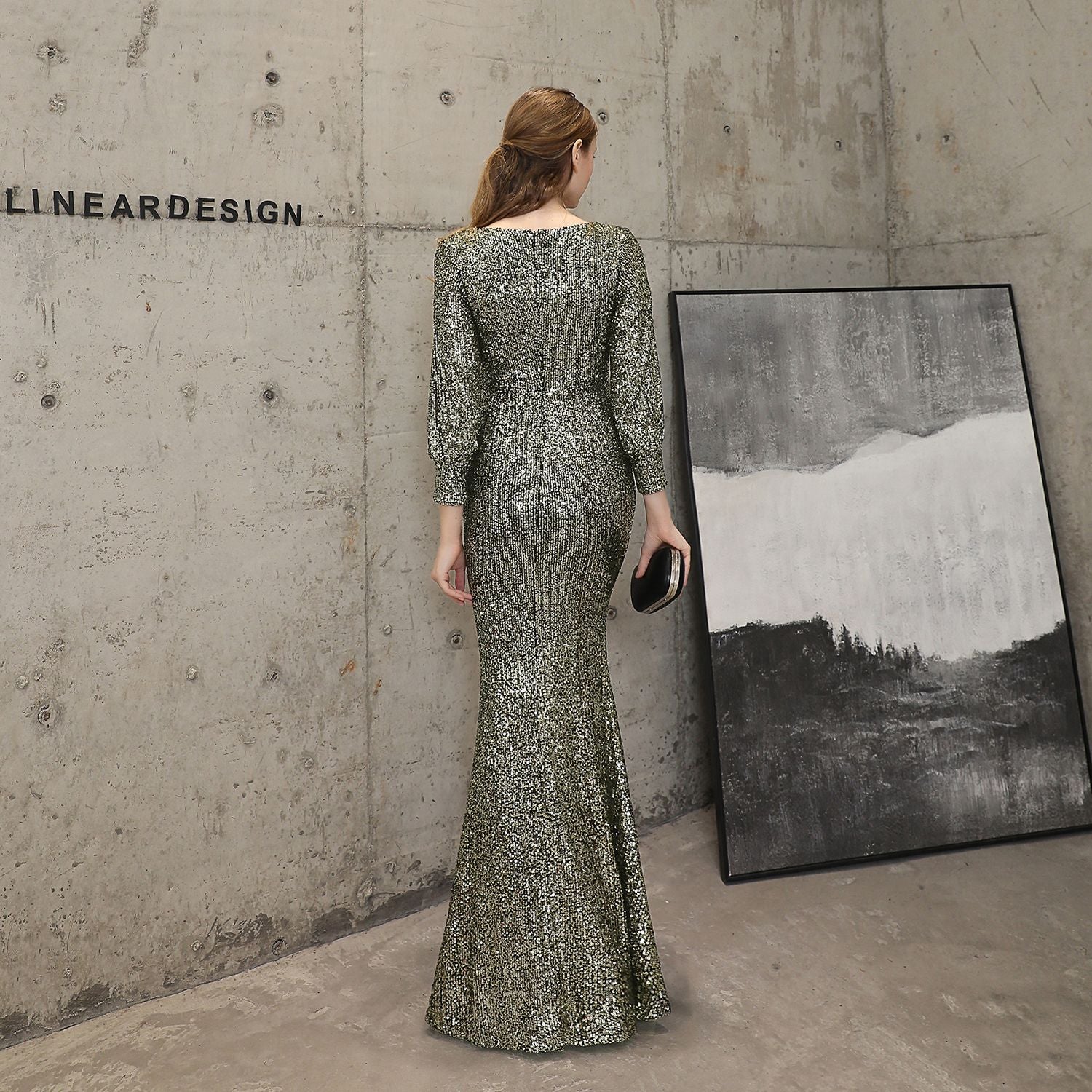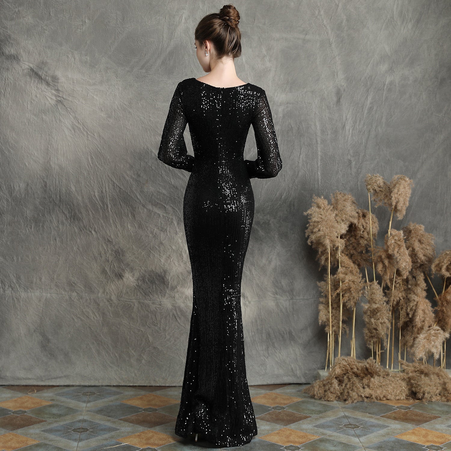 The sequined fishtail maxi dress offers a slim, elegant silhouette. A V neck and long sleeves frame a subtle cutout with sequins and a concealed zipper at the back.