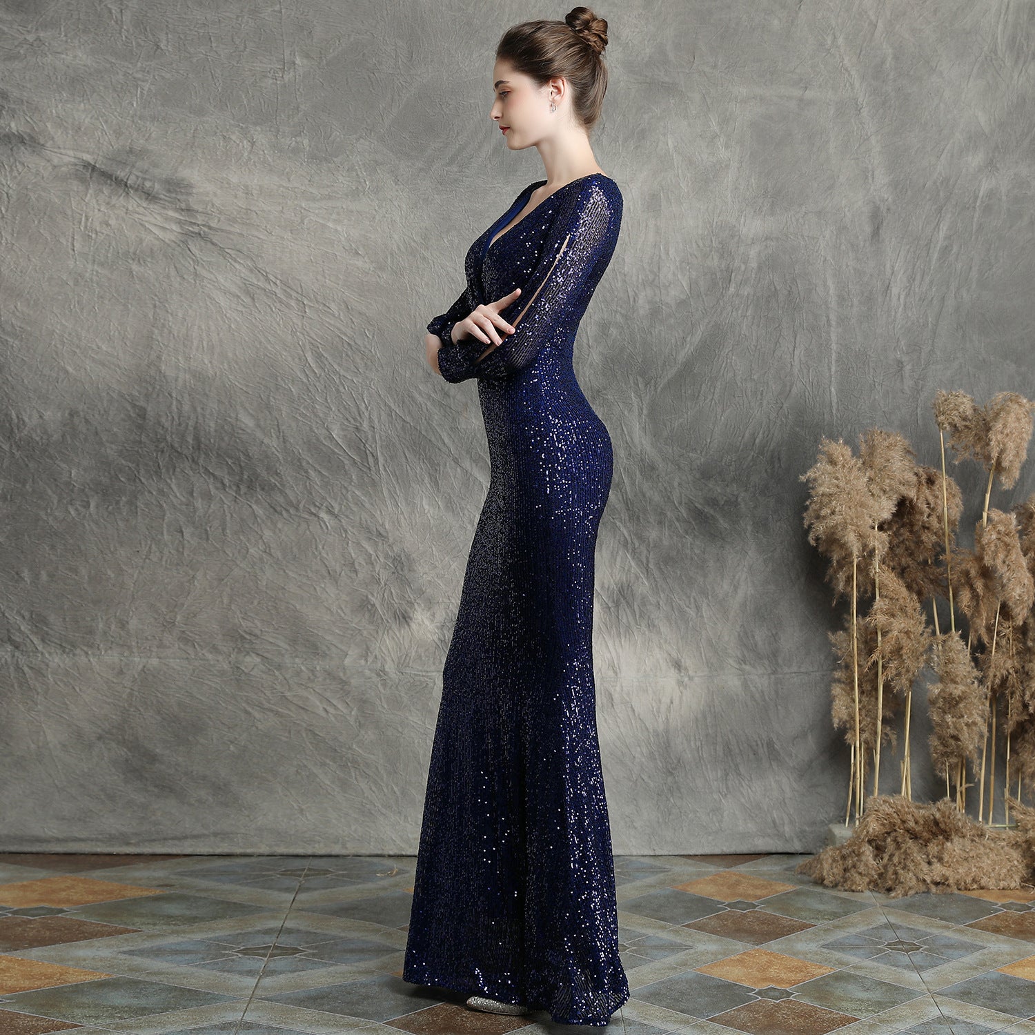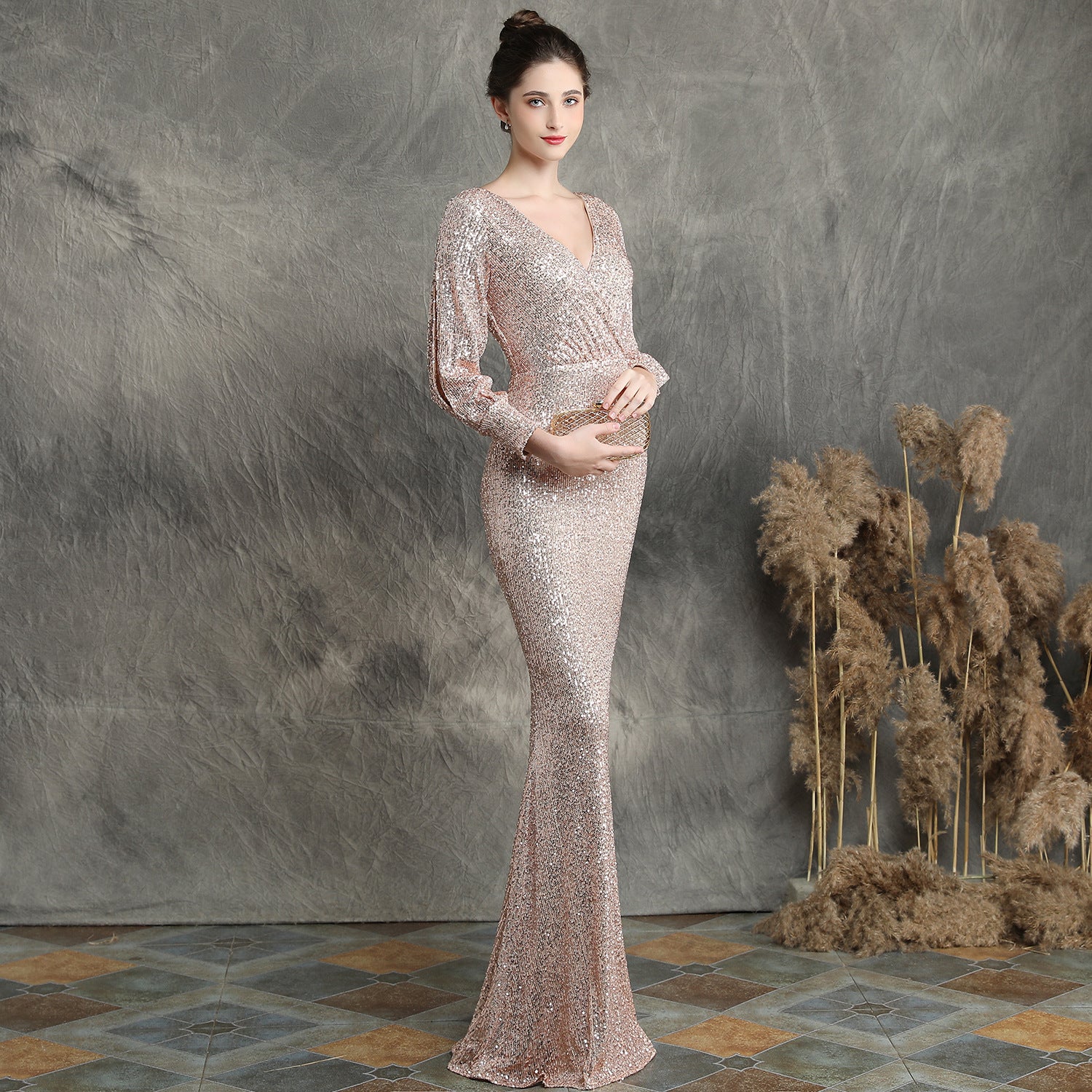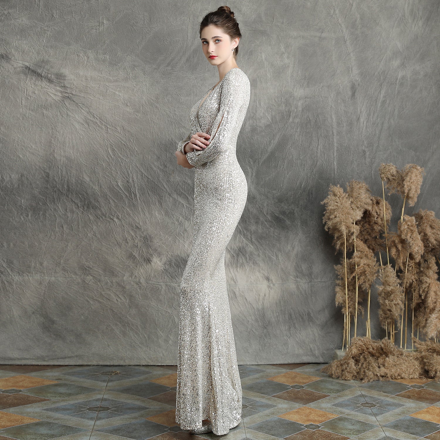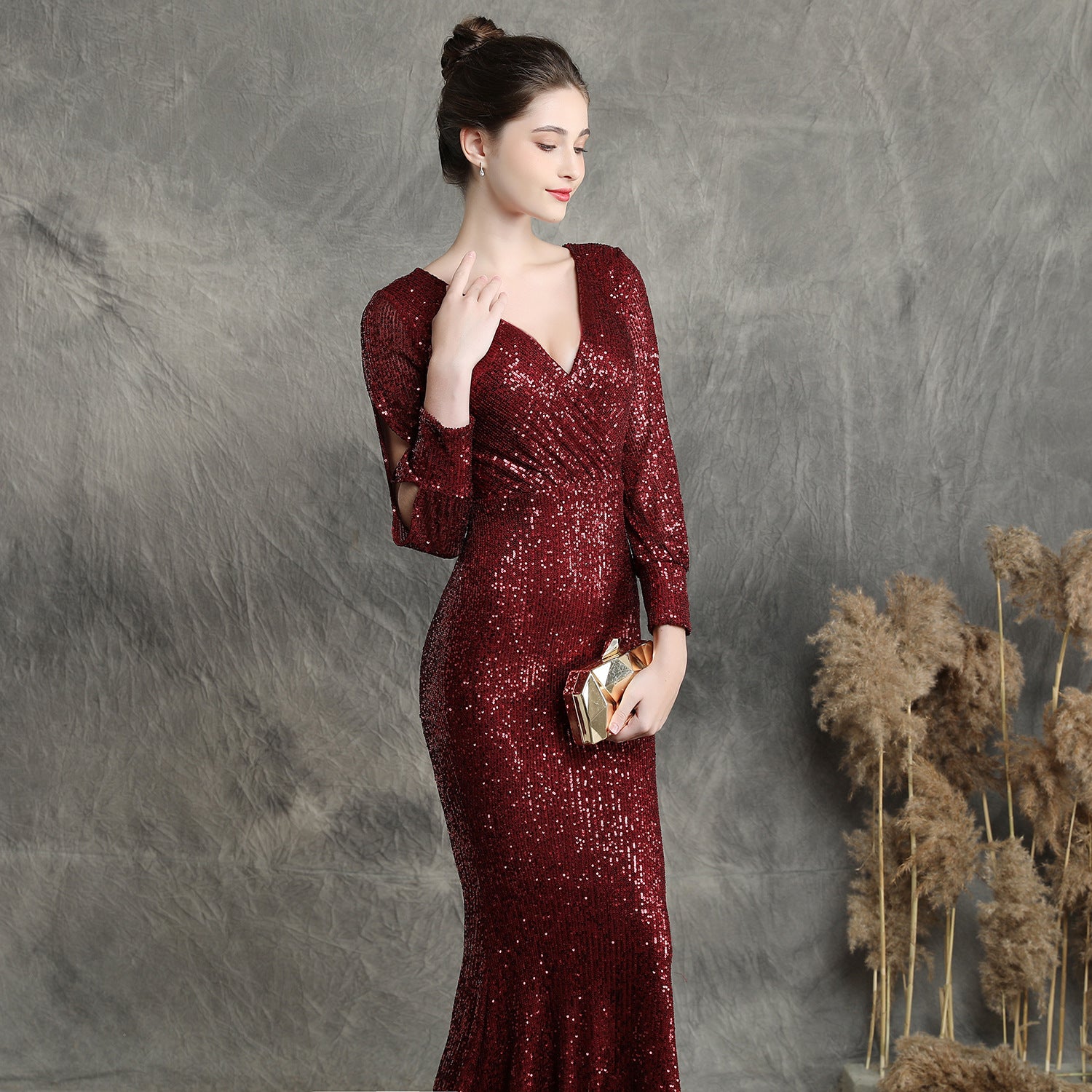 The sequined fishtail maxi dress offers a slim, elegant silhouette. A V neck and long sleeves frame a subtle cutout with sequins and a concealed zipper at the back.