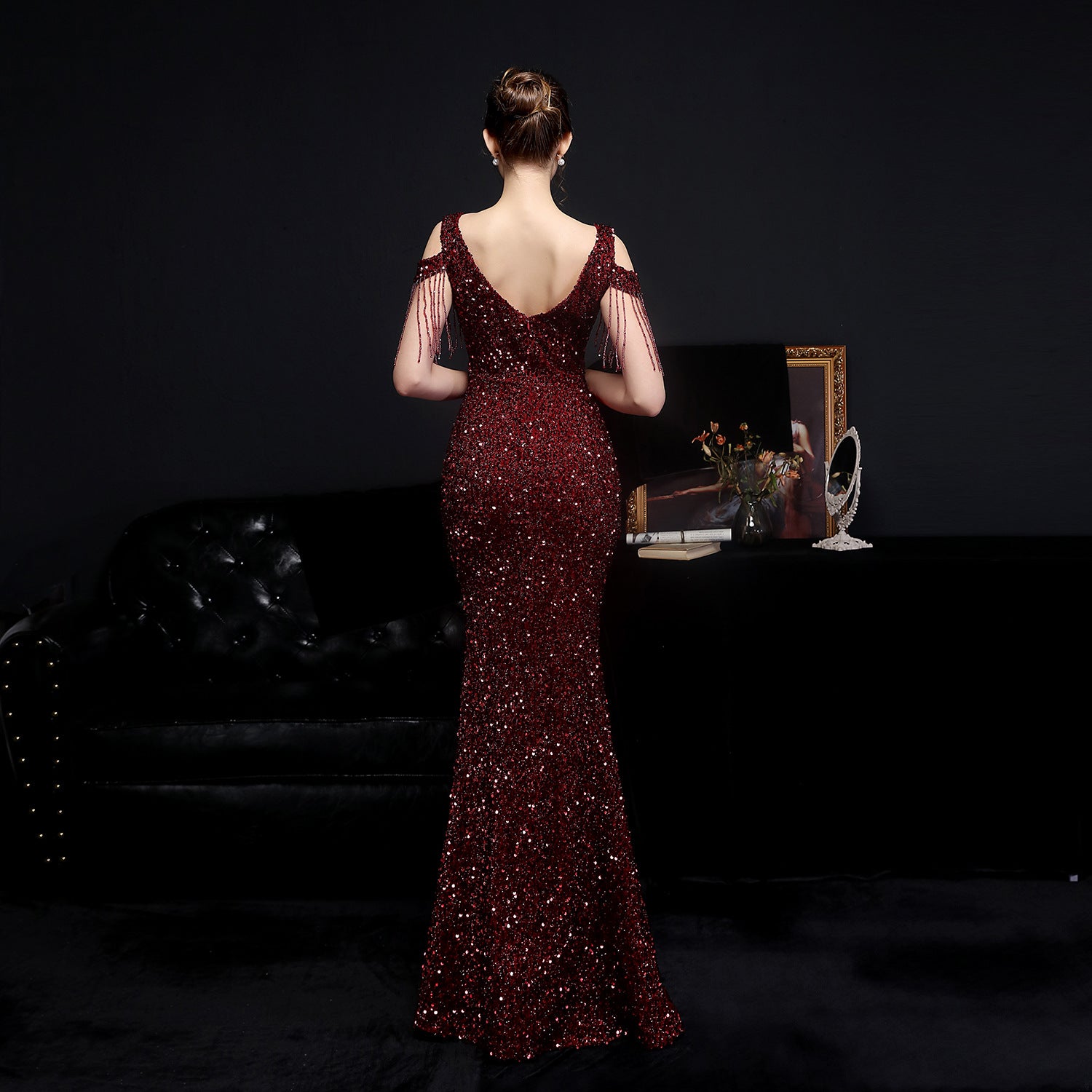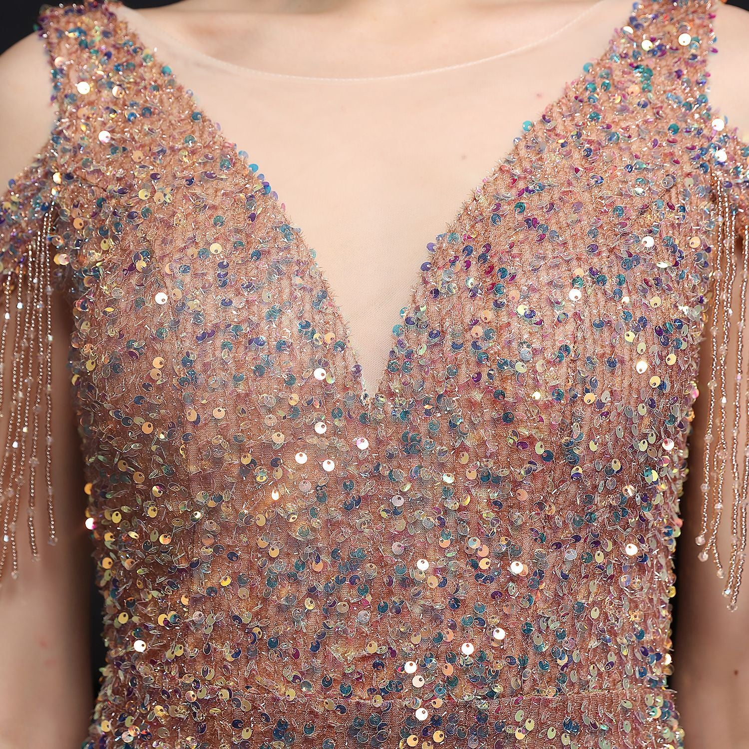 A sleek sequin maxi with a slim silhouette. The V-neckline, fishtail hem, and subtle cutouts, fringe and lace and tulle detailing define its refined edge.