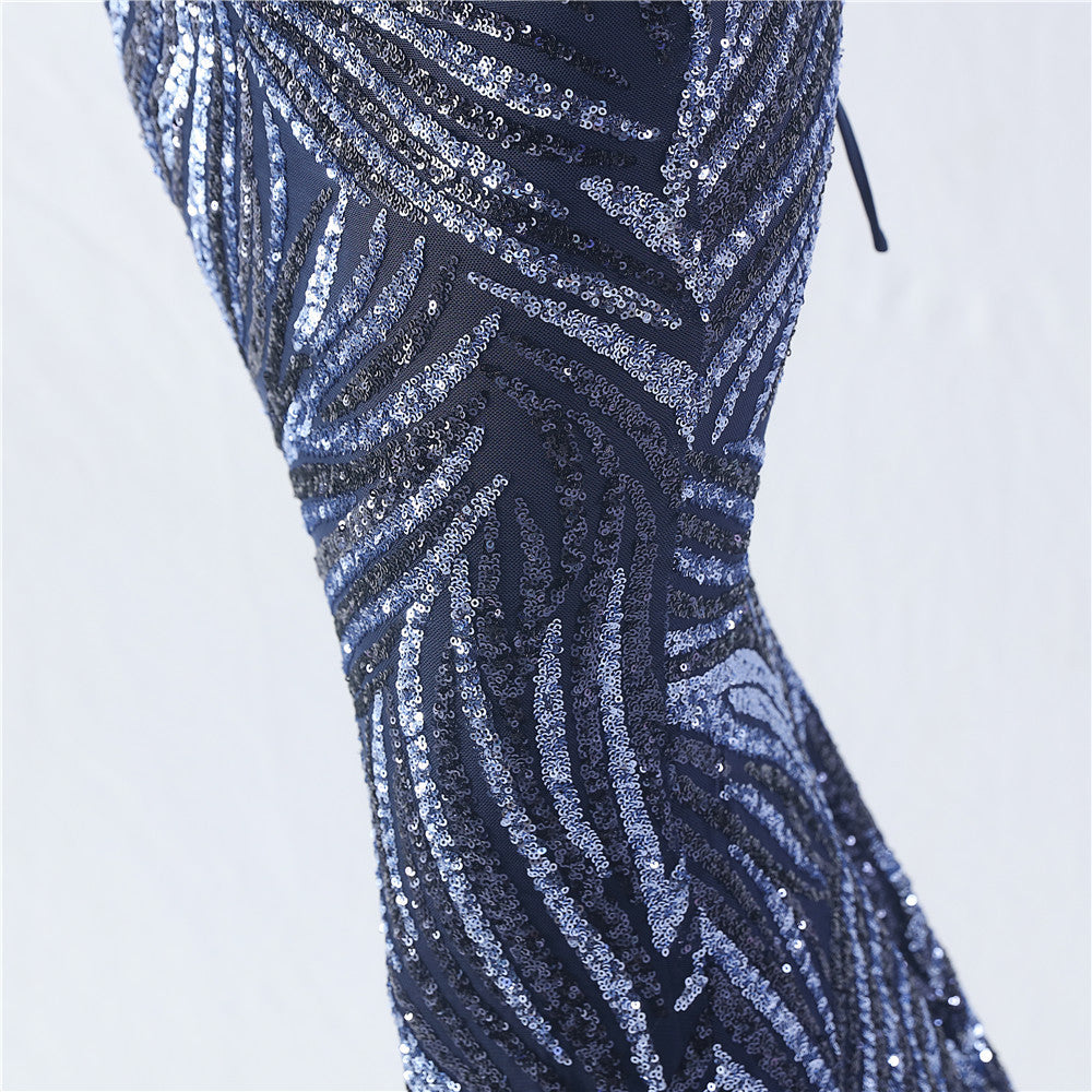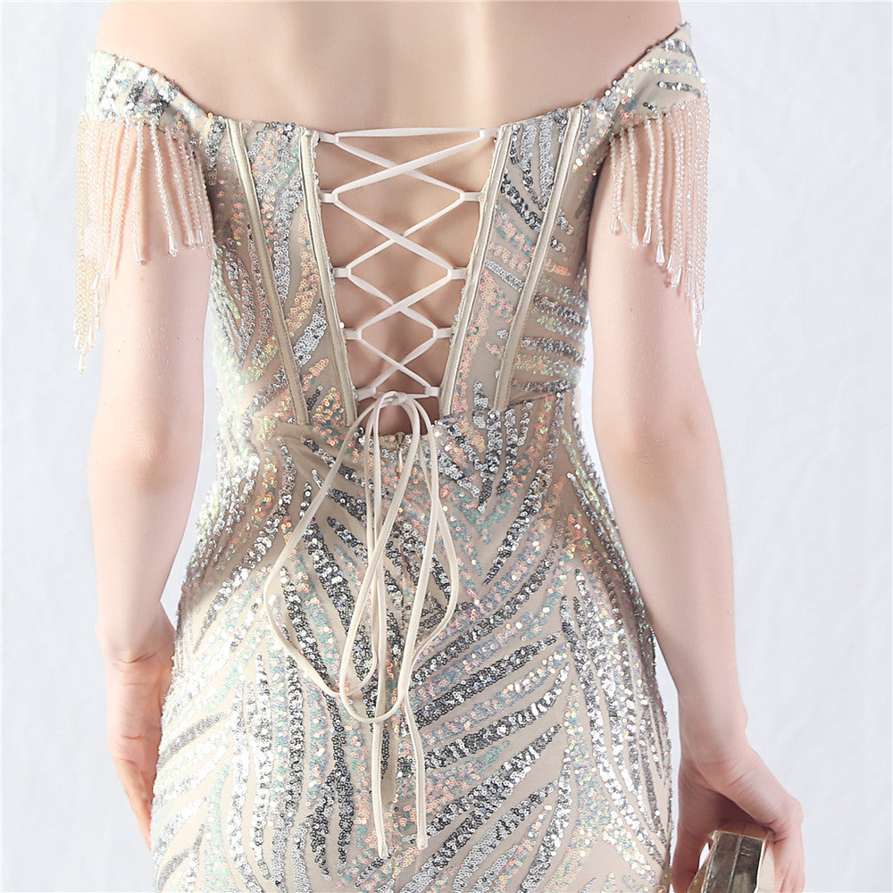 Strapless maxi with a slim, bodycon silhouette. Lace-up back details and sparkling sequins provide the focal embellishment.