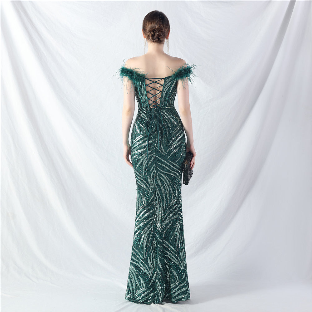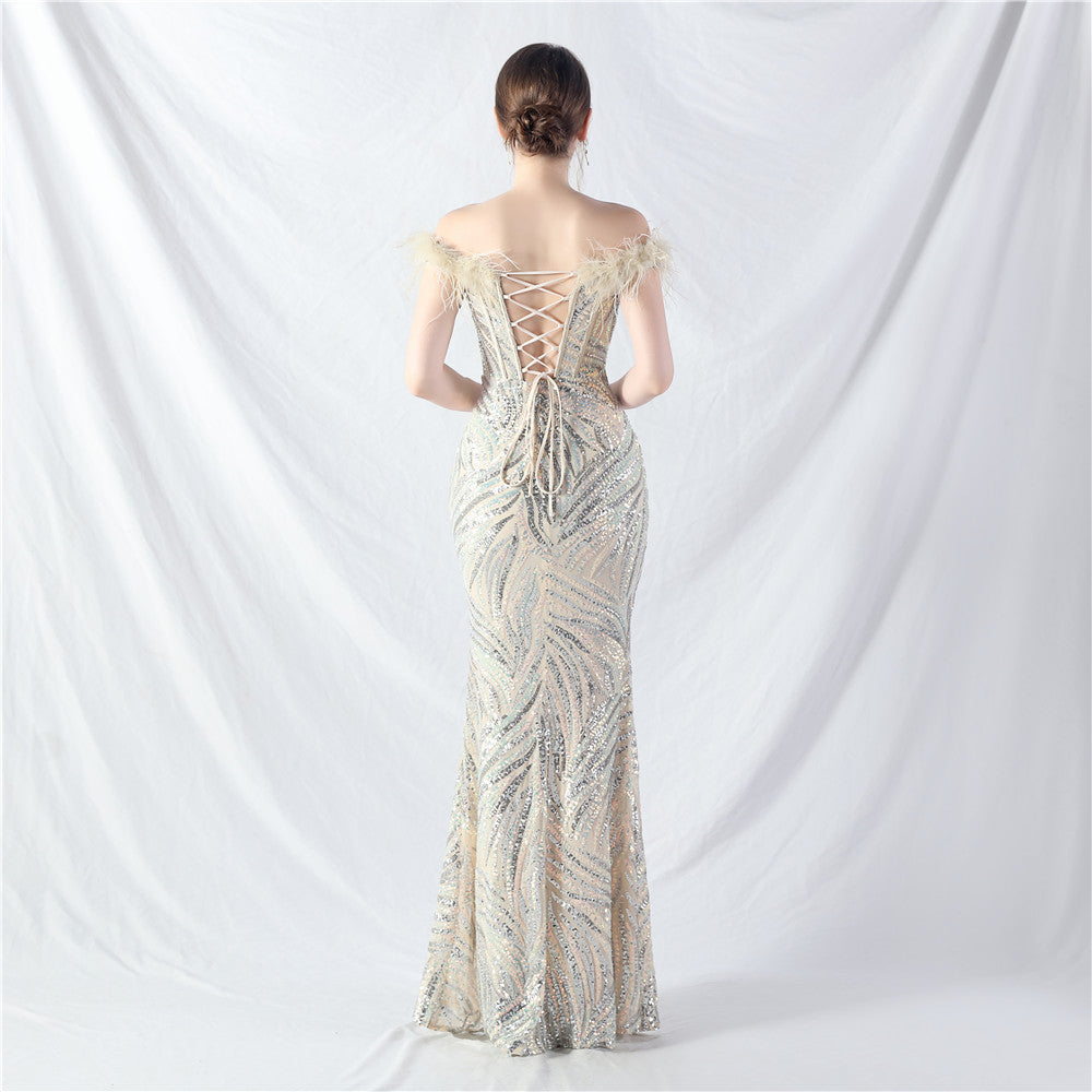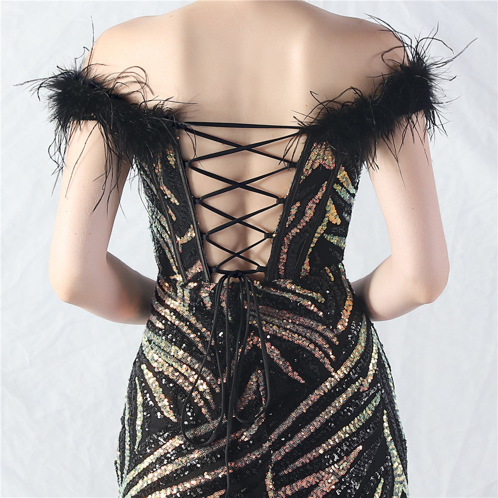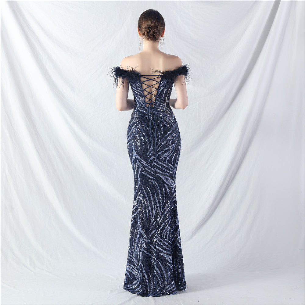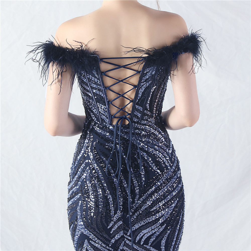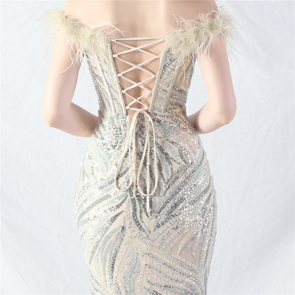An off-shoulder, backless maxi with a slim silhouette. Sequins and feather accents pair with lace-up detailing and a discreet zipper.