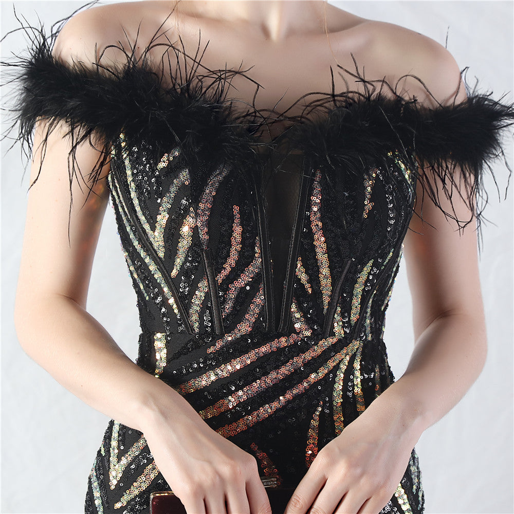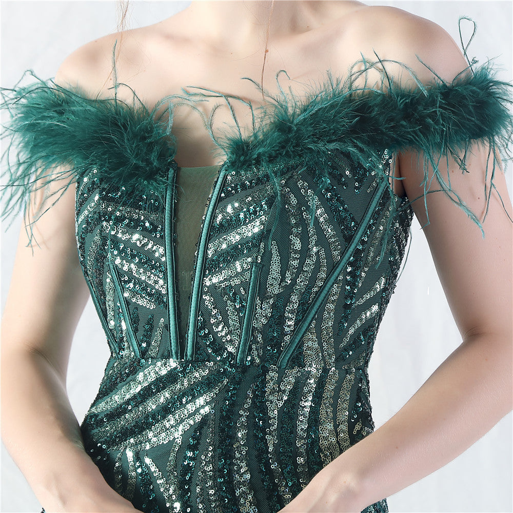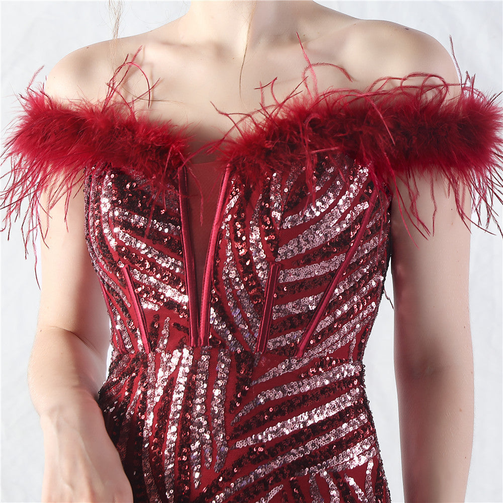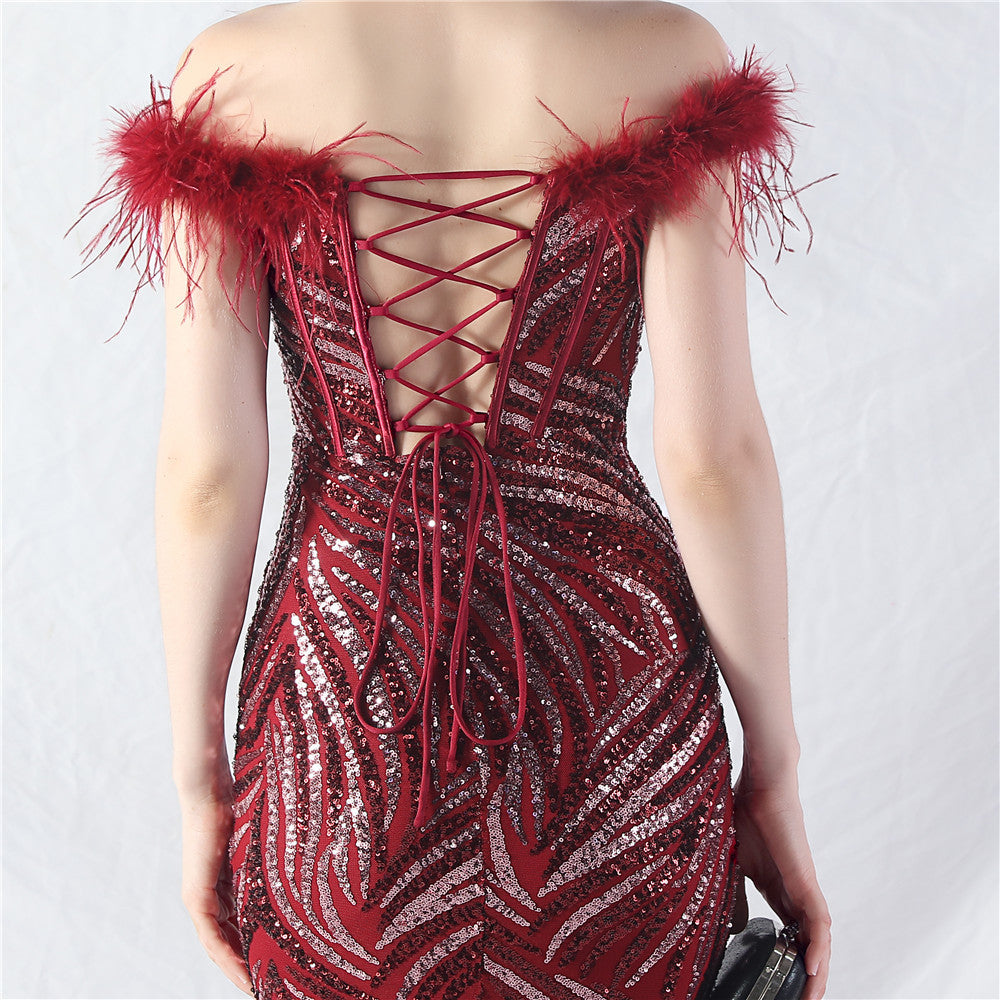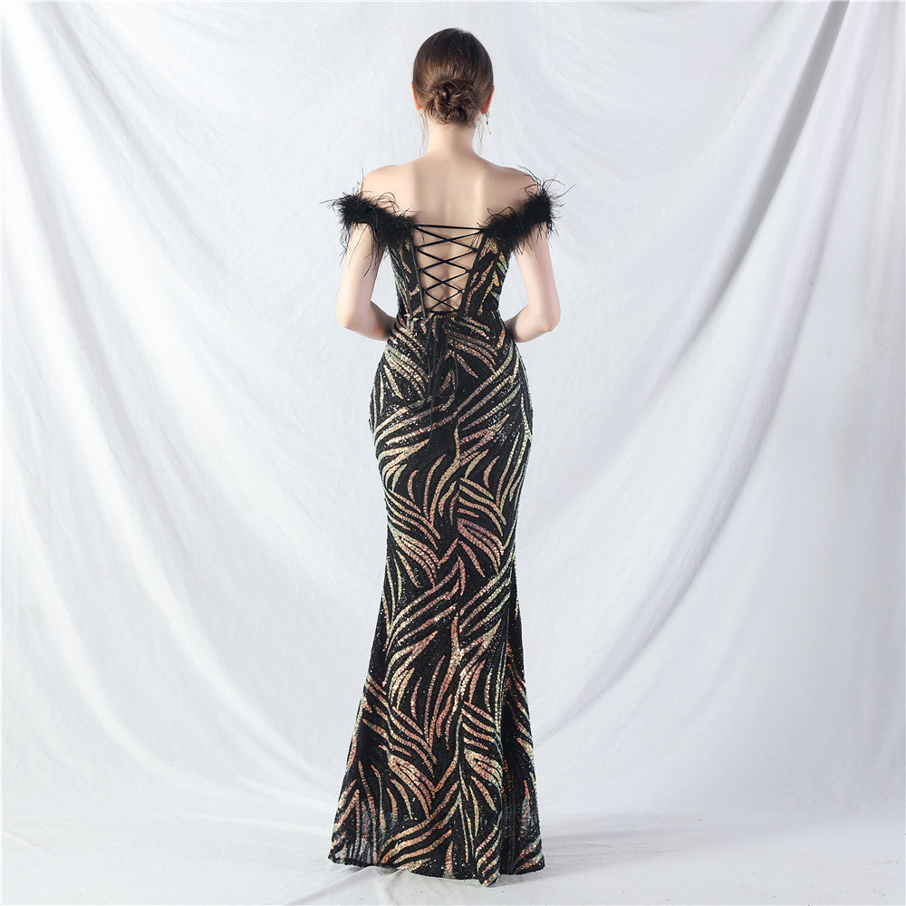 An off-shoulder, backless maxi with a slim silhouette. Sequins and feather accents pair with lace-up detailing and a discreet zipper.