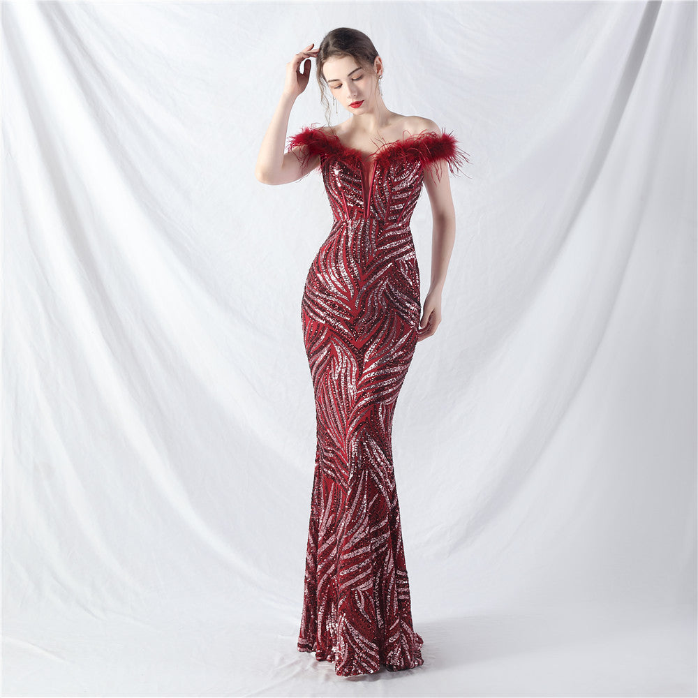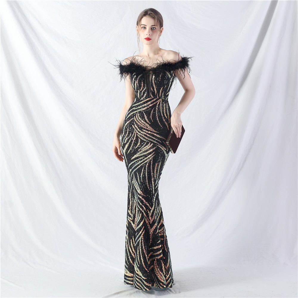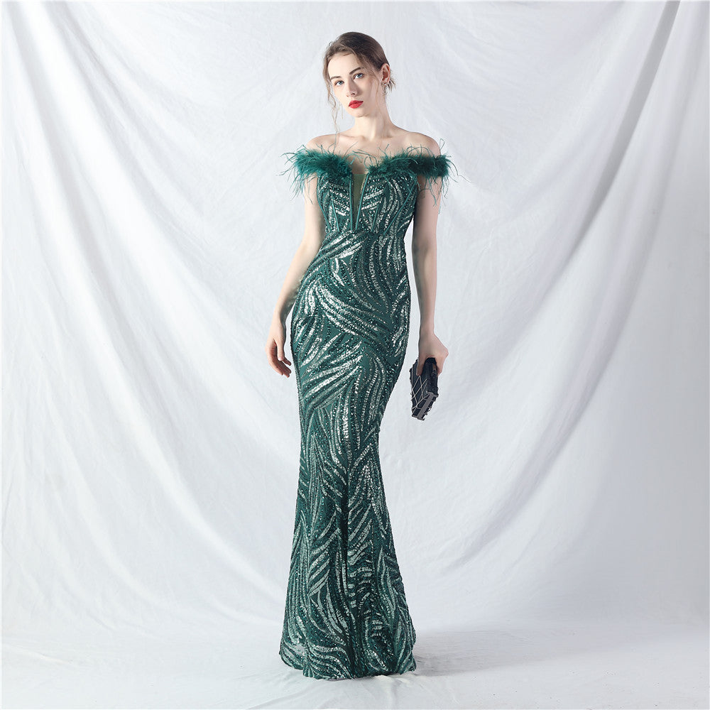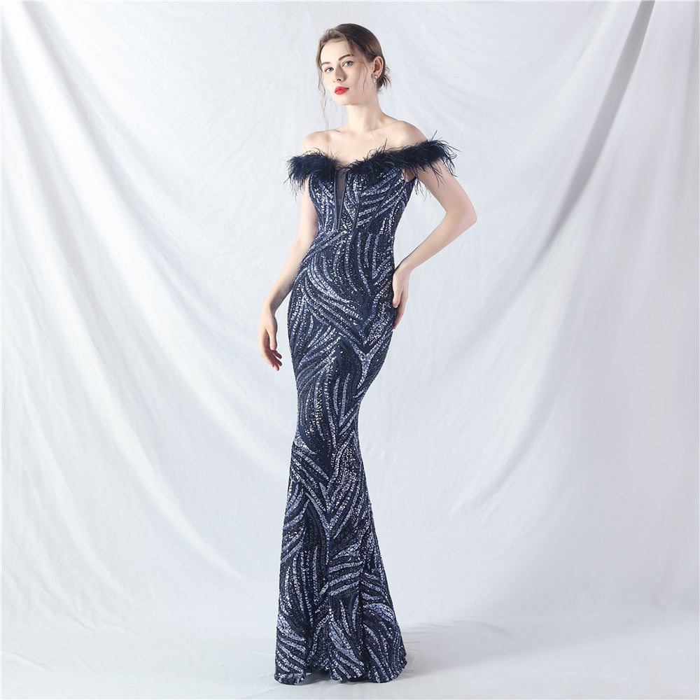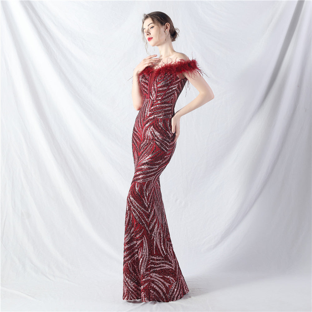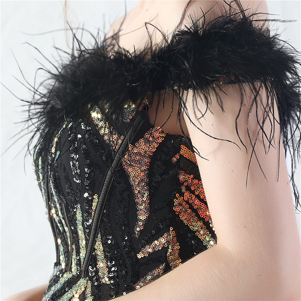 An off-shoulder, backless maxi with a slim silhouette. Sequins and feather accents pair with lace-up detailing and a discreet zipper.