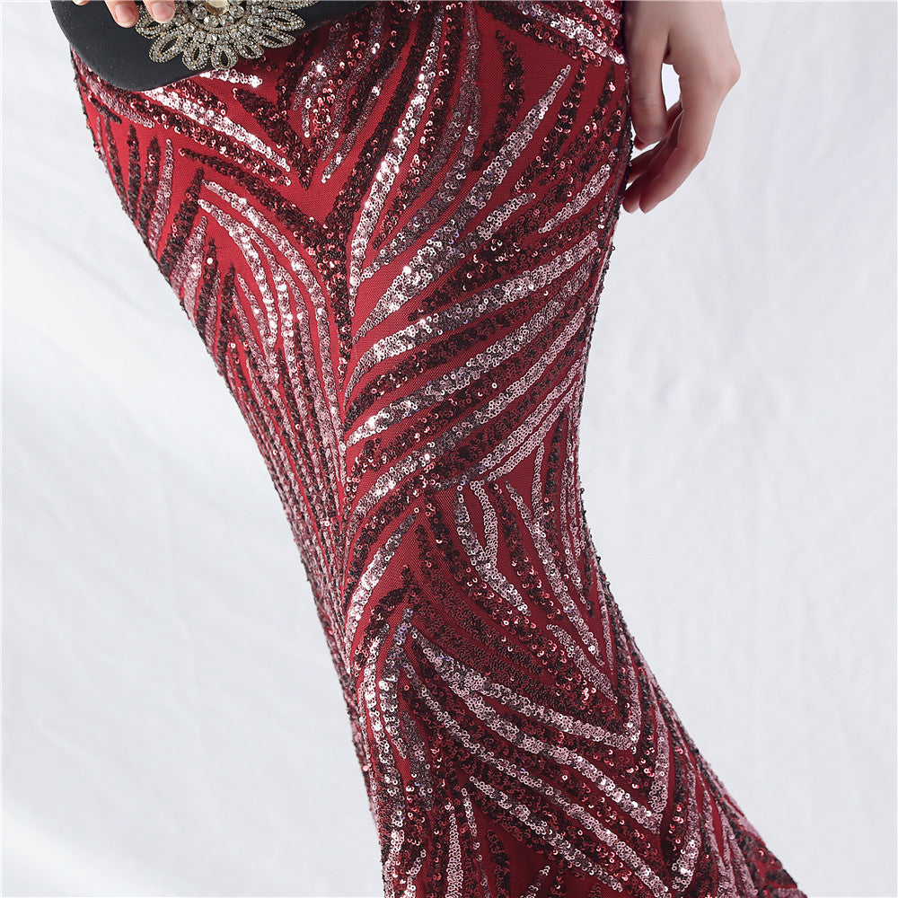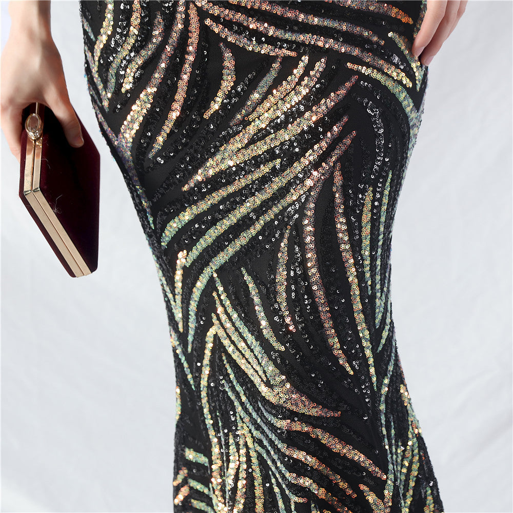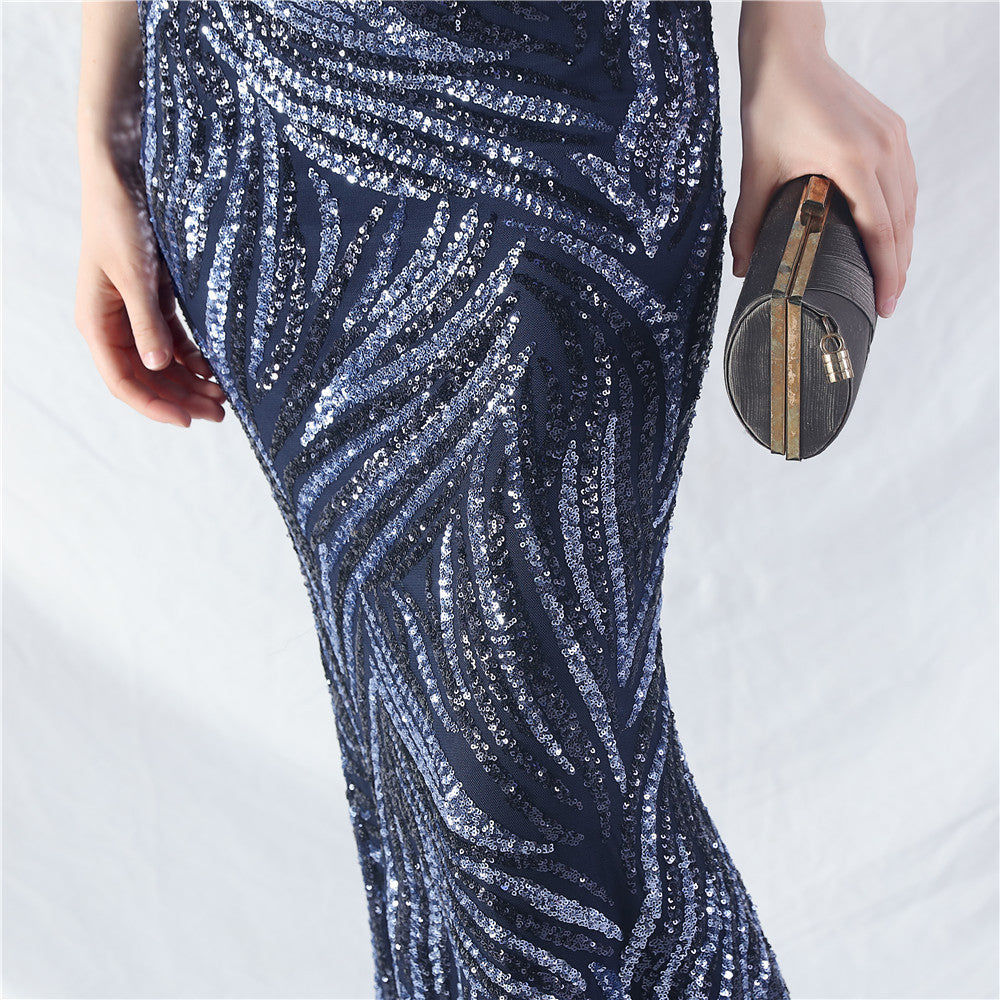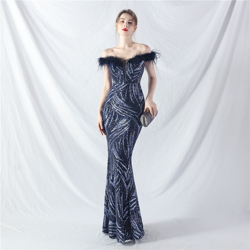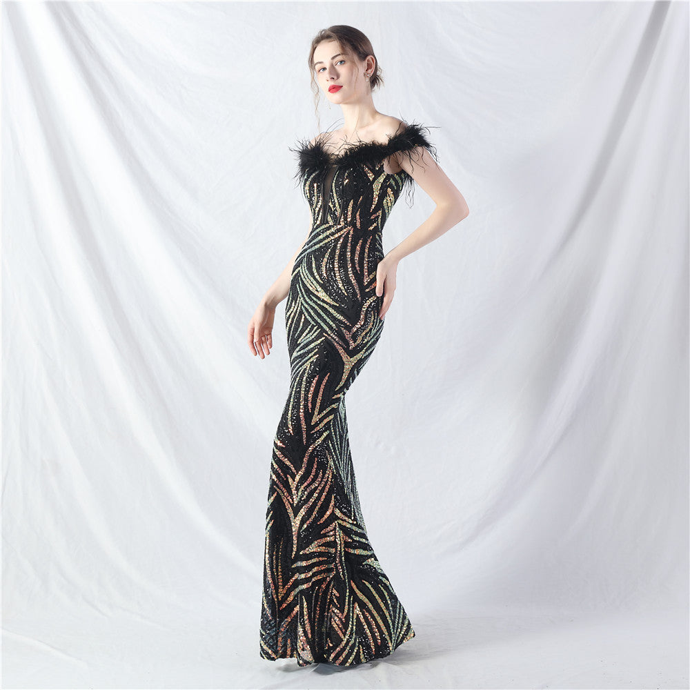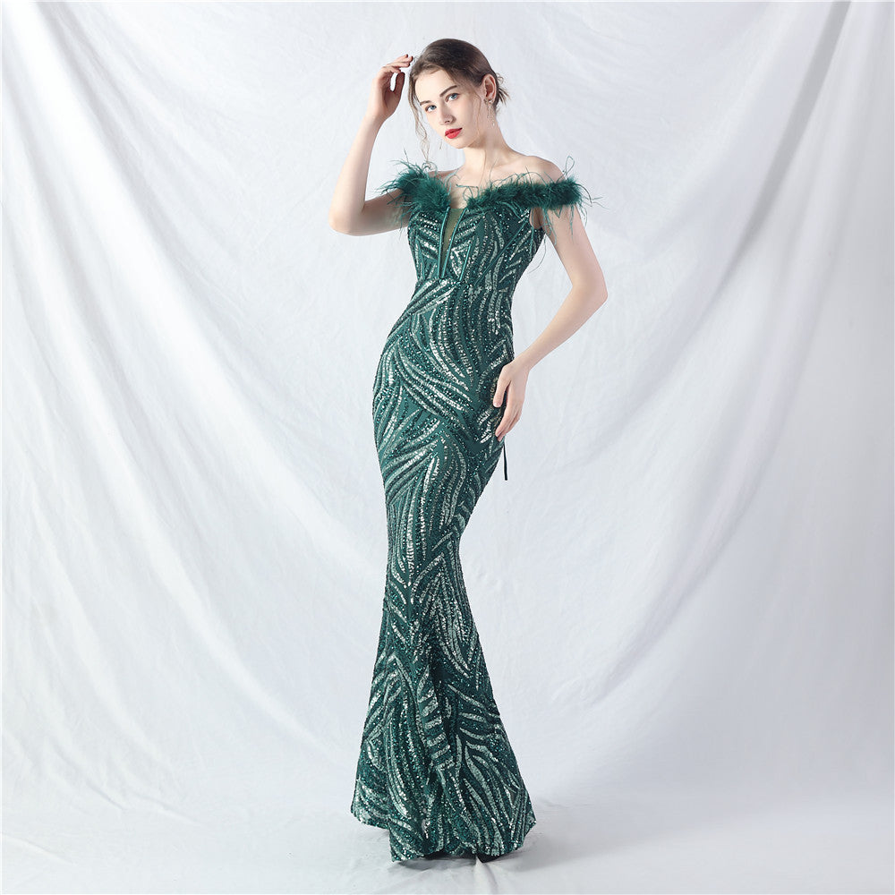 An off-shoulder, backless maxi with a slim silhouette. Sequins and feather accents pair with lace-up detailing and a discreet zipper.