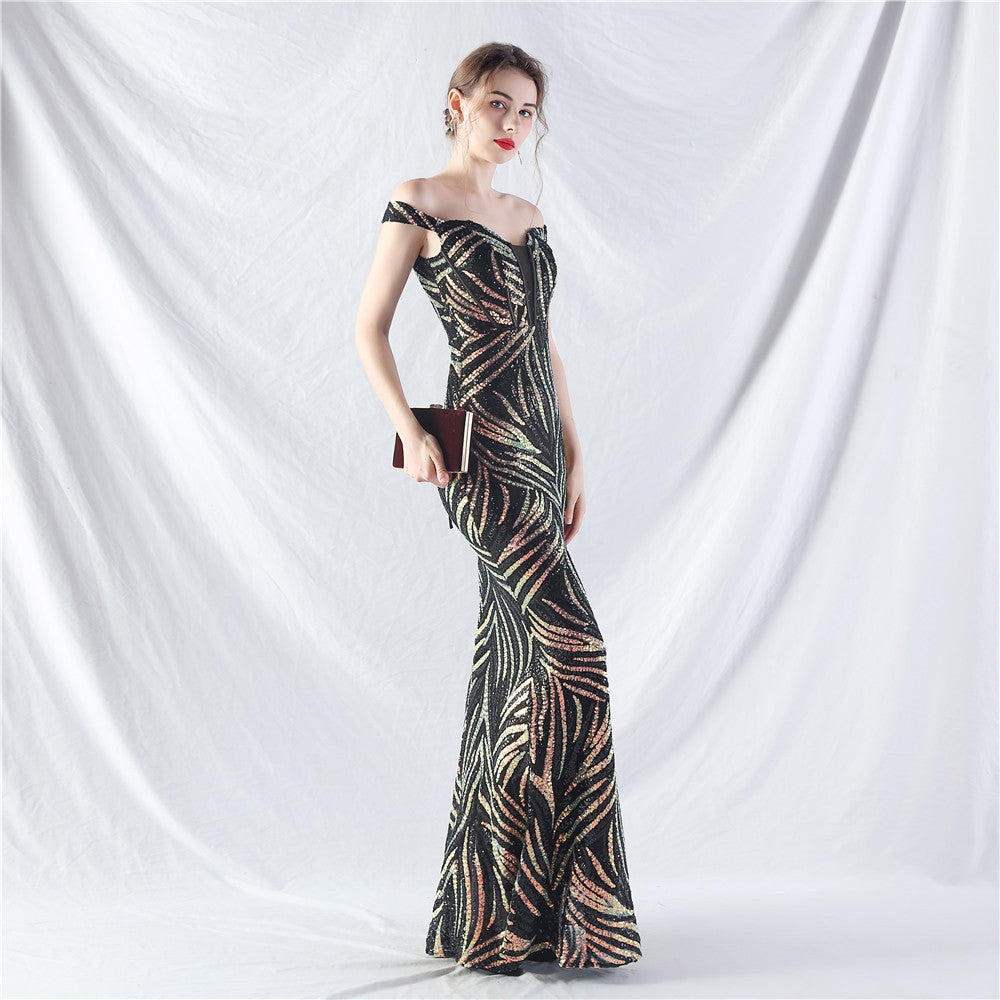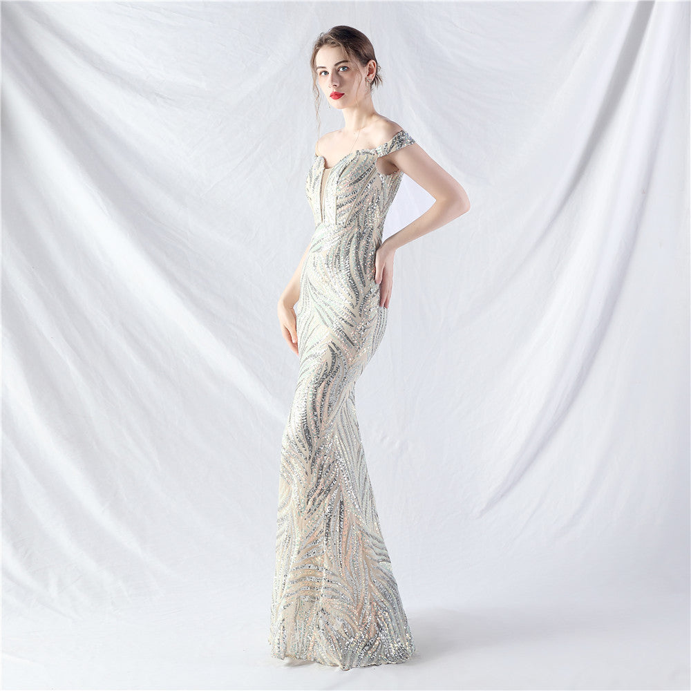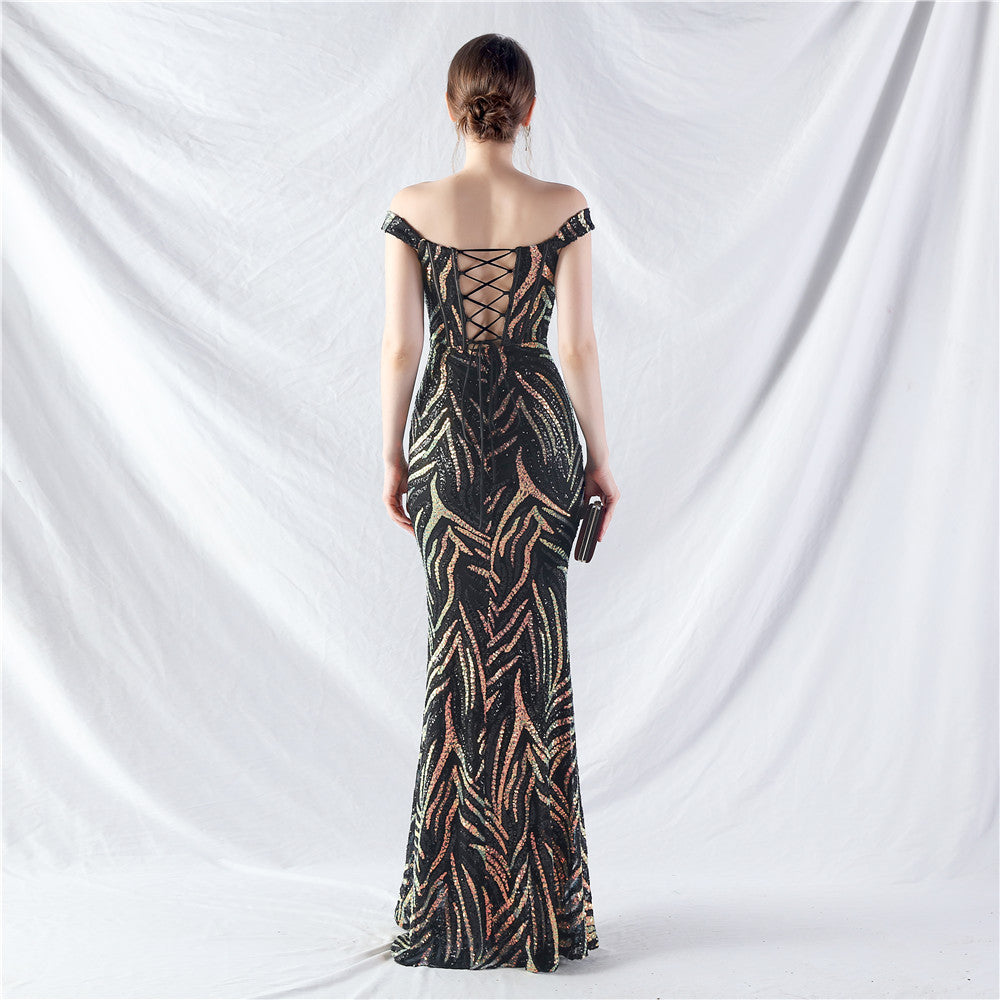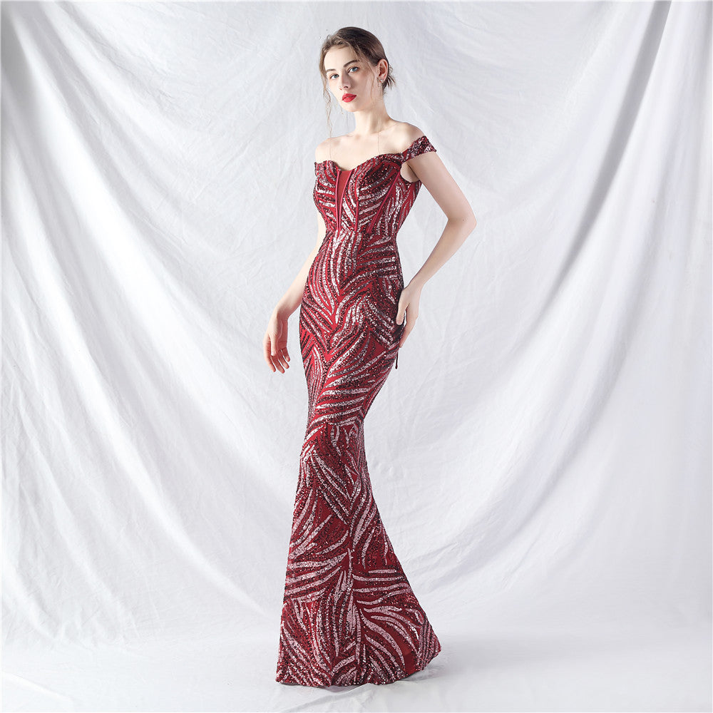 Off-shoulder silhouette with a corset-inspired bodice and a sleek maxi length. The design features a lace-up back, a hidden zipper, and shimmering sequin embellishment.