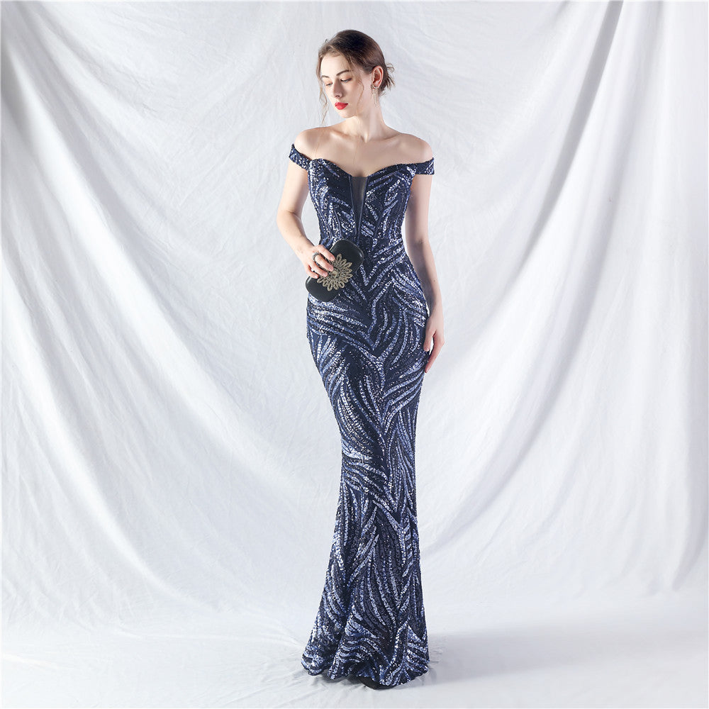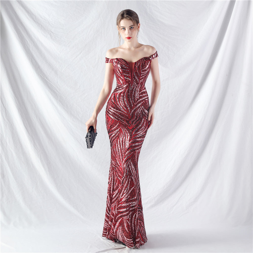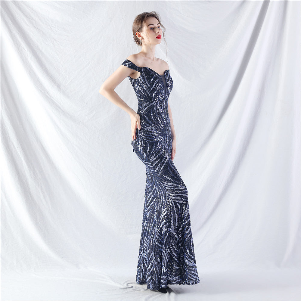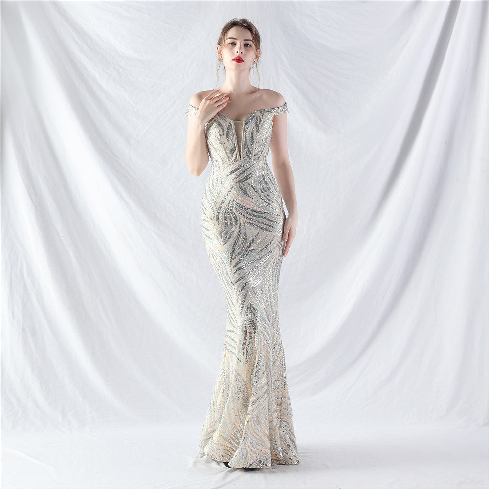 Off-shoulder silhouette with a corset-inspired bodice and a sleek maxi length. The design features a lace-up back, a hidden zipper, and shimmering sequin embellishment.