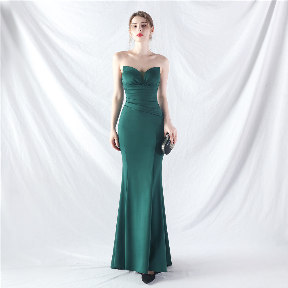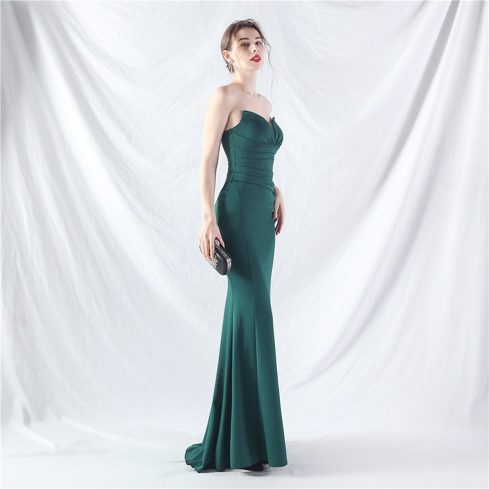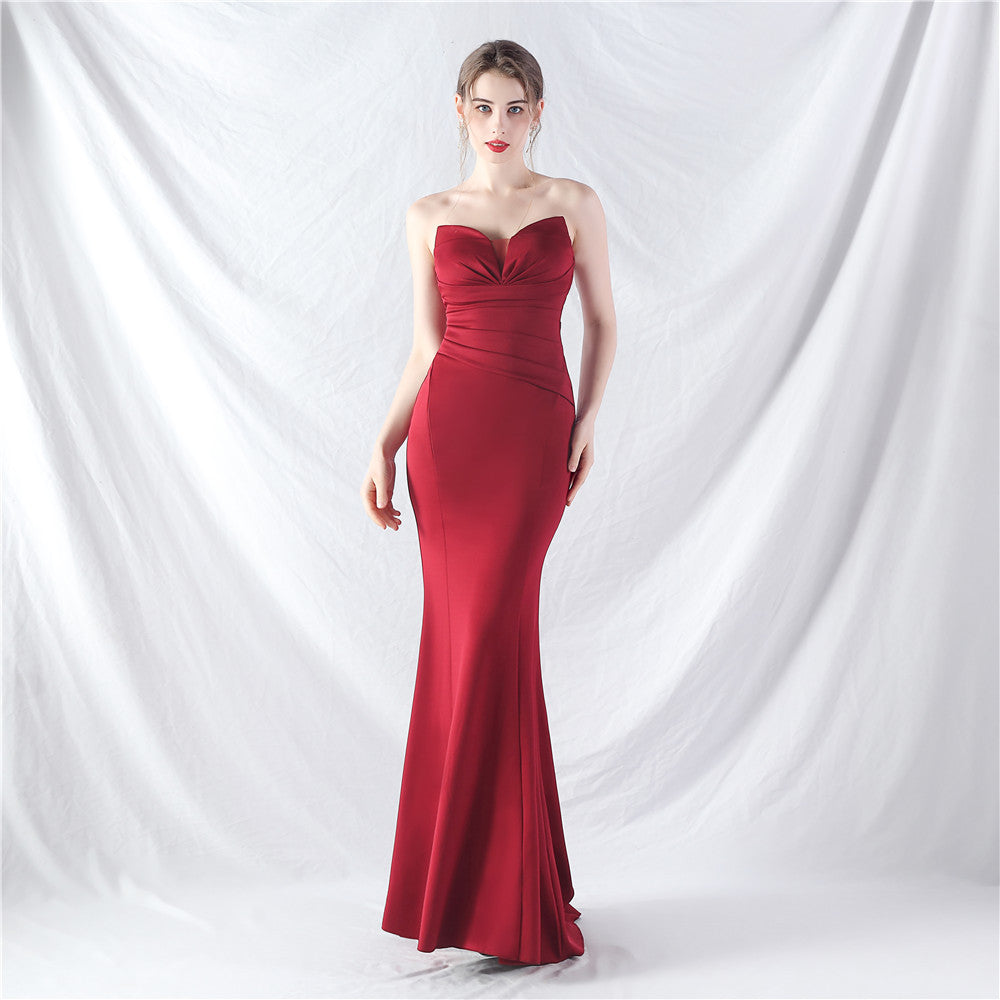 Silhouette follows the body into a floor-length fishtail. A sweetheart neckline frames the bust with ruched detailing and a hidden back zipper for a clean line.