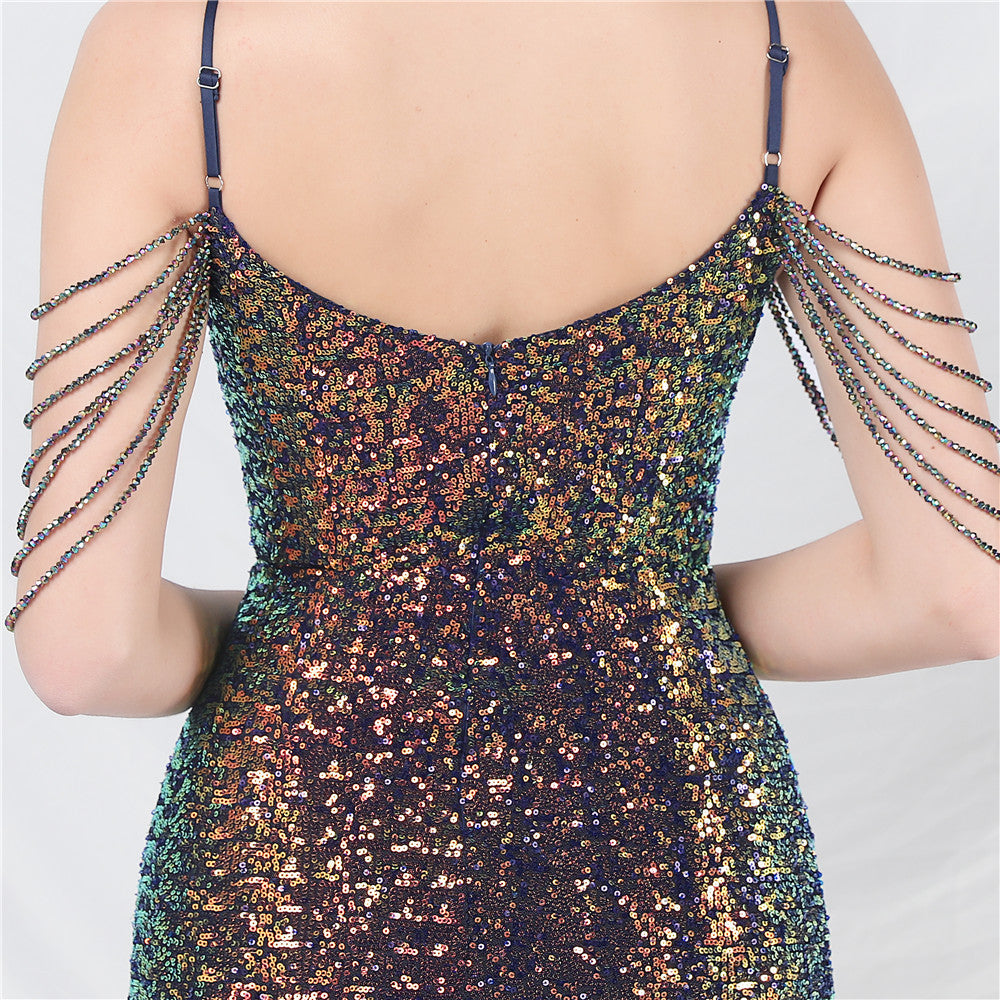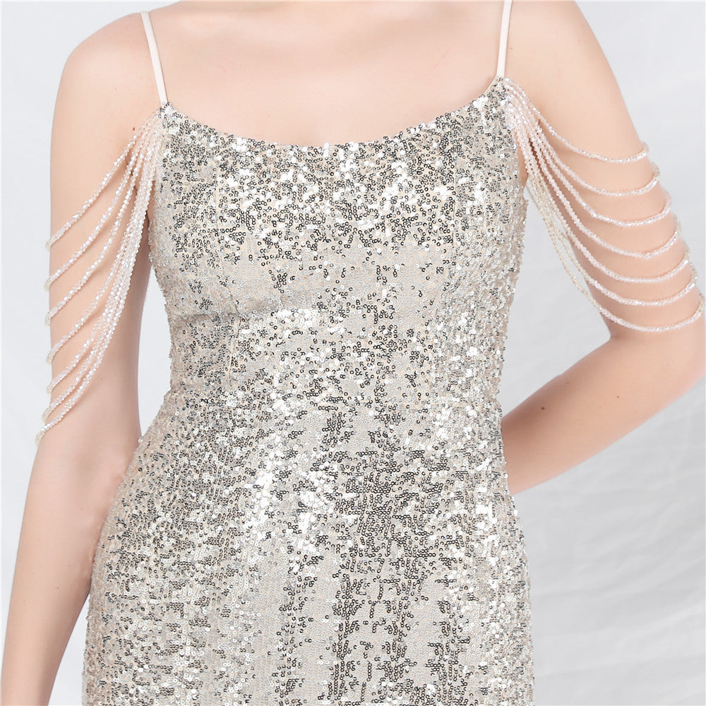 A sequined maxi with a slim, bodycon silhouette. Spaghetti-strap neckline with sequin embellishment adds refined shine.