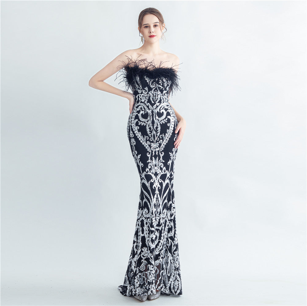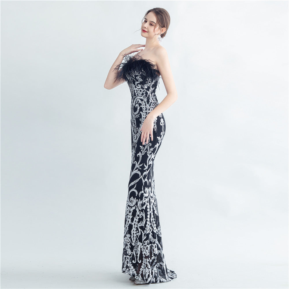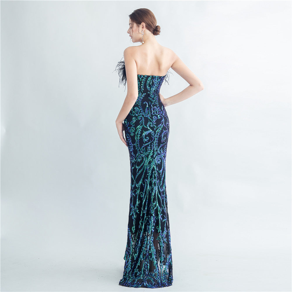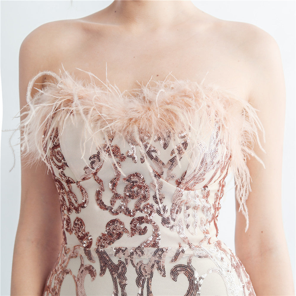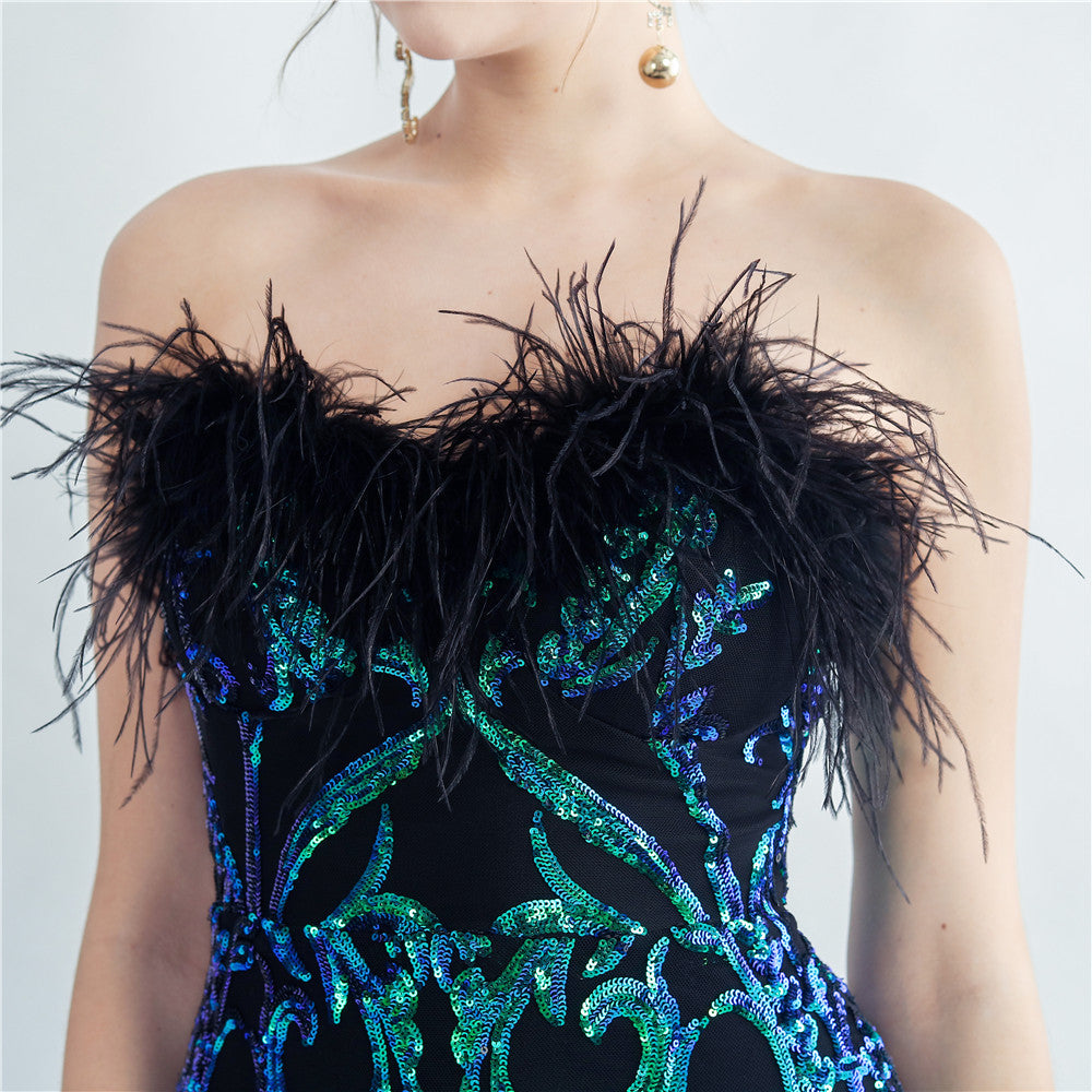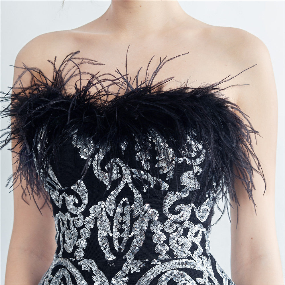 A strapless maxi with a sleek, slim silhouette. Feather and sequin embellishments trace the bodice.