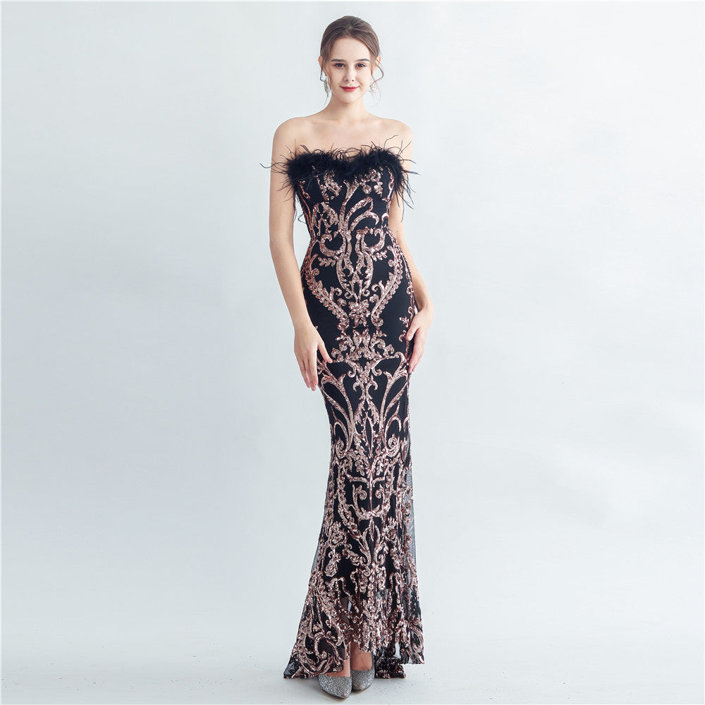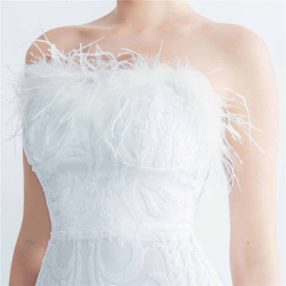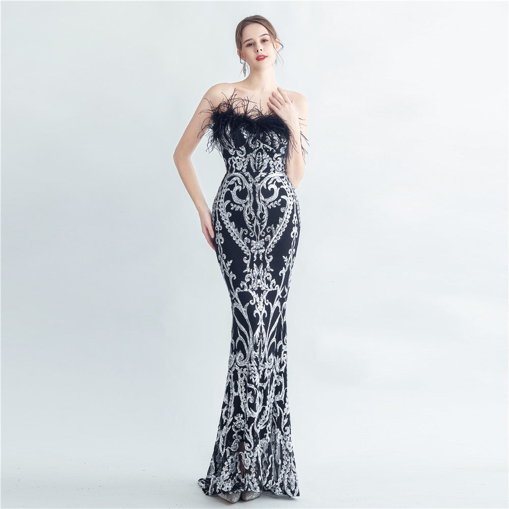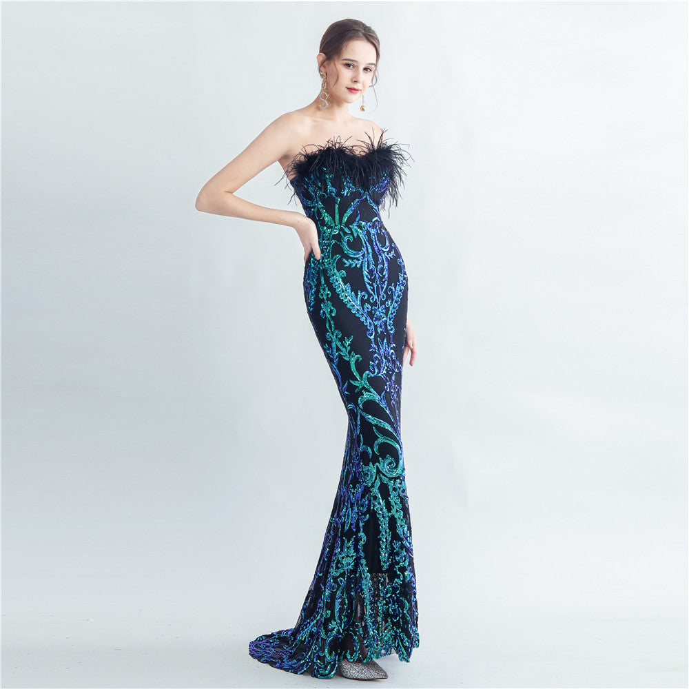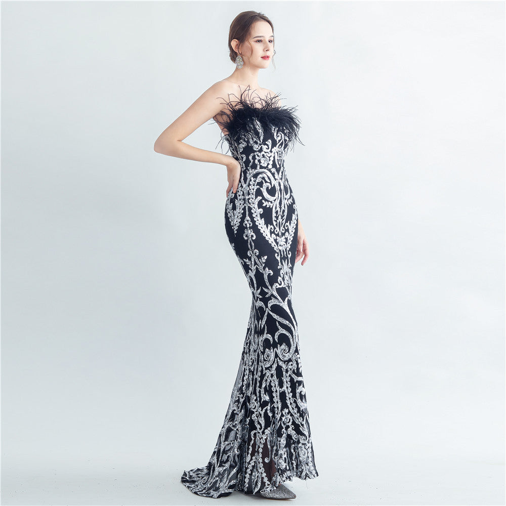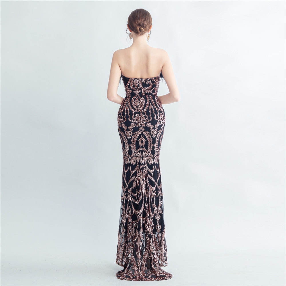 A strapless maxi with a sleek, slim silhouette. Feather and sequin embellishments trace the bodice.