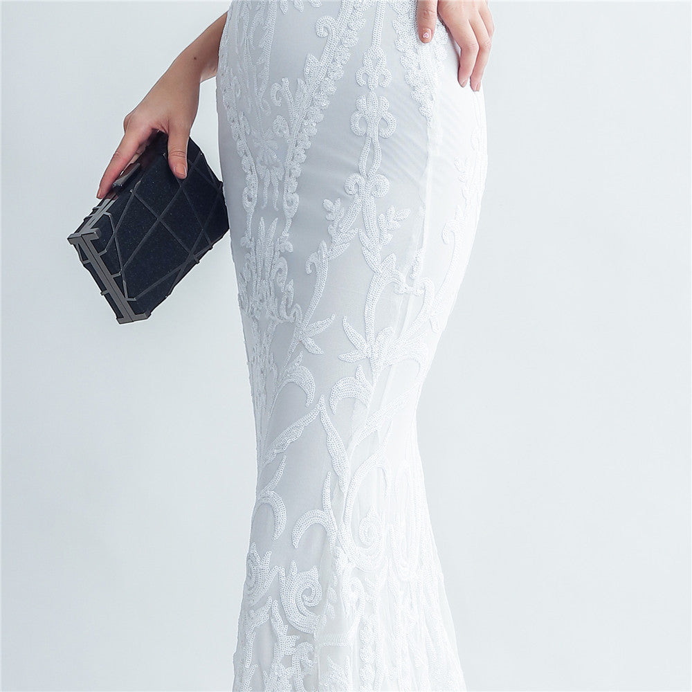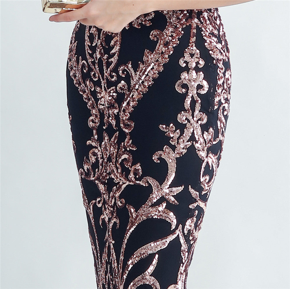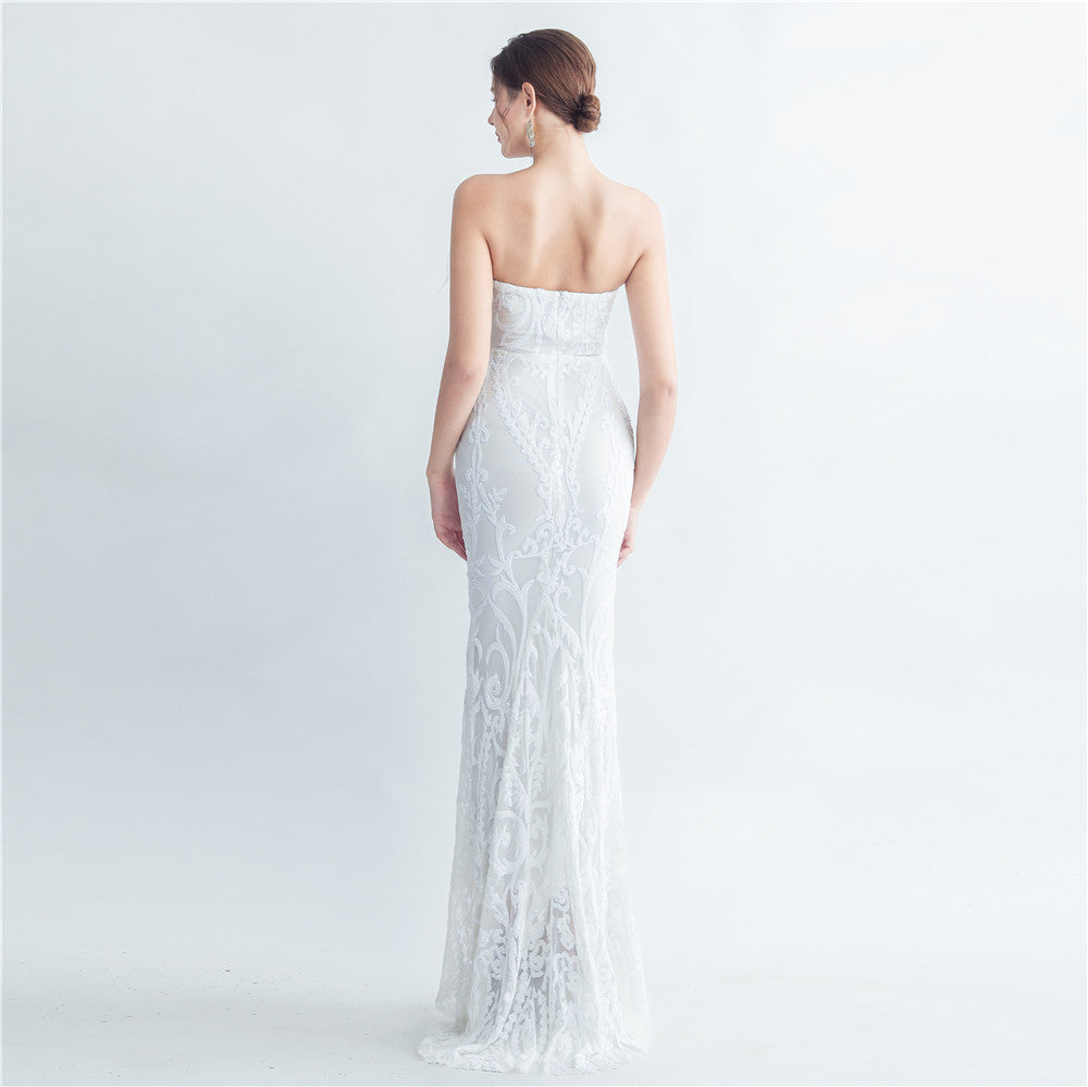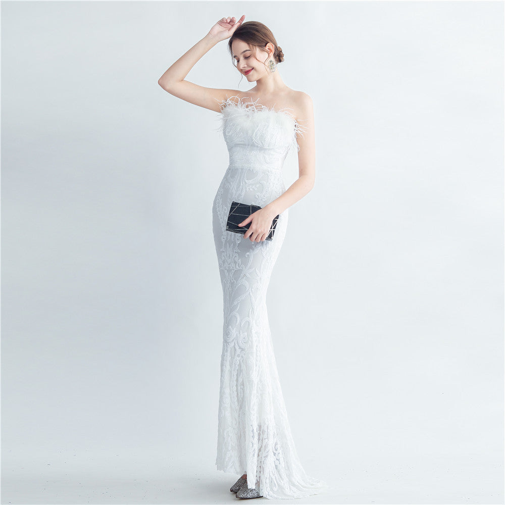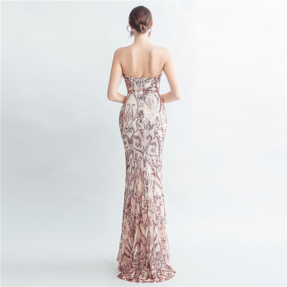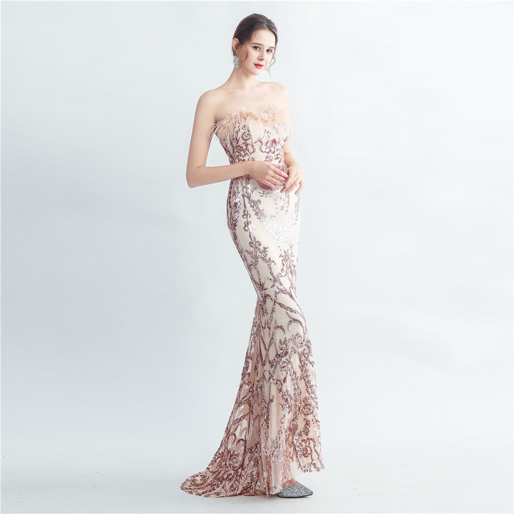 A strapless maxi with a sleek, slim silhouette. Feather and sequin embellishments trace the bodice.