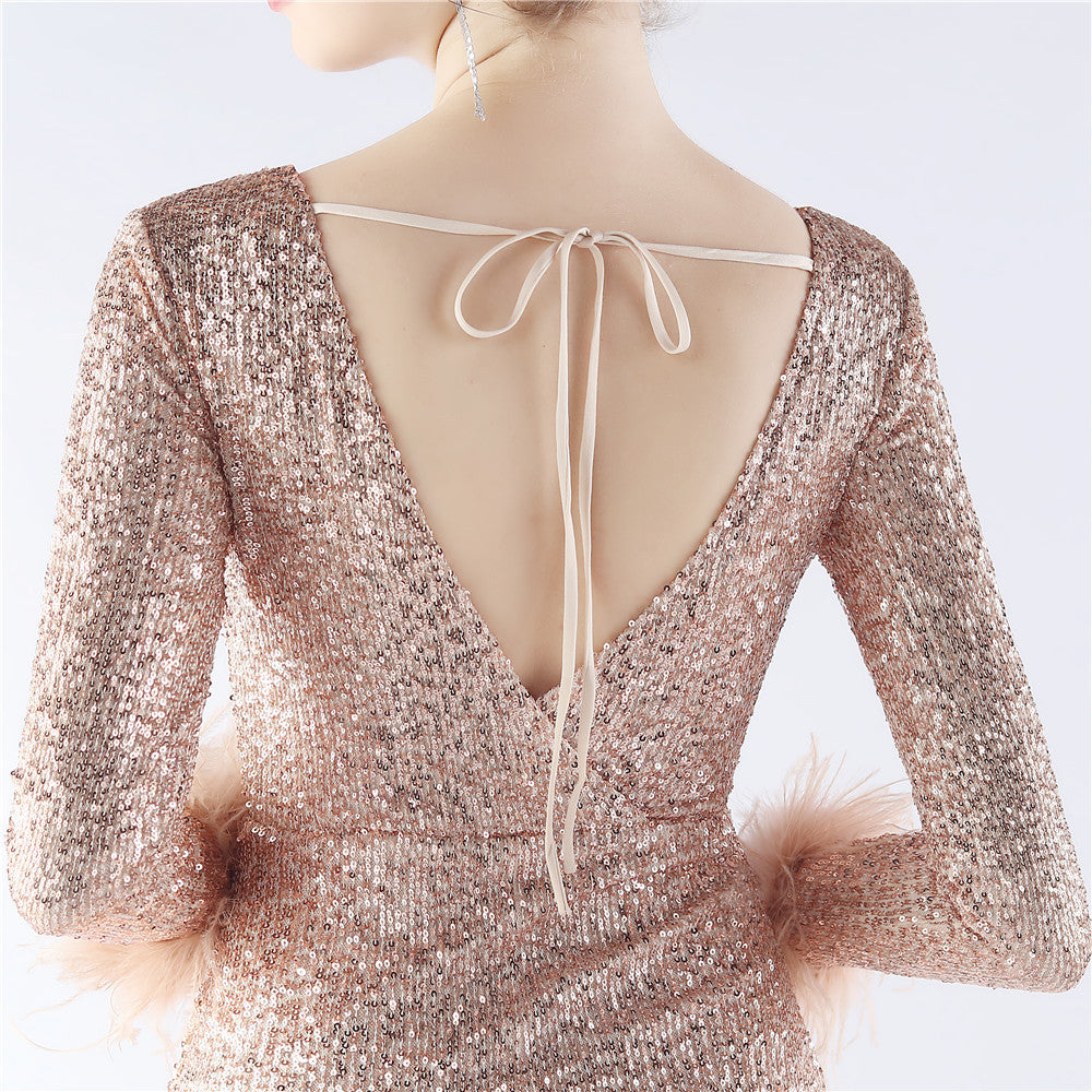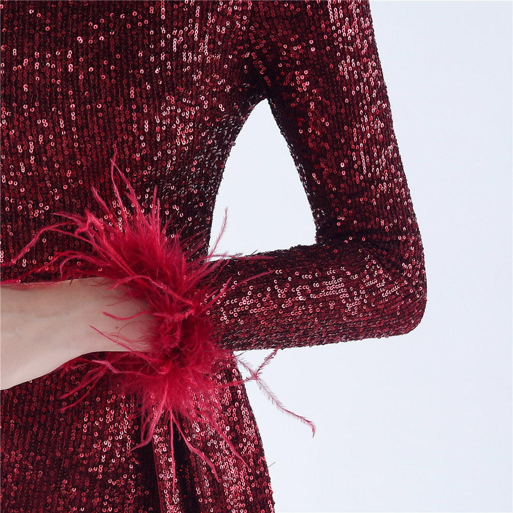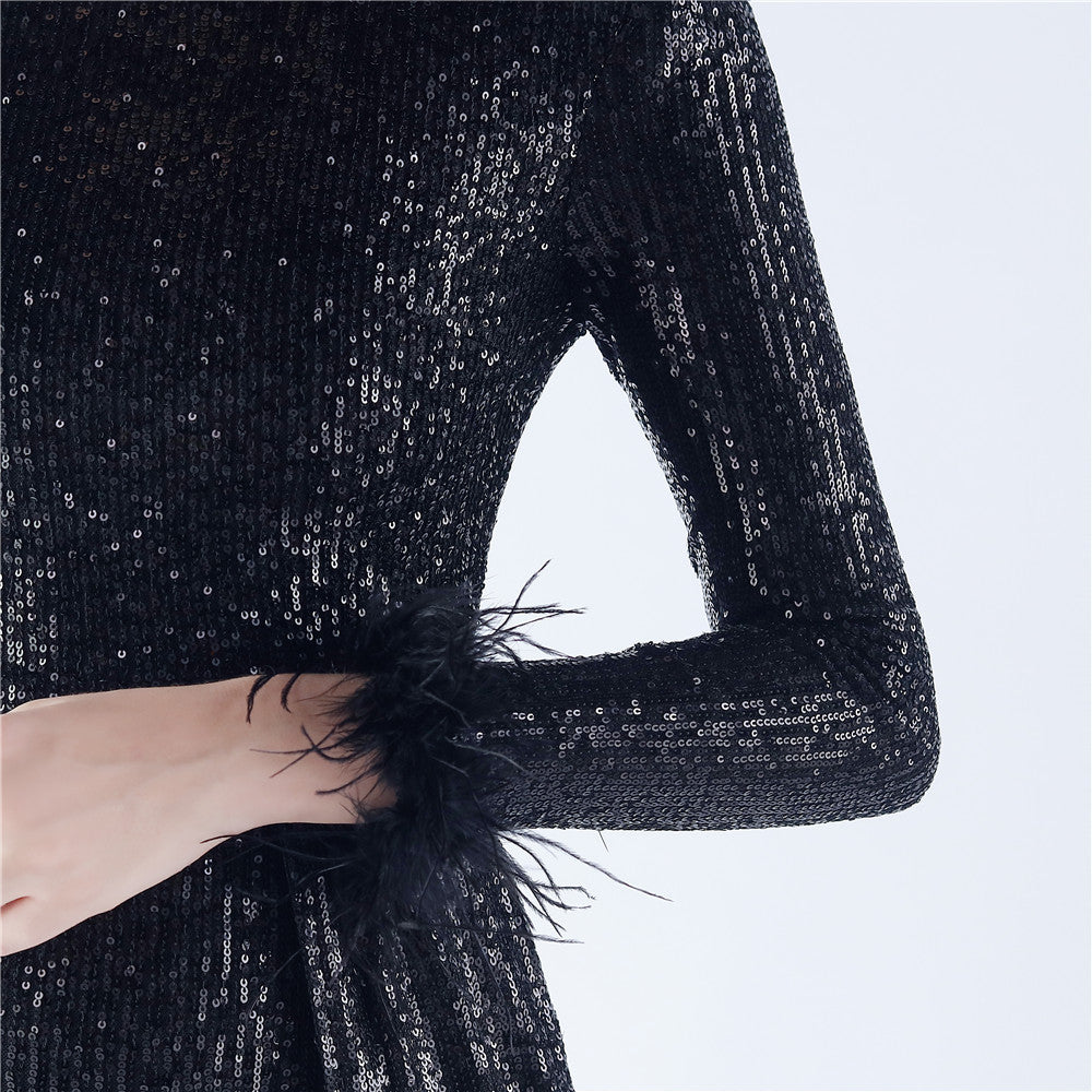 A slim, bodycon dress with a short hem forms a clean, modern silhouette. A backless profile with feathered, sequined embellishment, a crew neck, and a side split finished with a tie complete the look.
