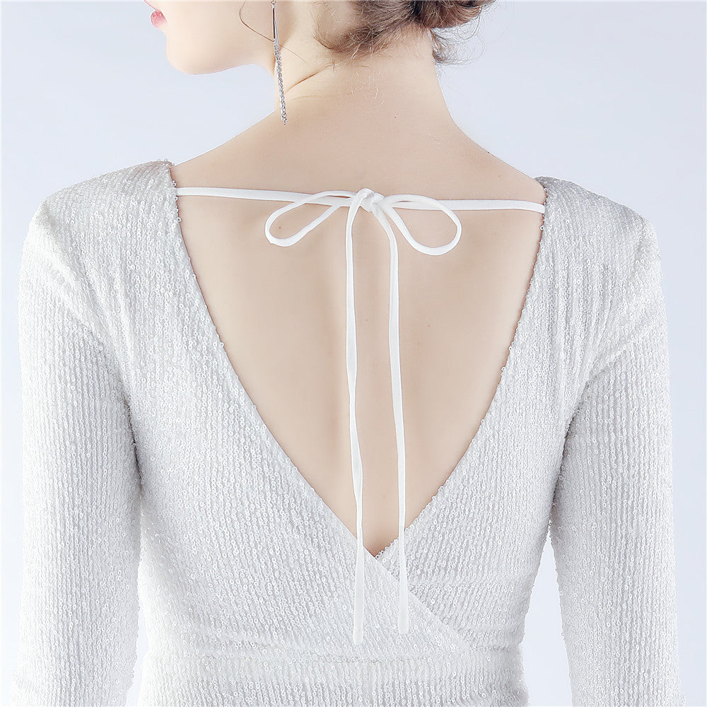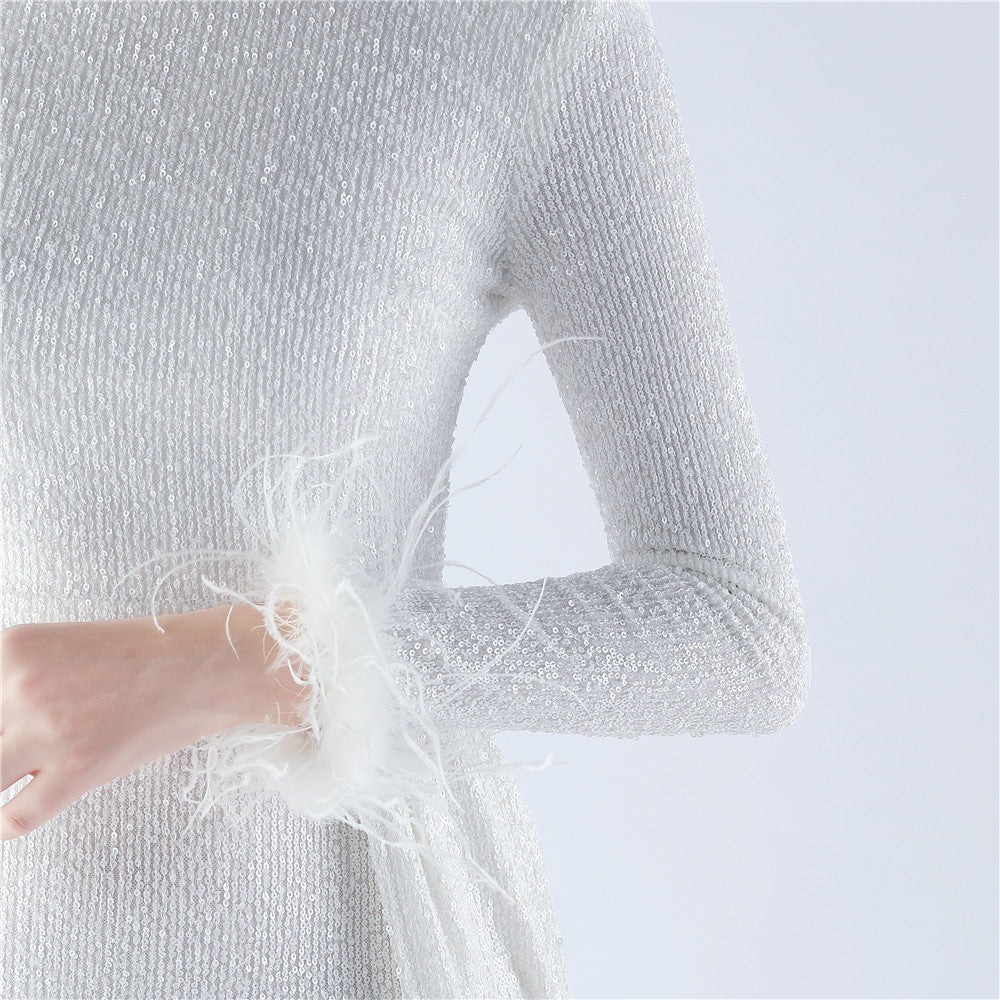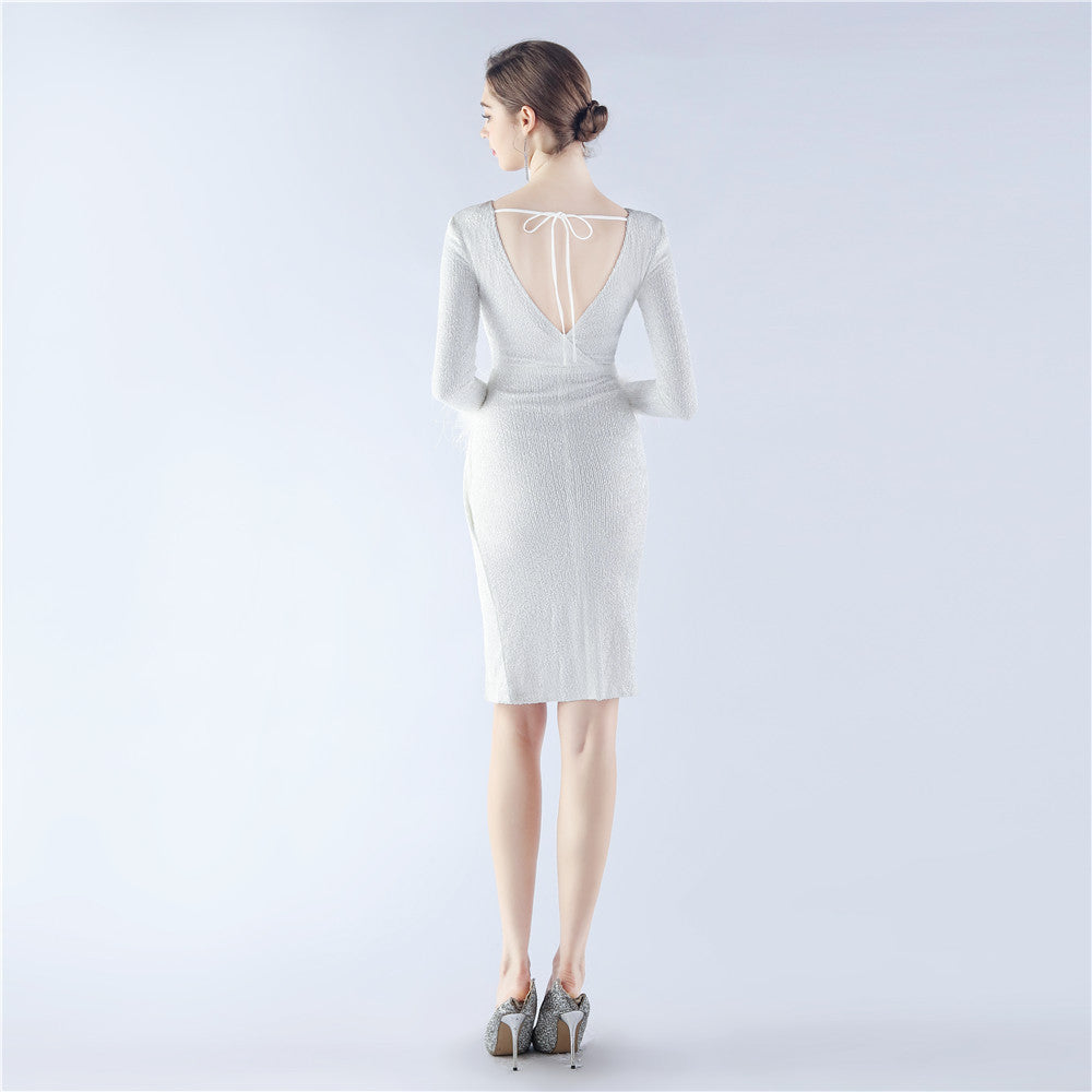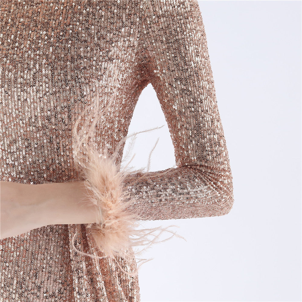 A slim, bodycon dress with a short hem forms a clean, modern silhouette. A backless profile with feathered, sequined embellishment, a crew neck, and a side split finished with a tie complete the look.