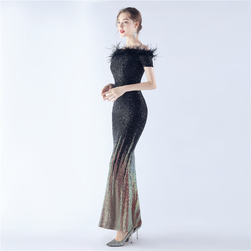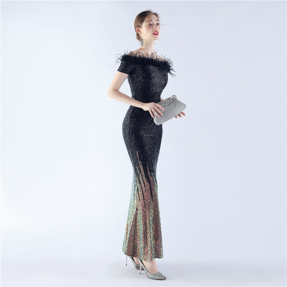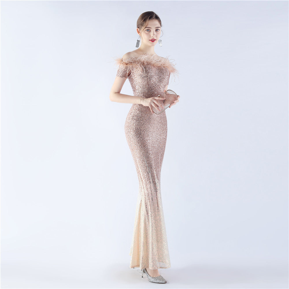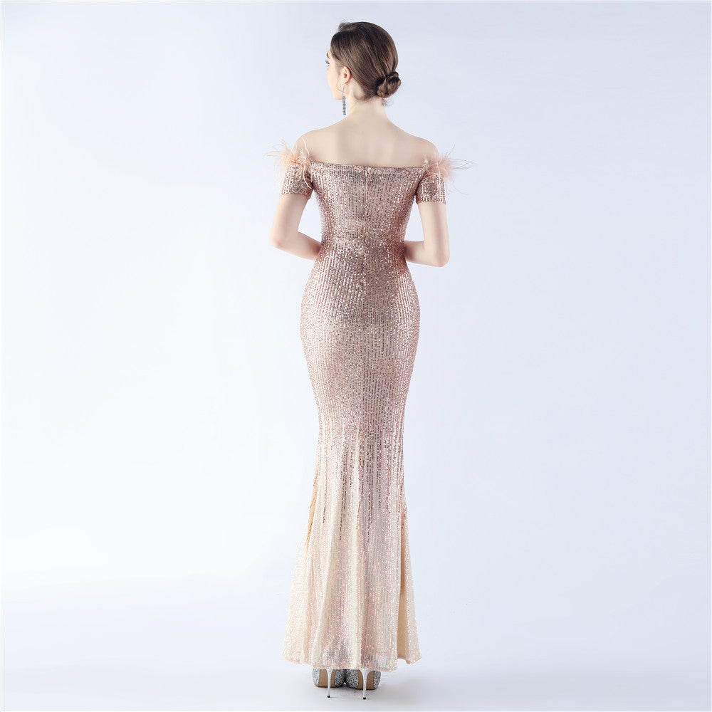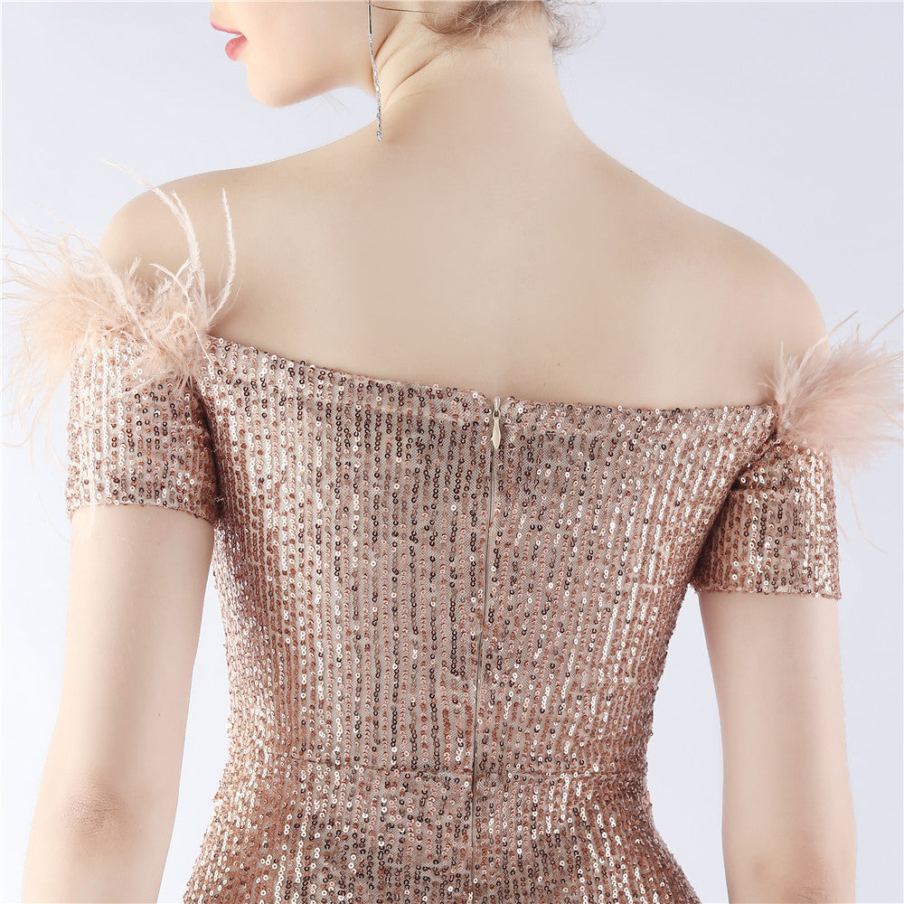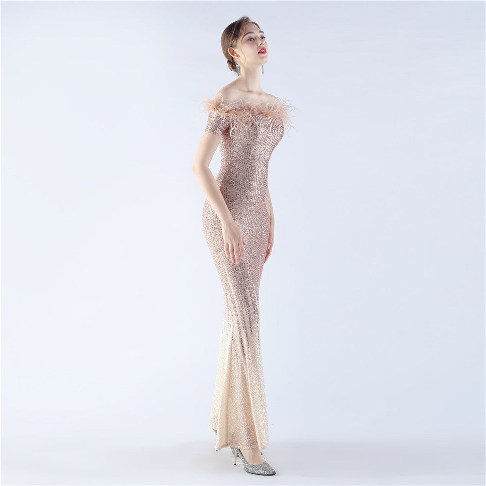An off-shoulder maxi with a slim, body-skimming silhouette. Sequins and ostrich feather detailing accent the dress.