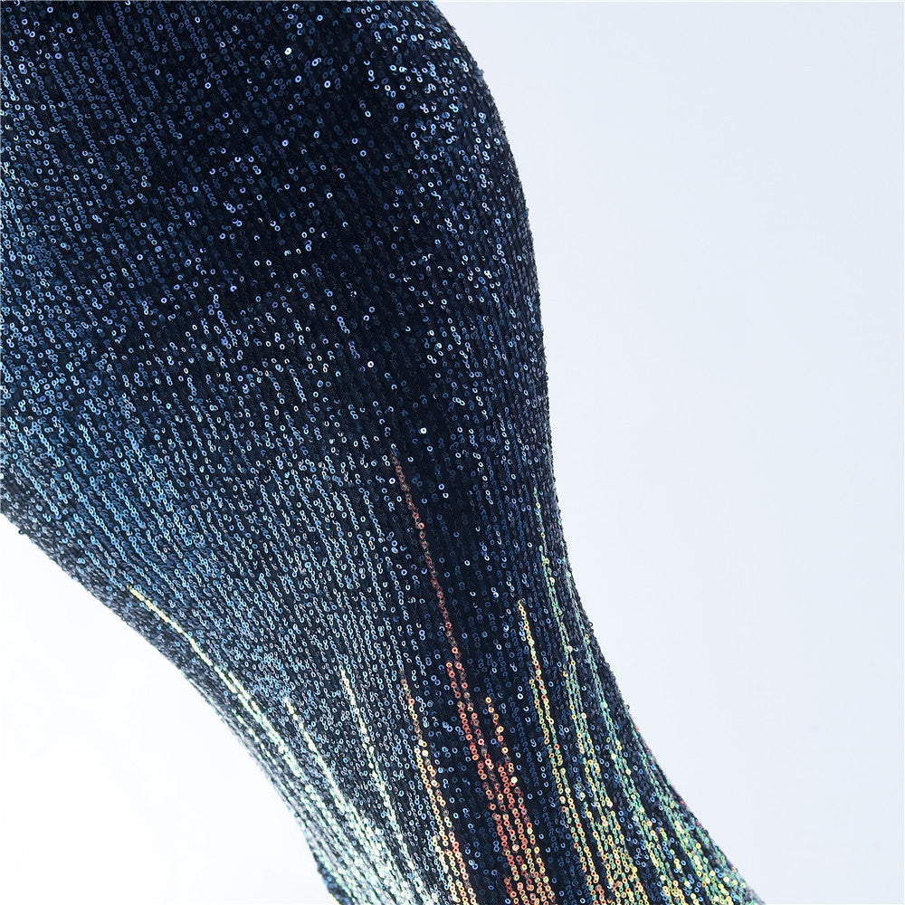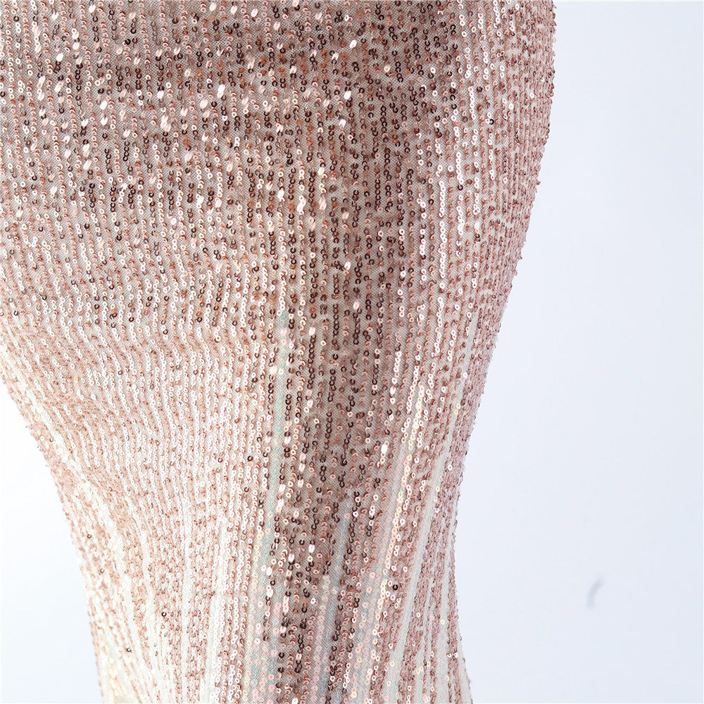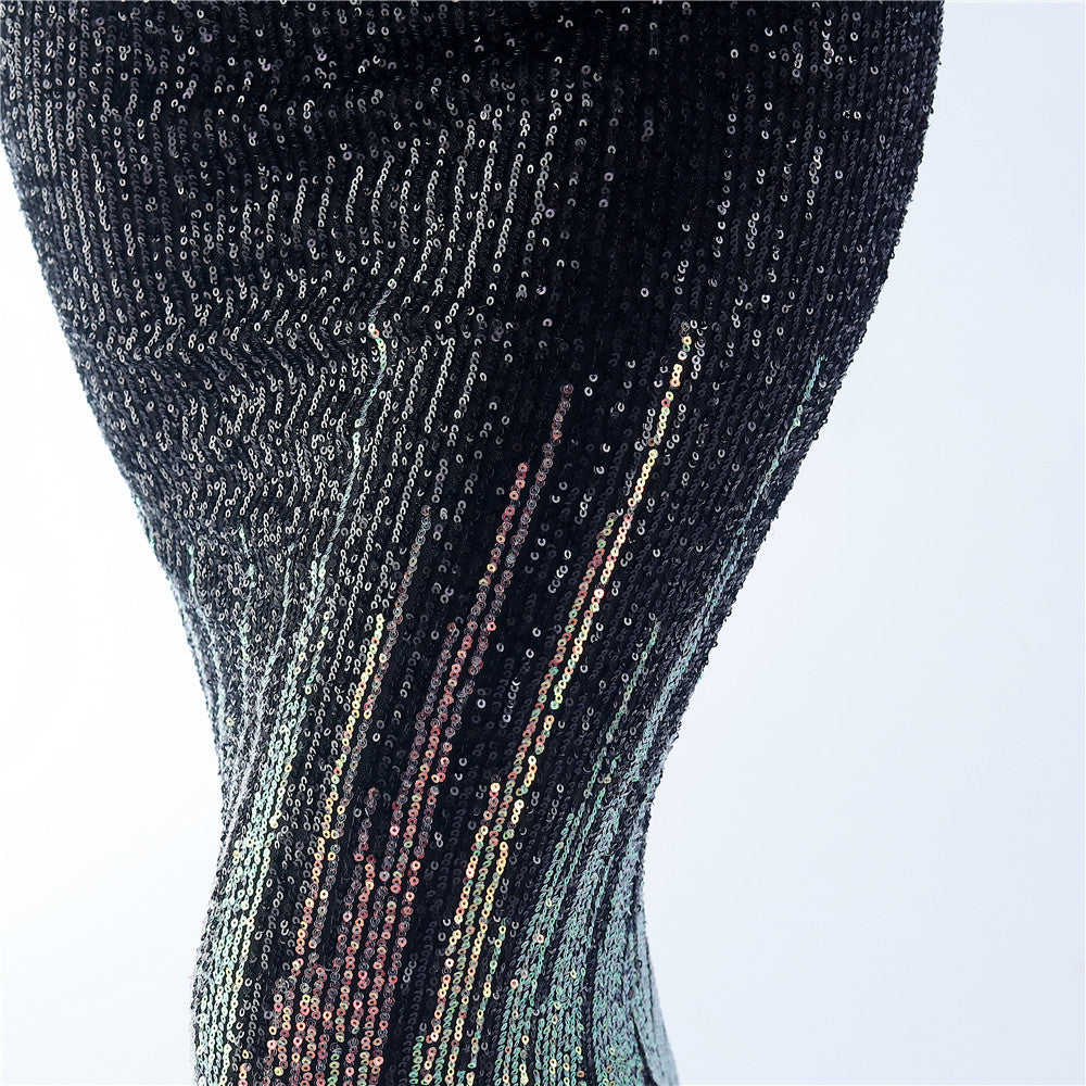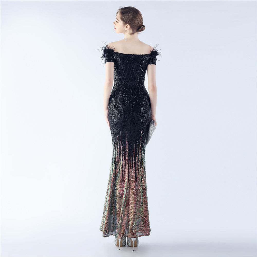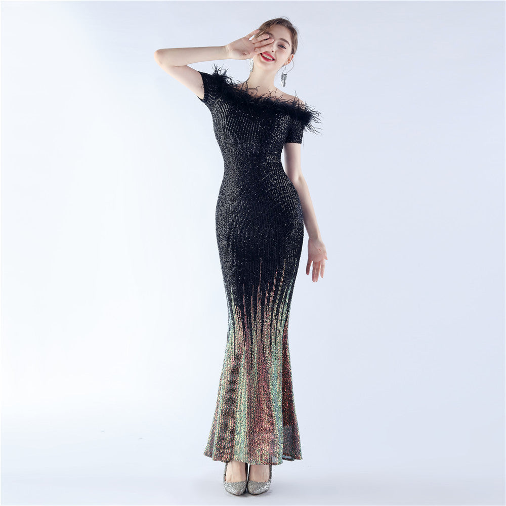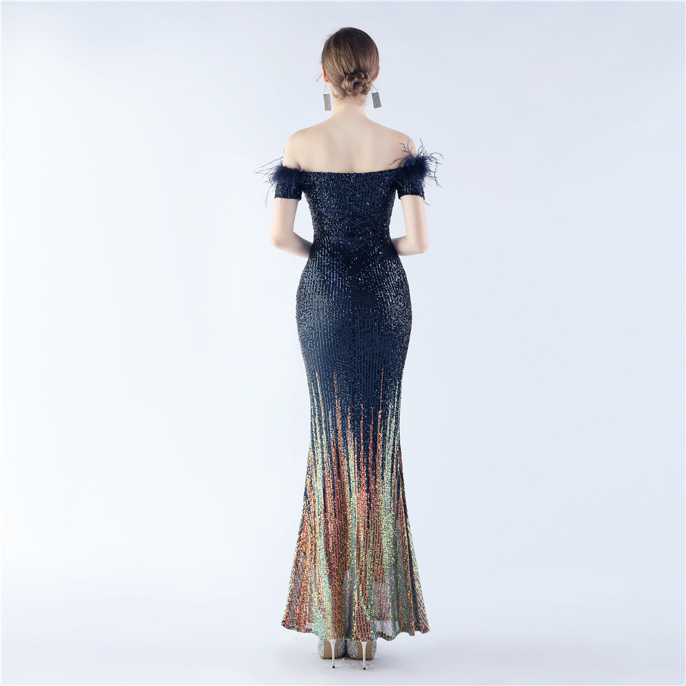 An off-shoulder maxi with a slim, body-skimming silhouette. Sequins and ostrich feather detailing accent the dress.