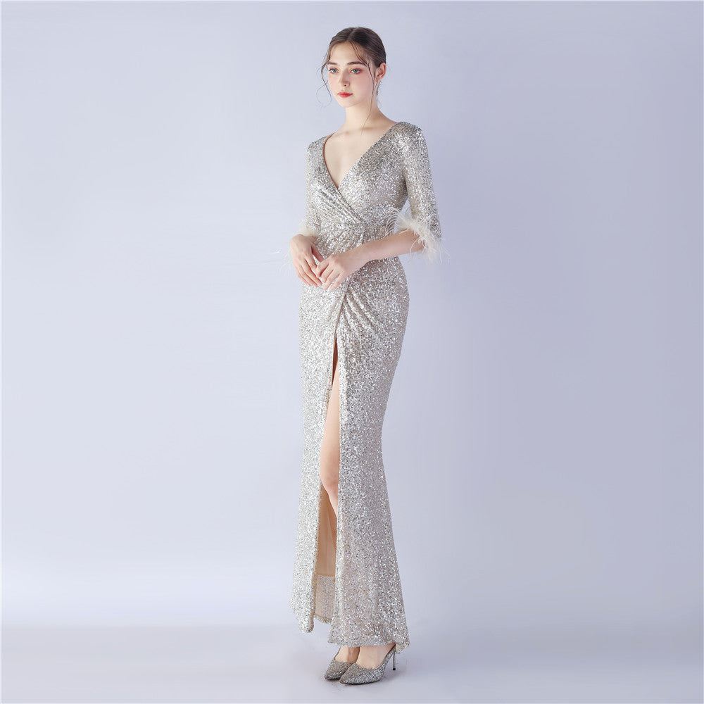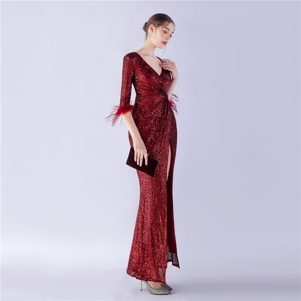 A sleek maxi with a slim, bodycon silhouette. V-neckline, ostrich feathers, and sequins frame the front split with a hidden zipper.
