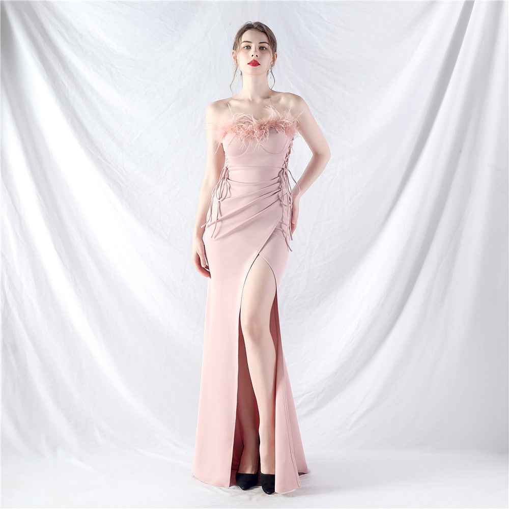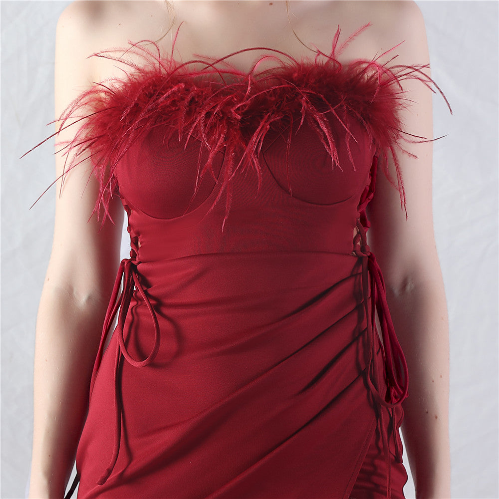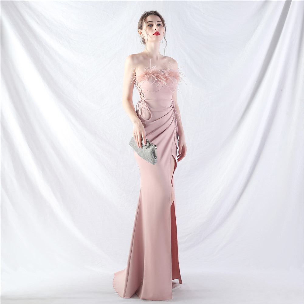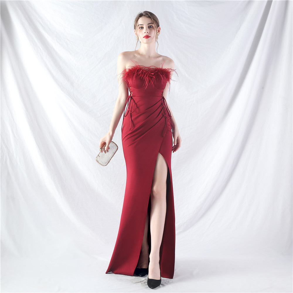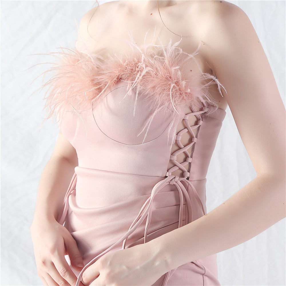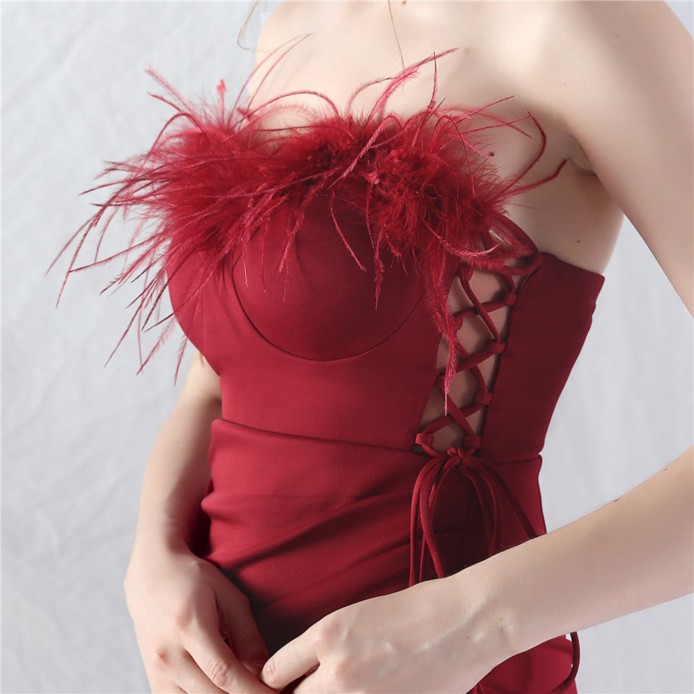 A strapless maxi with a slim, streamlined silhouette. Feather accents, a lace-up back and a discreet zipper accompany a refined front split.