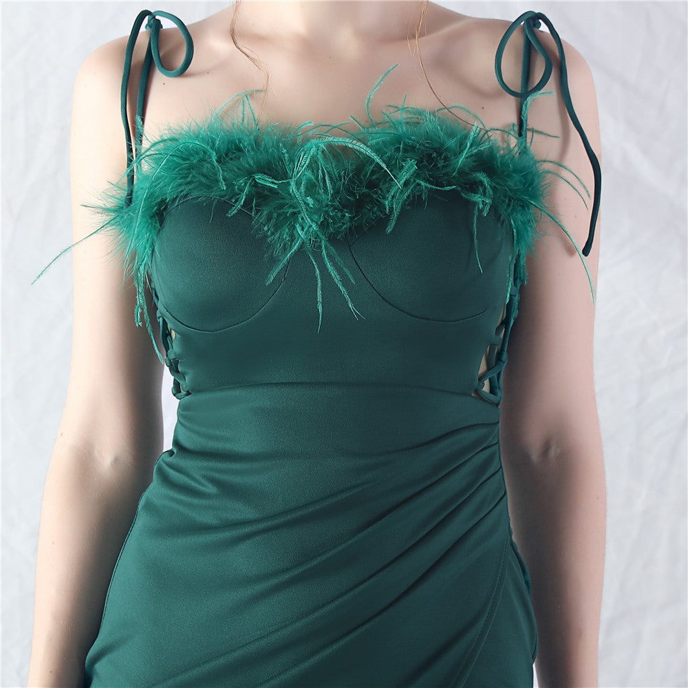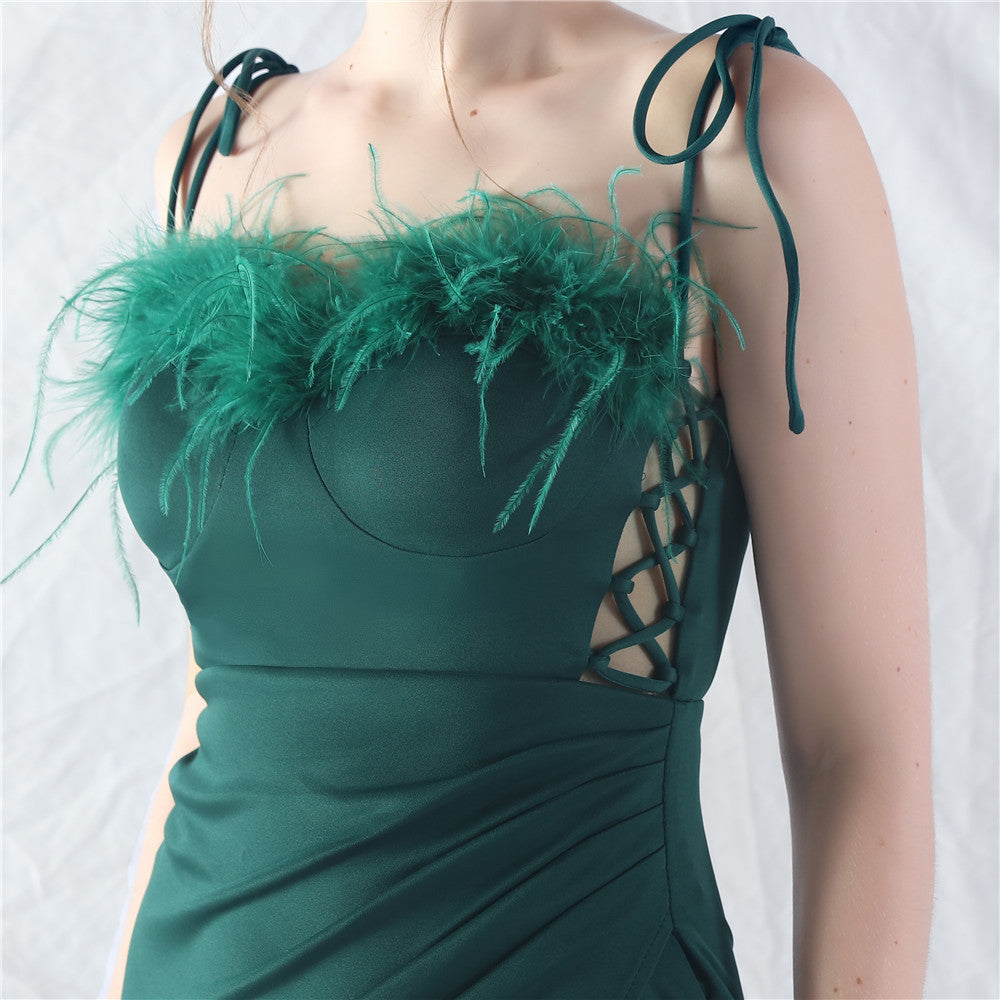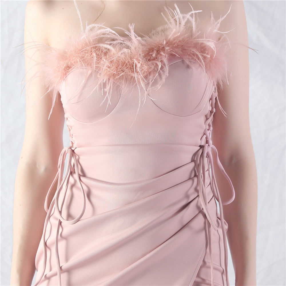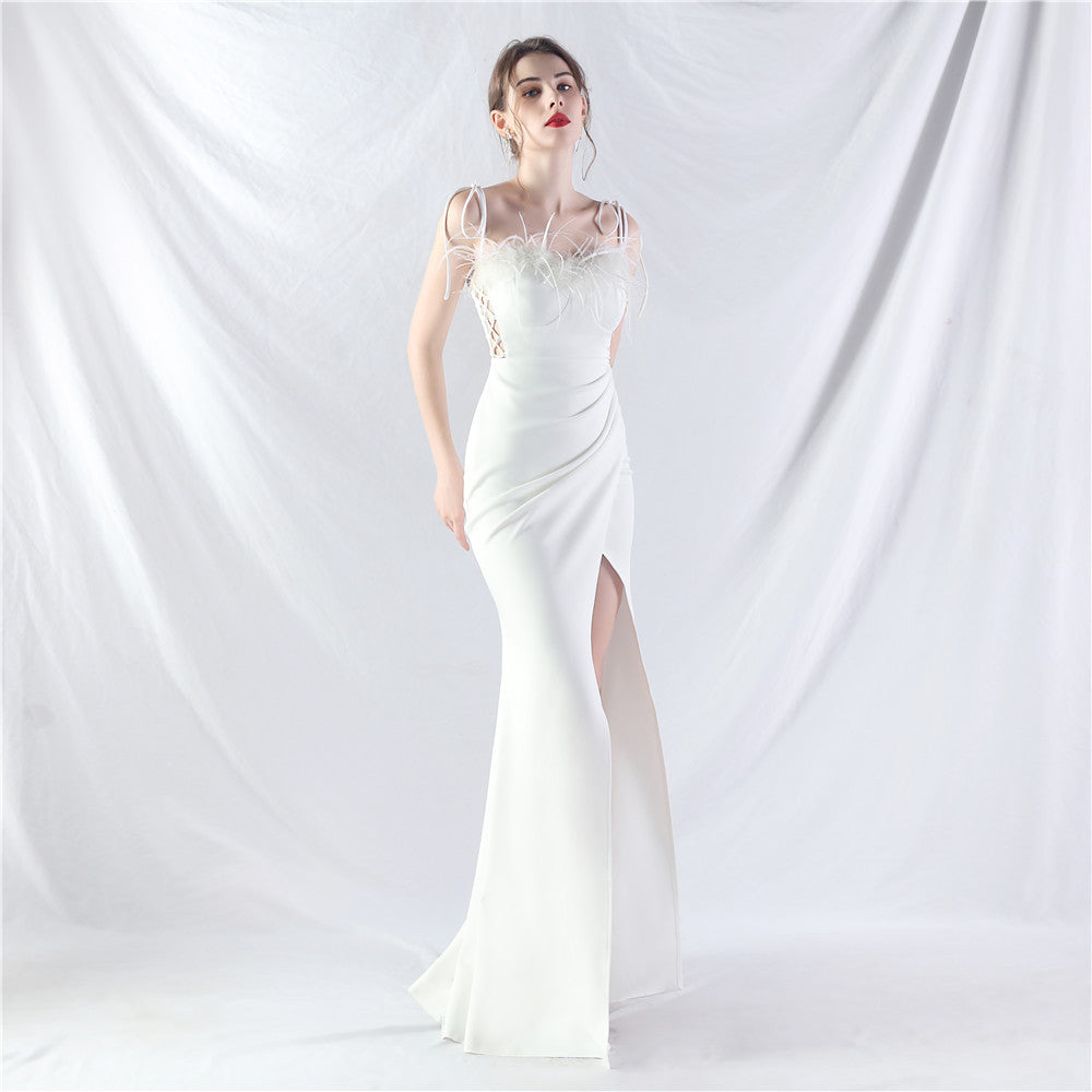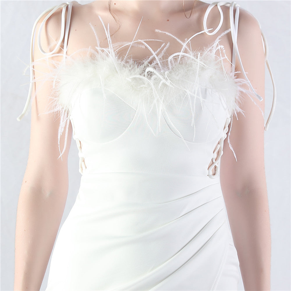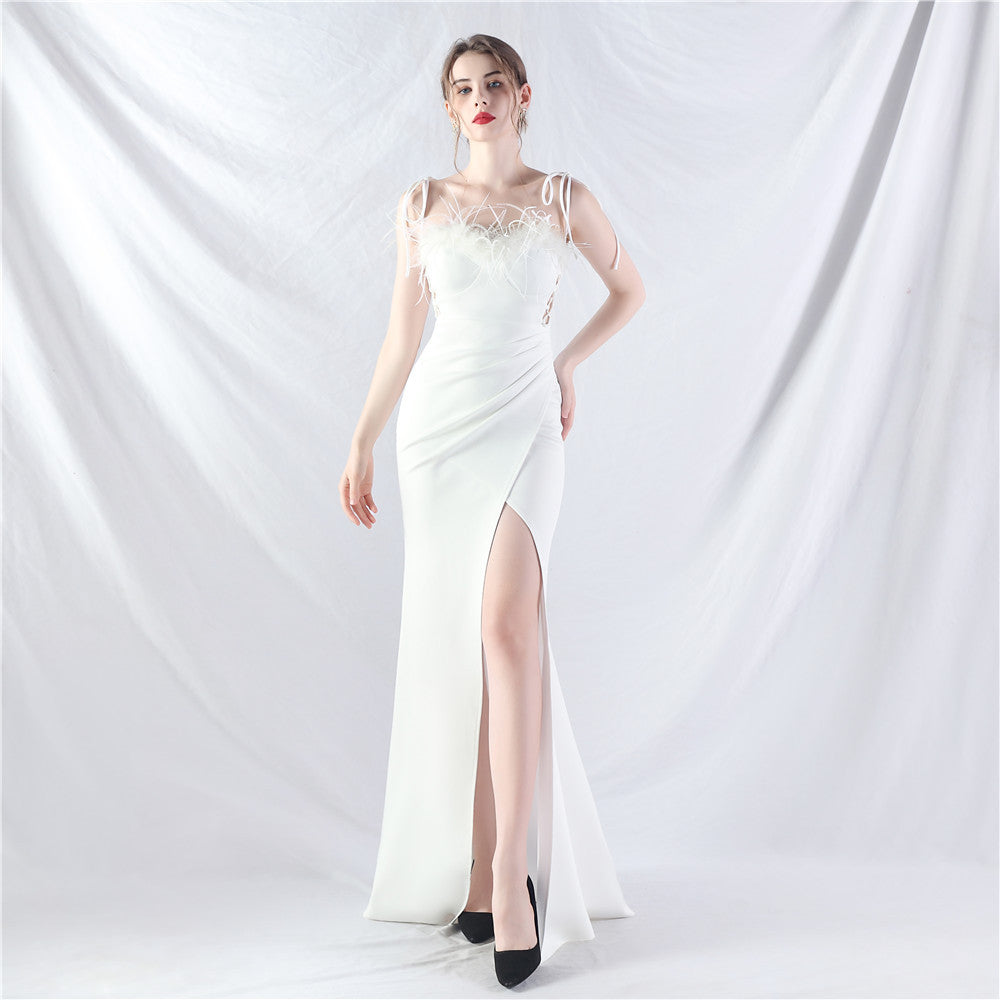 A strapless maxi with a slim, streamlined silhouette. Feather accents, a lace-up back and a discreet zipper accompany a refined front split.
