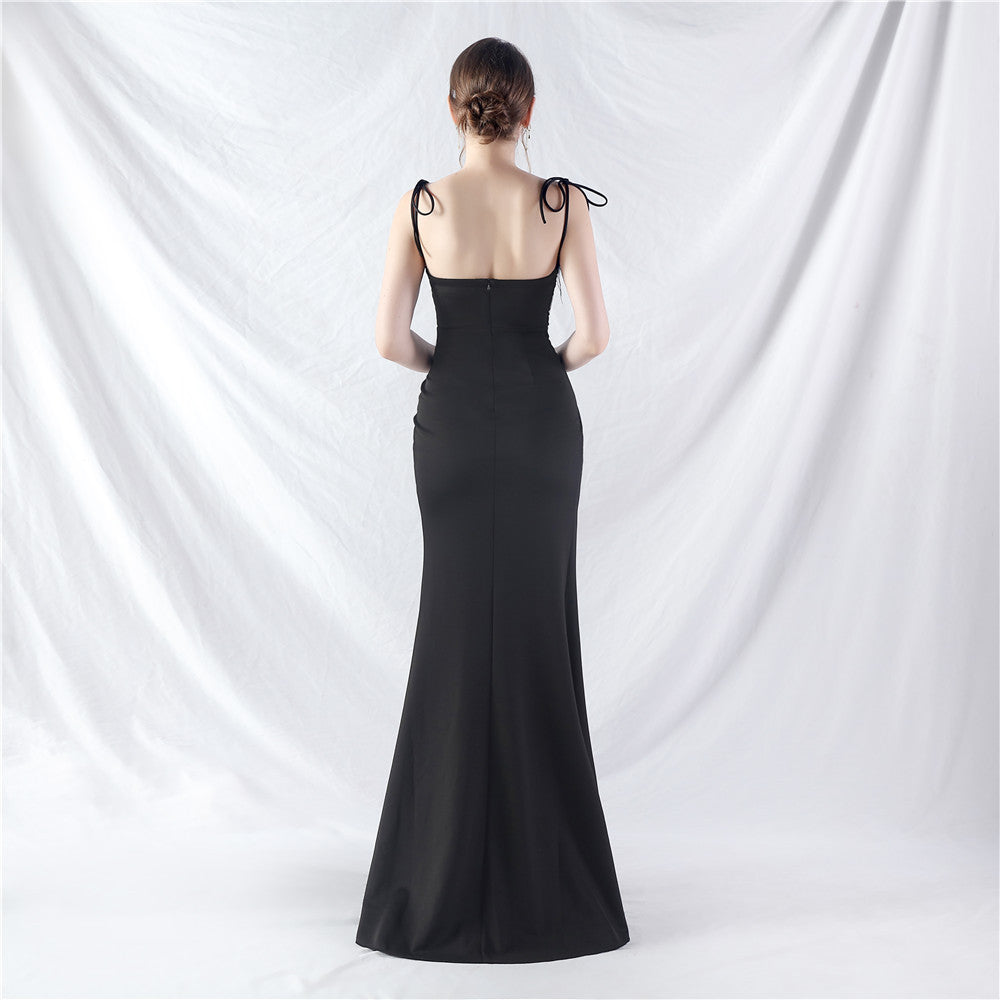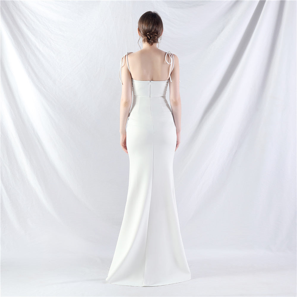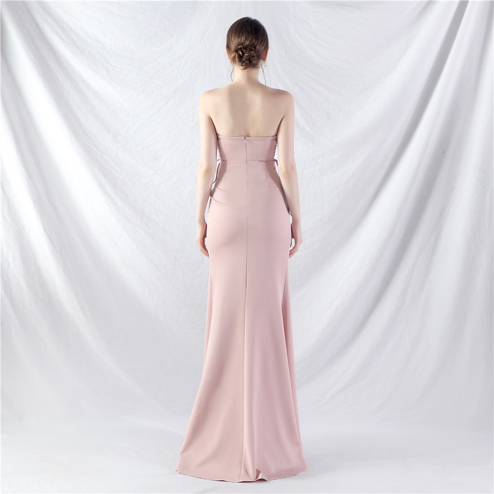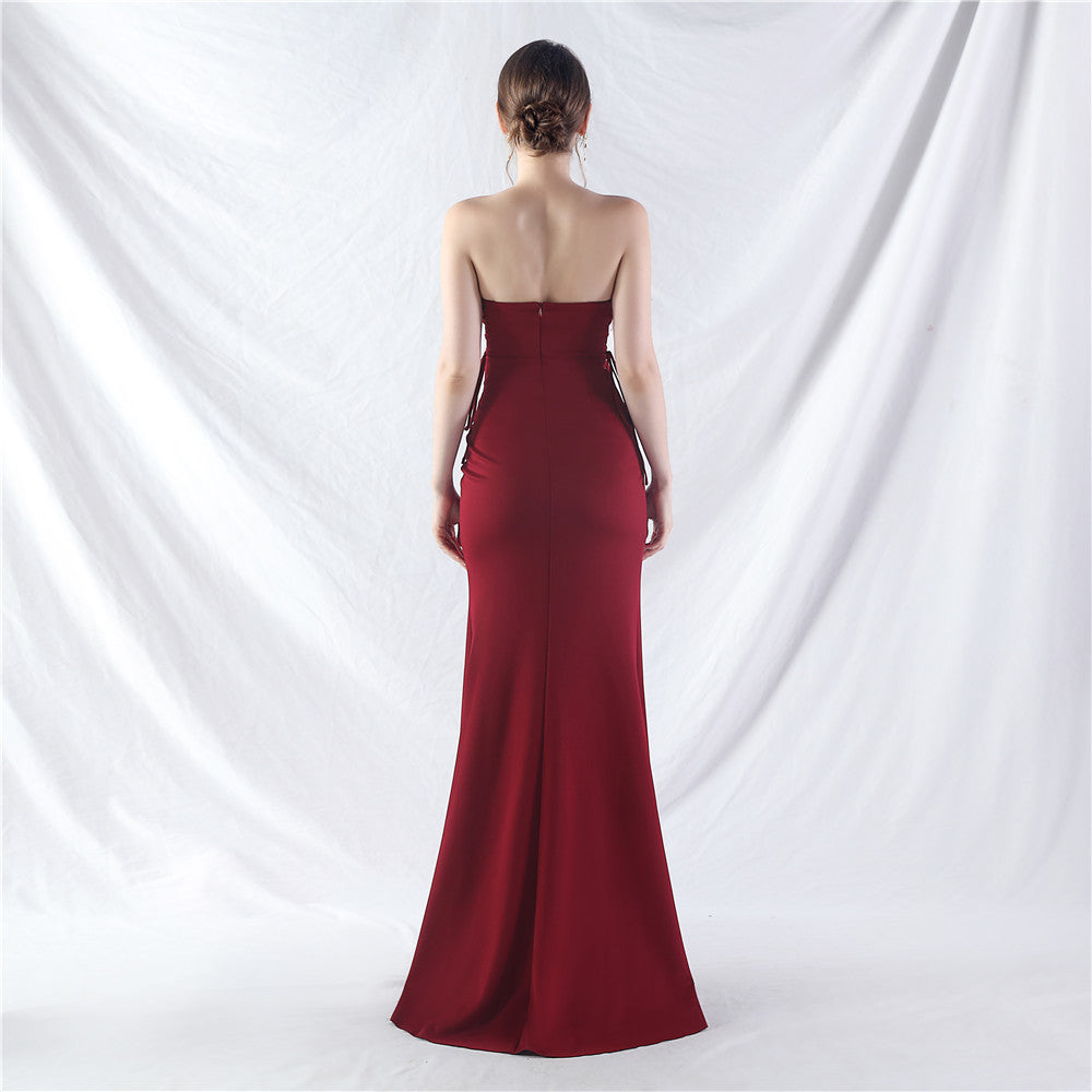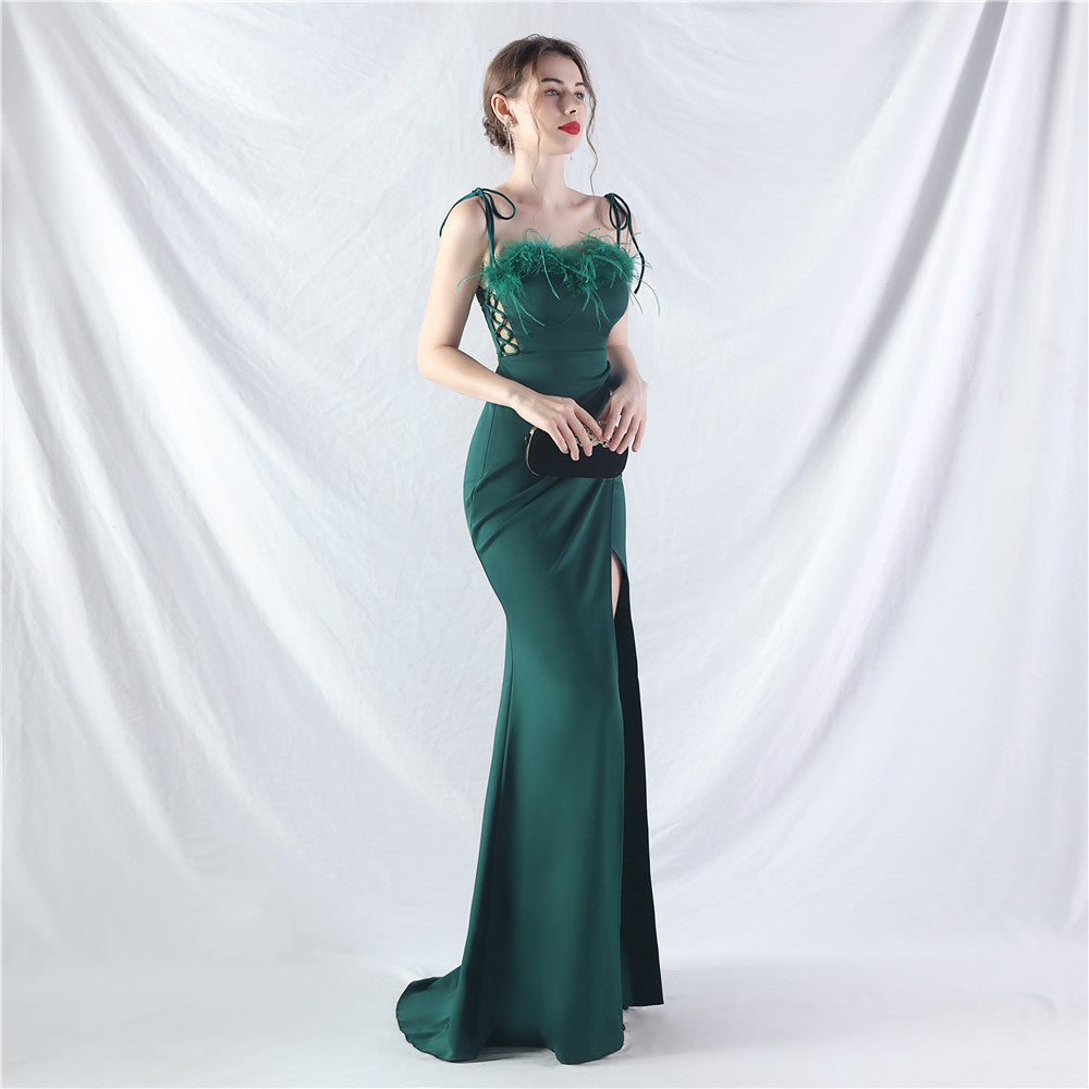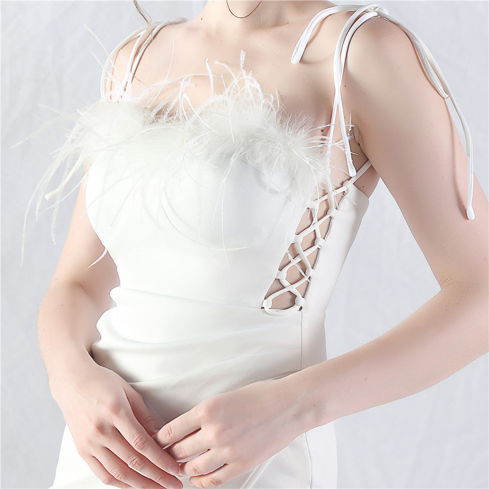 A strapless maxi with a slim, streamlined silhouette. Feather accents, a lace-up back and a discreet zipper accompany a refined front split.