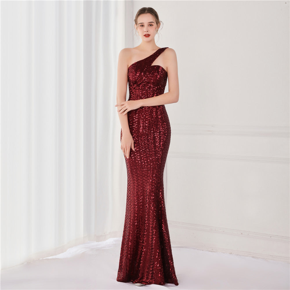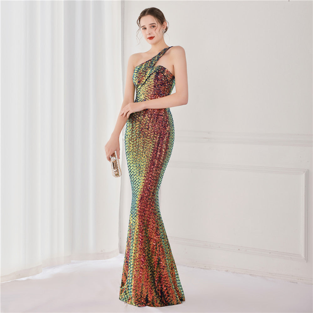 An asymmetric sequin maxi with a slim silhouette. It is sleeveless, featuring a shimmering sequin embellishment and a fishtail hem.