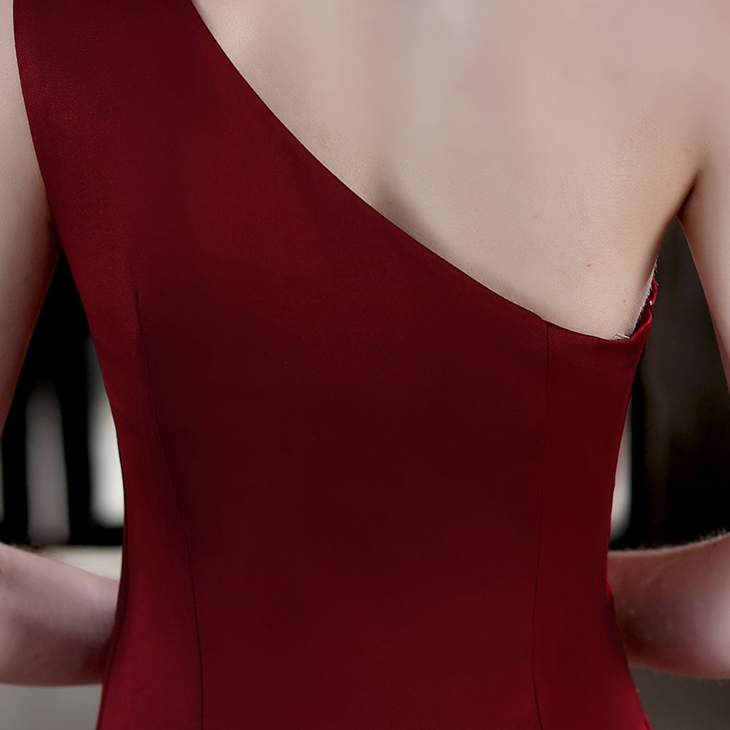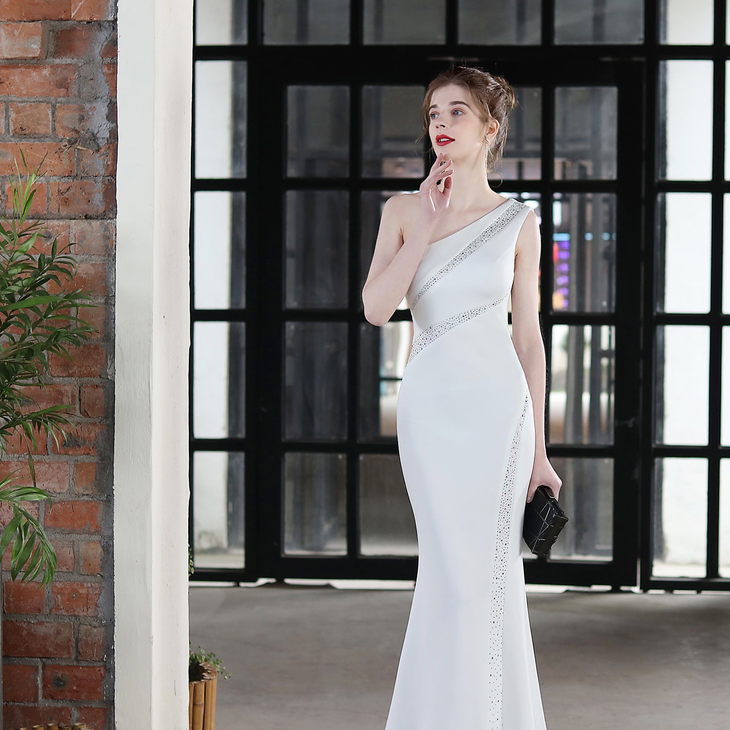 A refined evening dress with a one-shoulder silhouette. It features an asymmetric neckline and a fishtail hem.