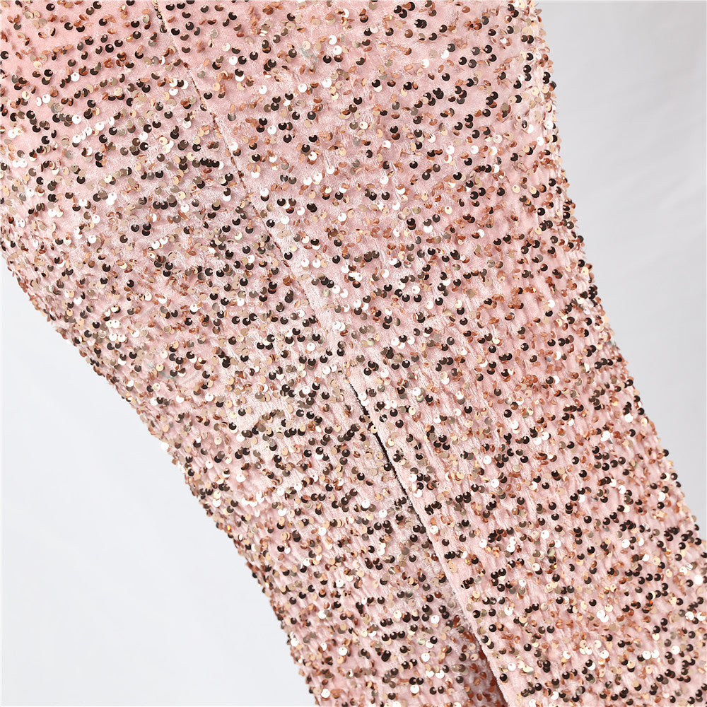 A sleeveless dress with a spaghetti-strap neckline and a slim, bodycon silhouette. Feathers and sequins accent the bodice, with a front split and a hidden back zipper.