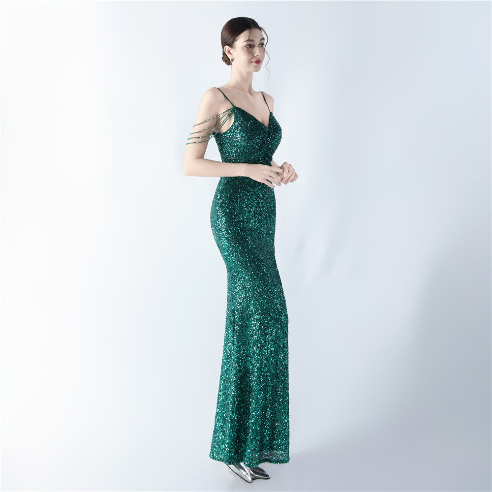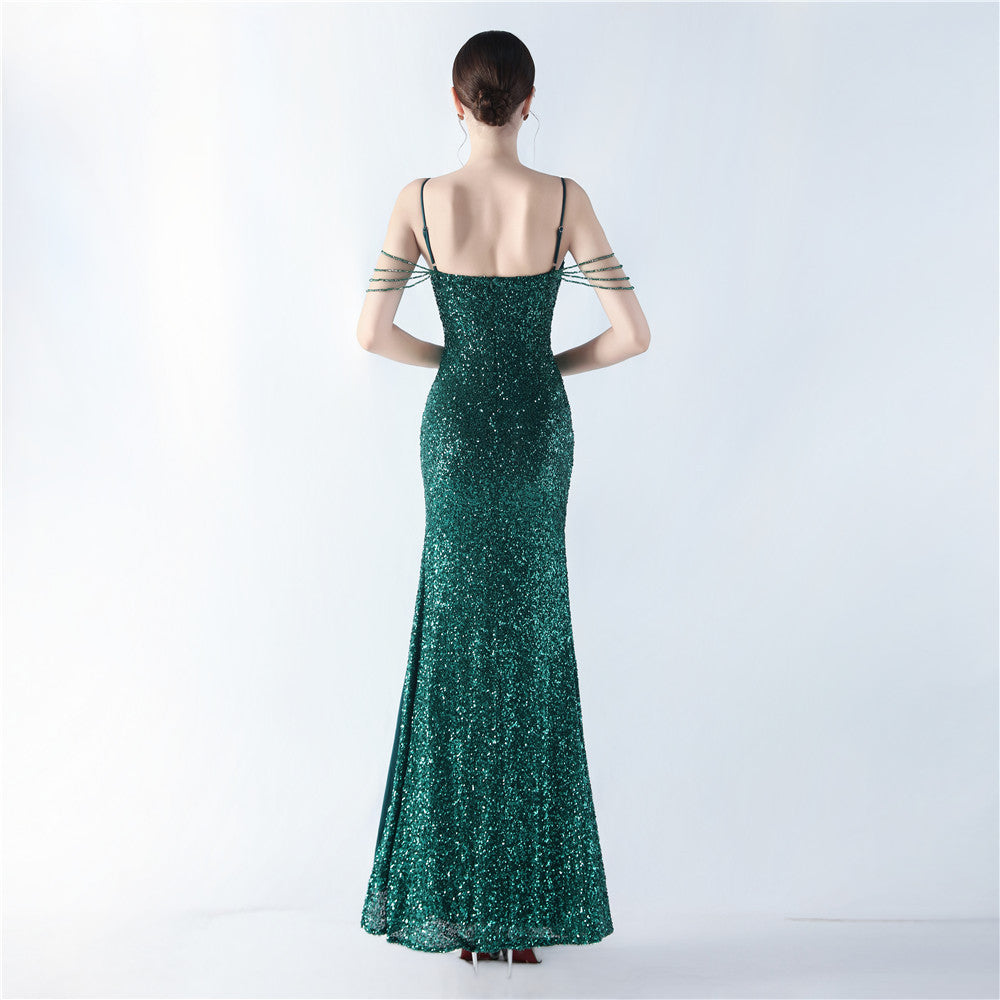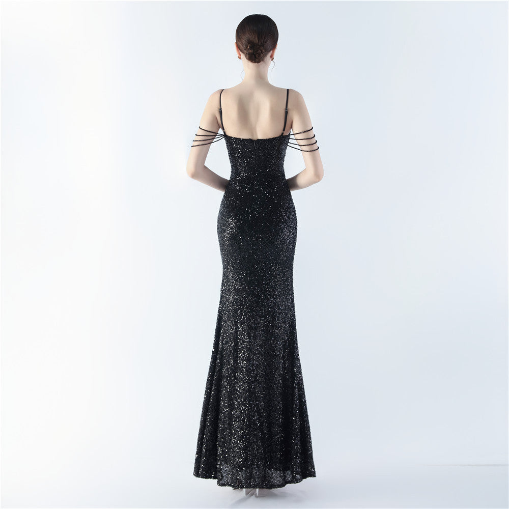 A sequined beaded maxi dress with a clean, slim silhouette. The V-neck leads into a discreet zipper and a high split, with sequin embellishments that catch the light.