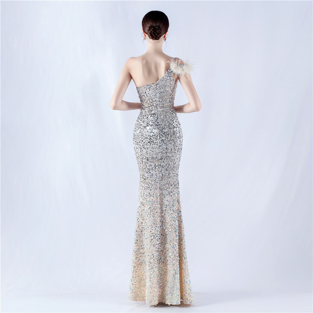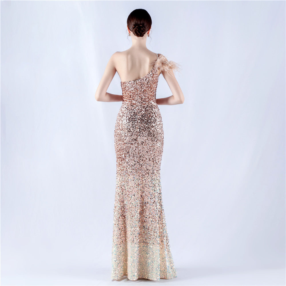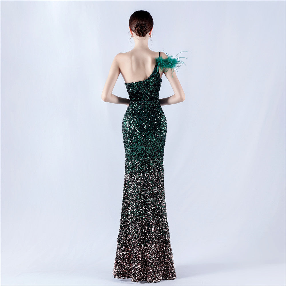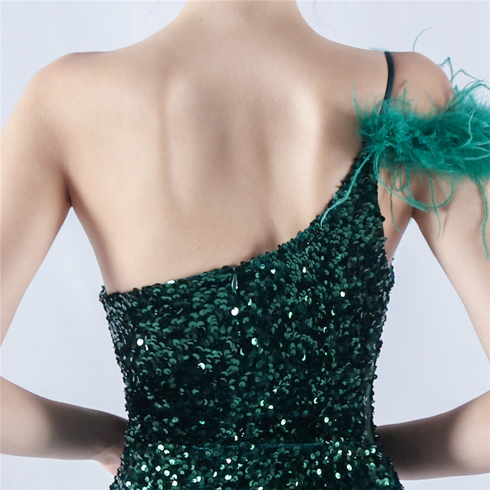 A one-shoulder maxi with a slim, sculpted silhouette. Embellishments include sequins and feather accents, with a backless, one-shoulder neckline.
