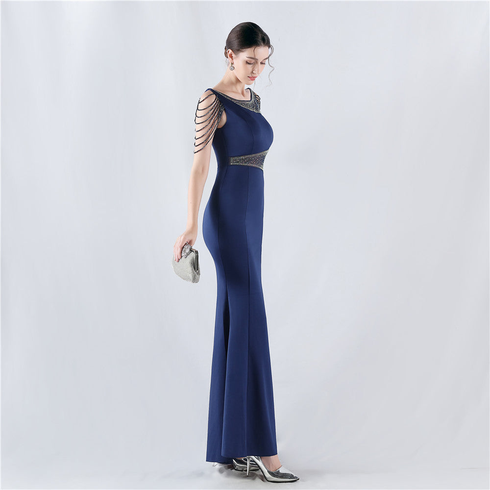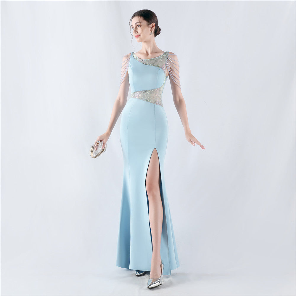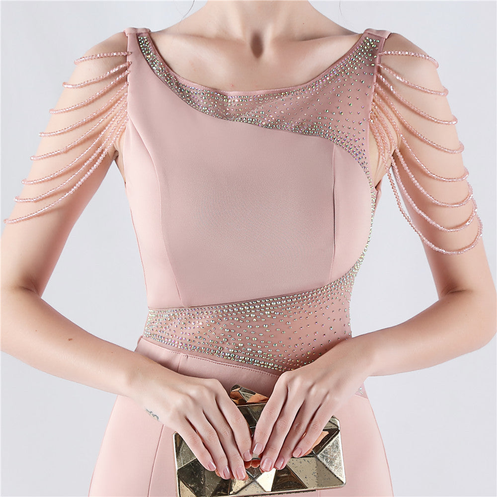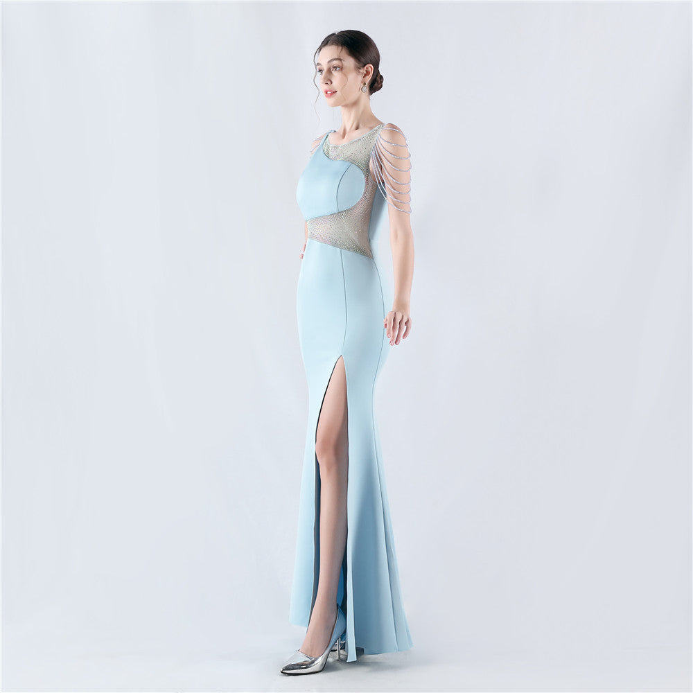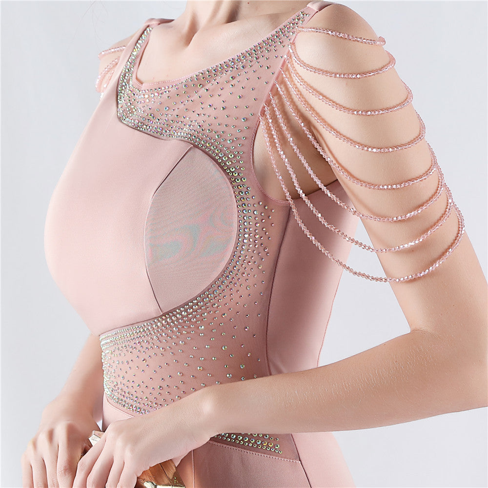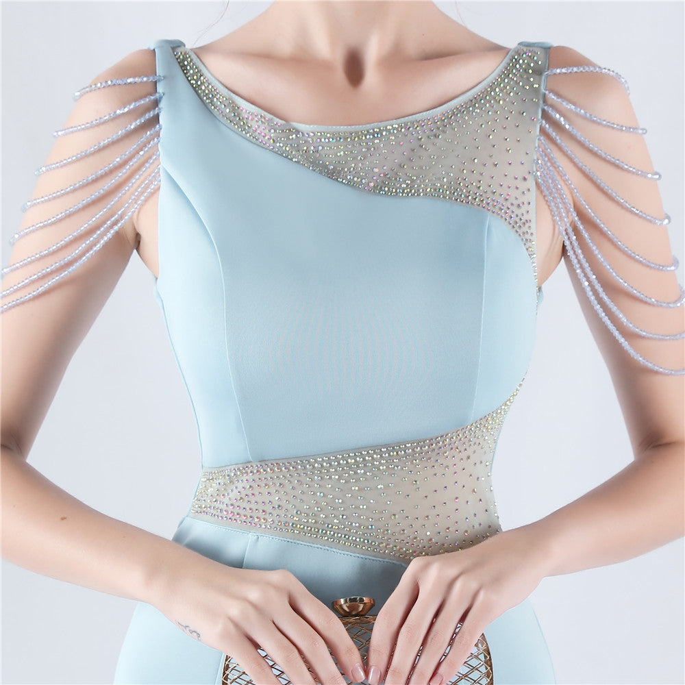 A sheer mesh maxi with a slim, body-skimming silhouette. A crew neckline and a discreet zipper are accented with rhinestones.