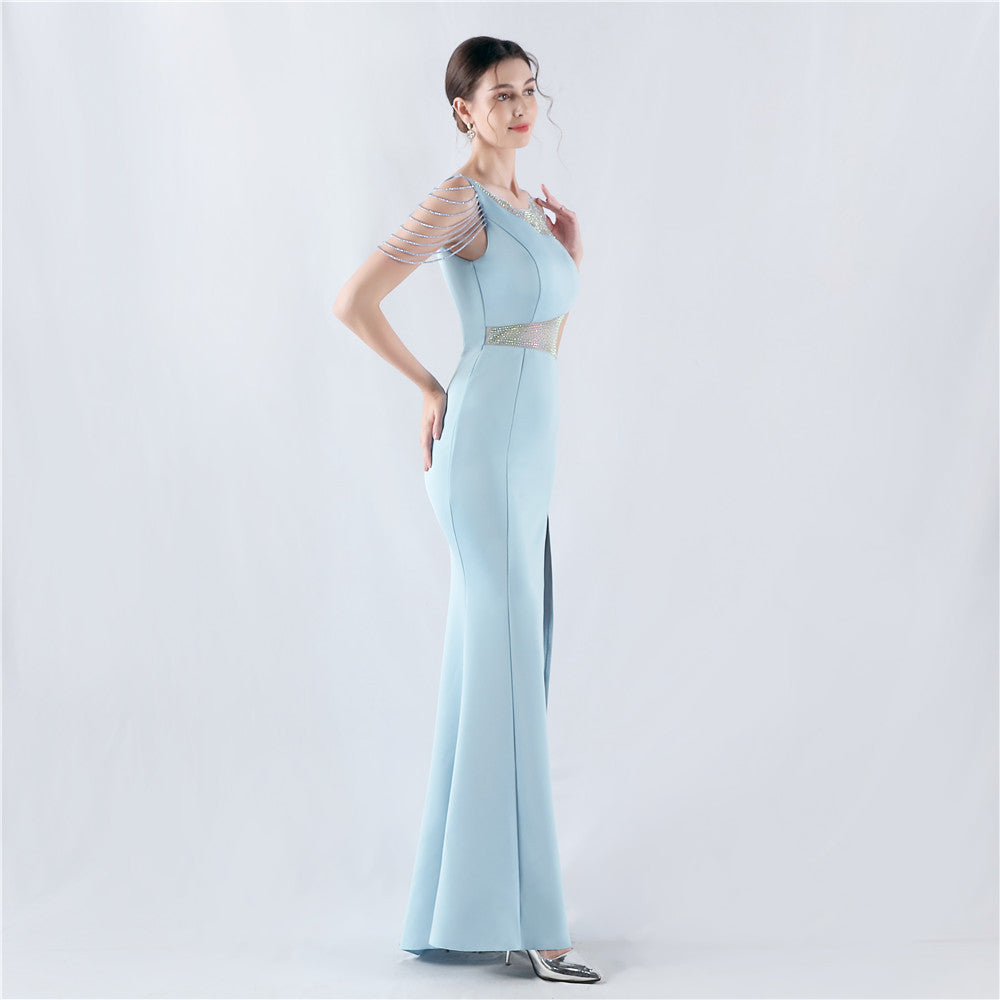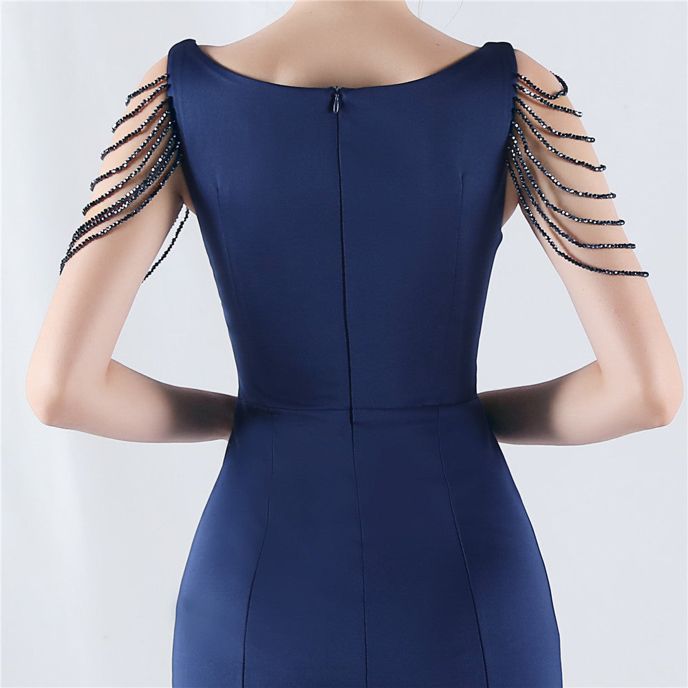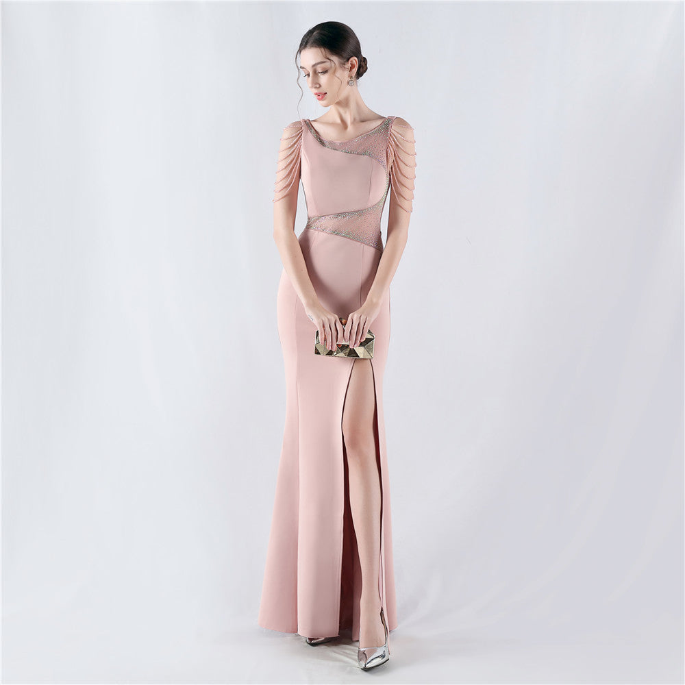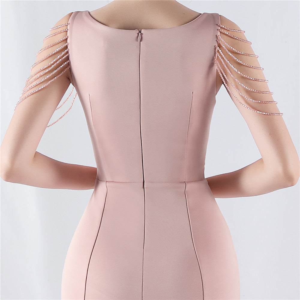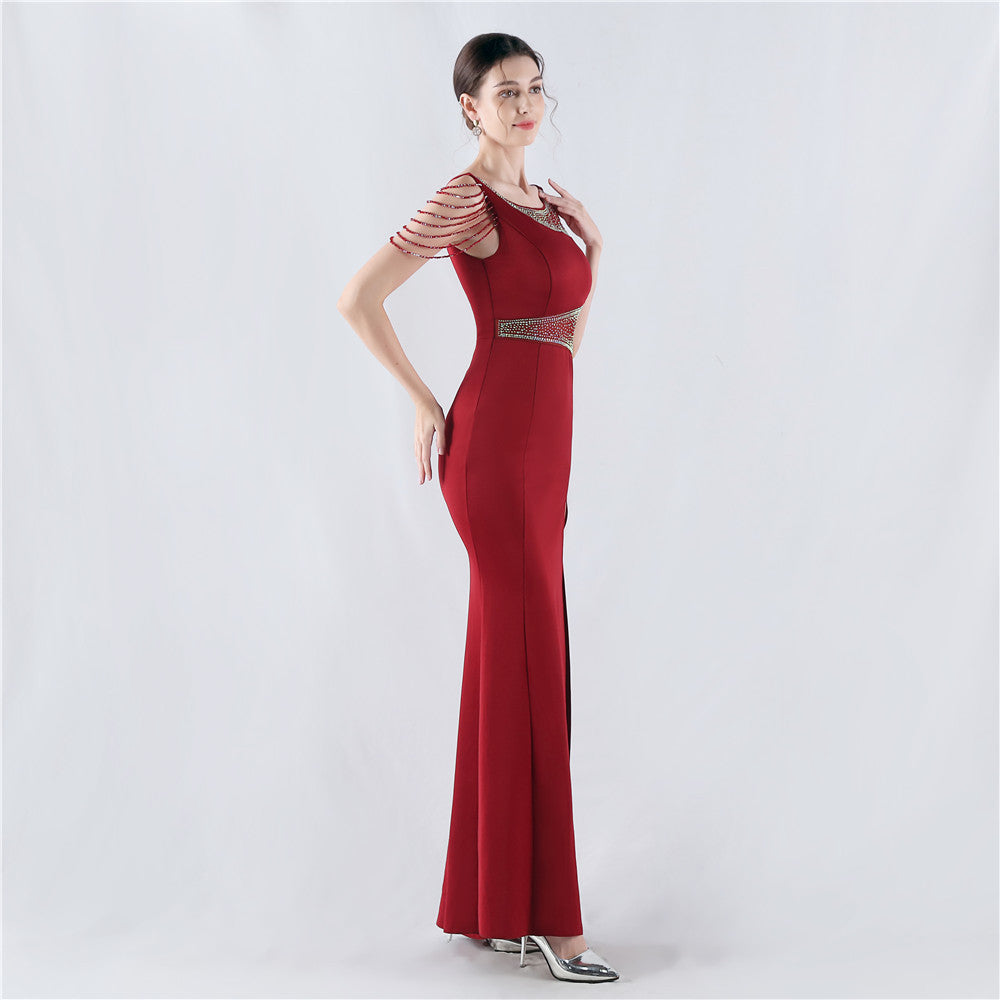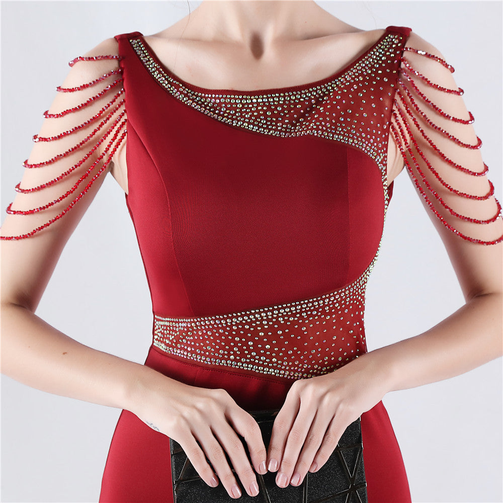 A sheer mesh maxi with a slim, body-skimming silhouette. A crew neckline and a discreet zipper are accented with rhinestones.
