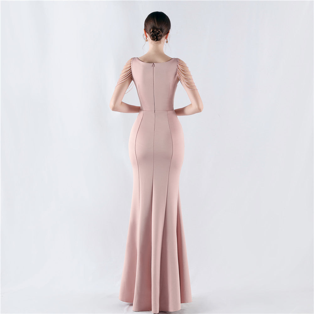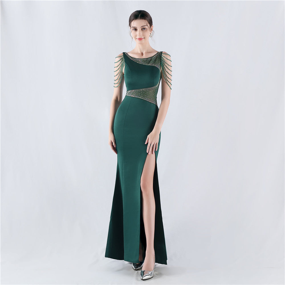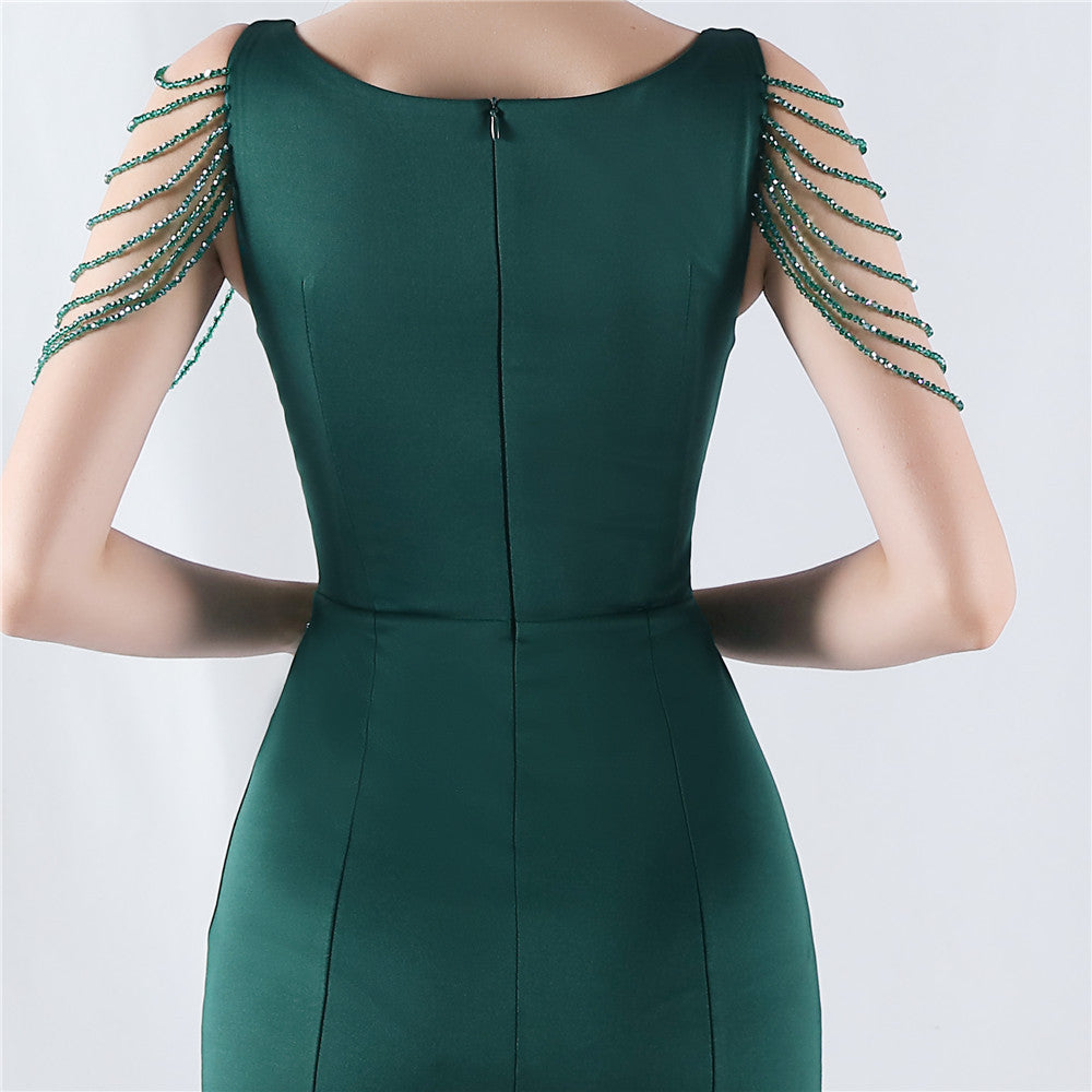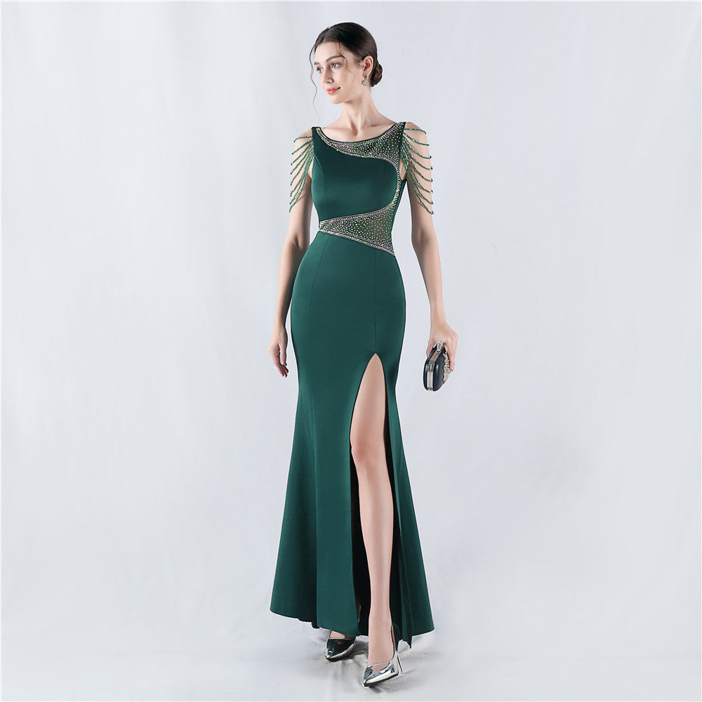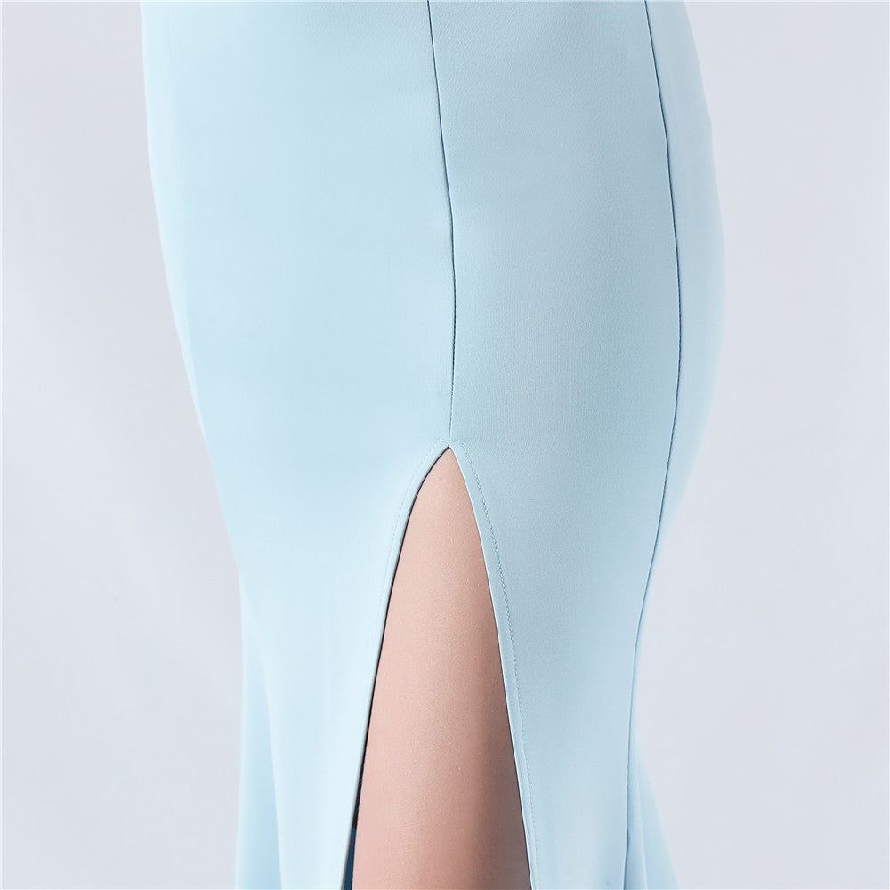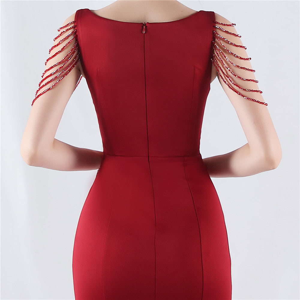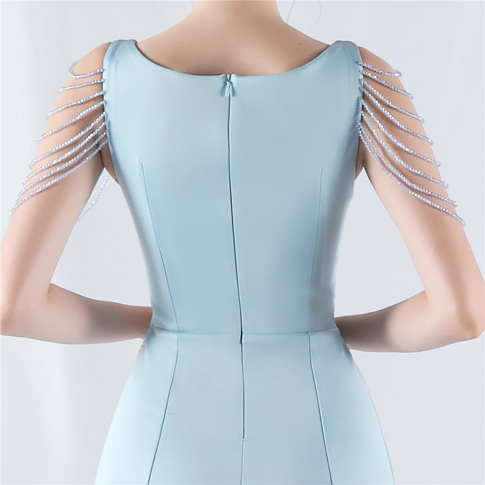 A sheer mesh maxi with a slim, body-skimming silhouette. A crew neckline and a discreet zipper are accented with rhinestones.