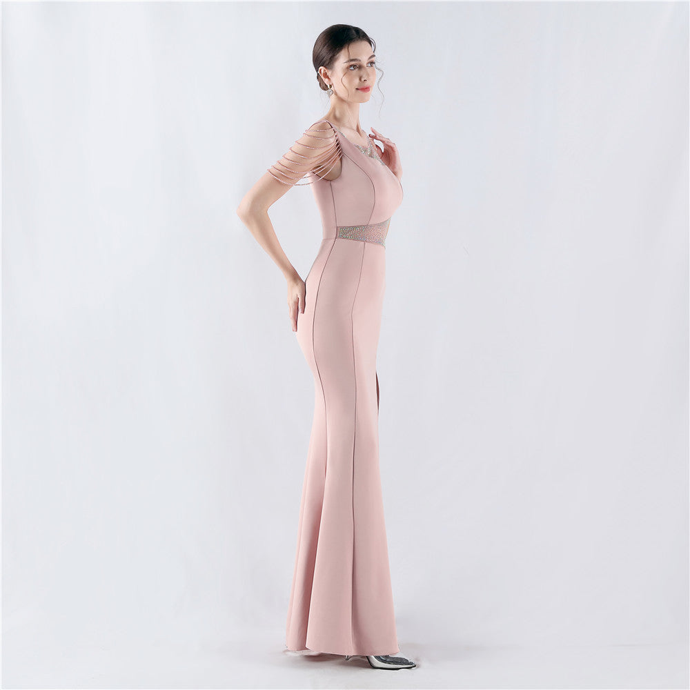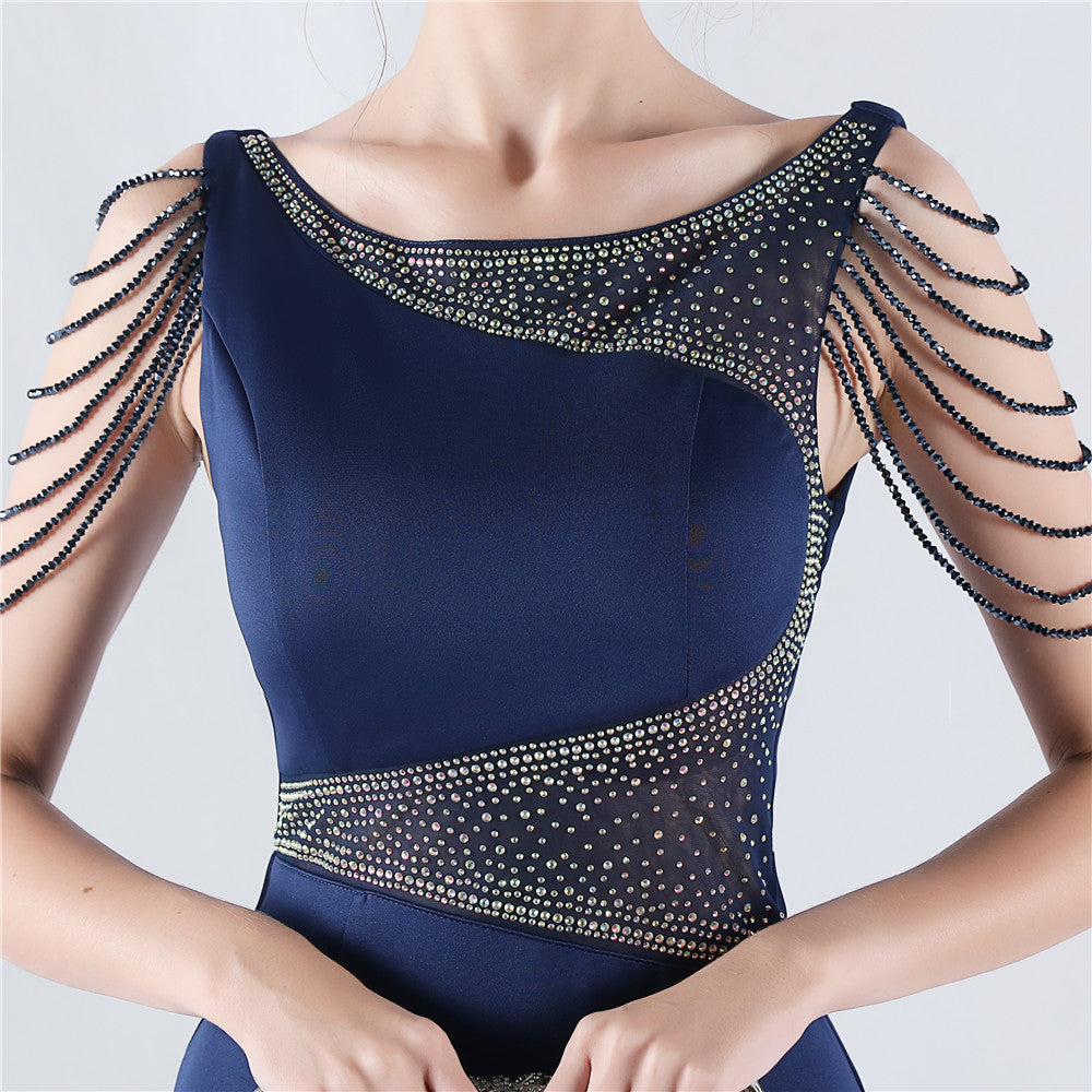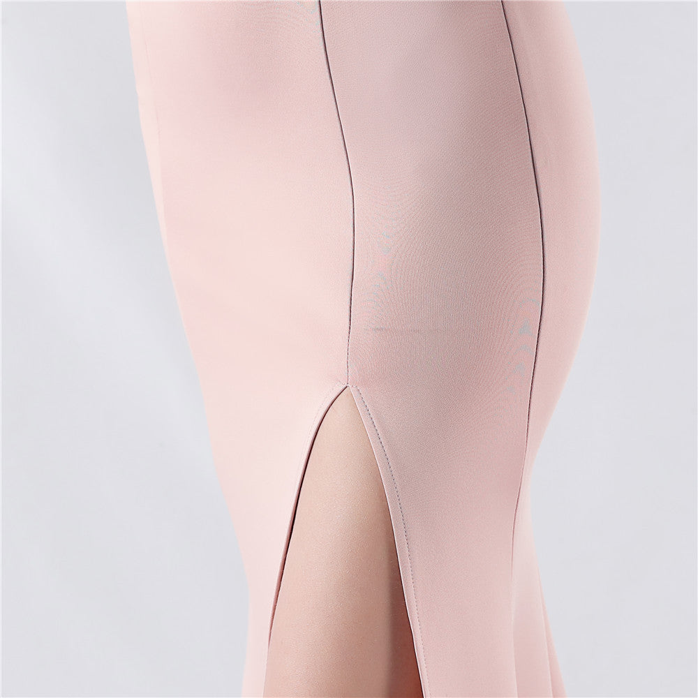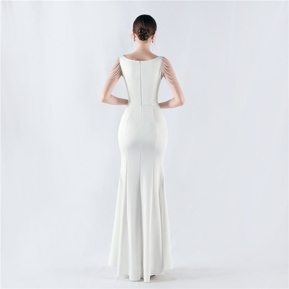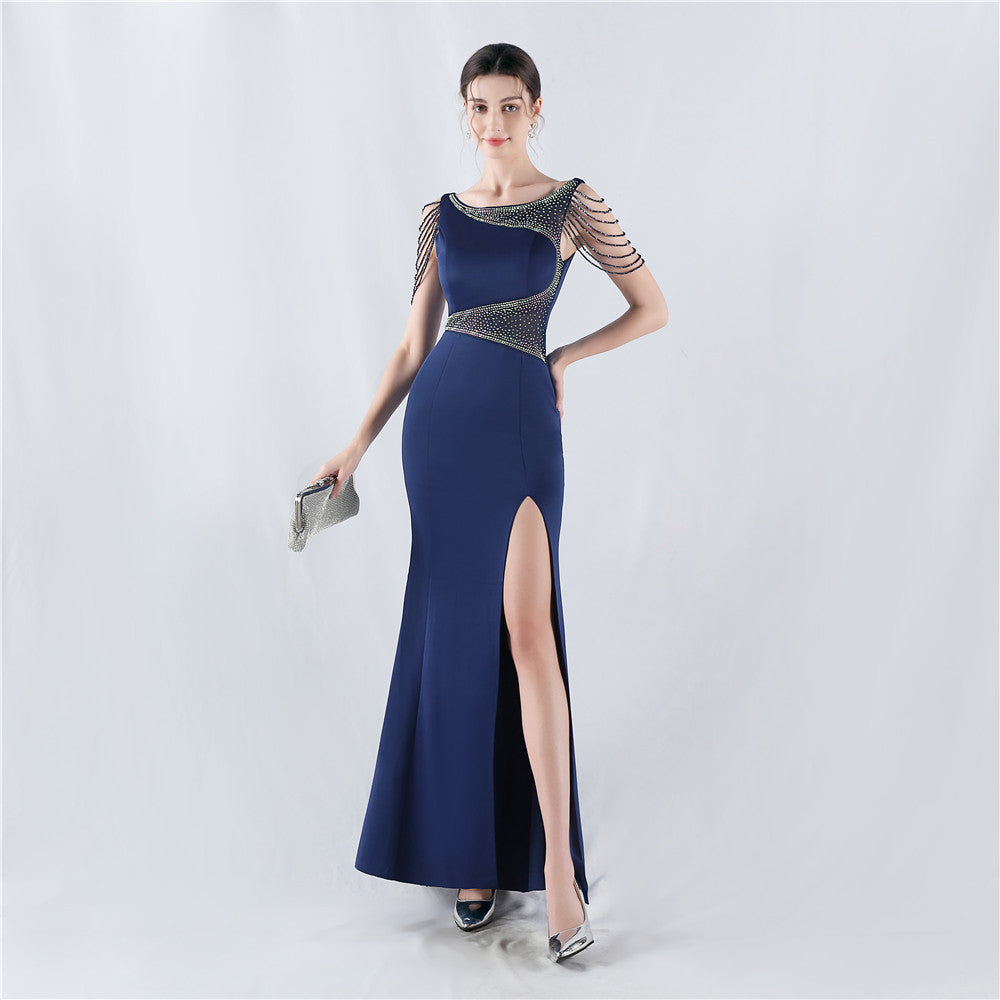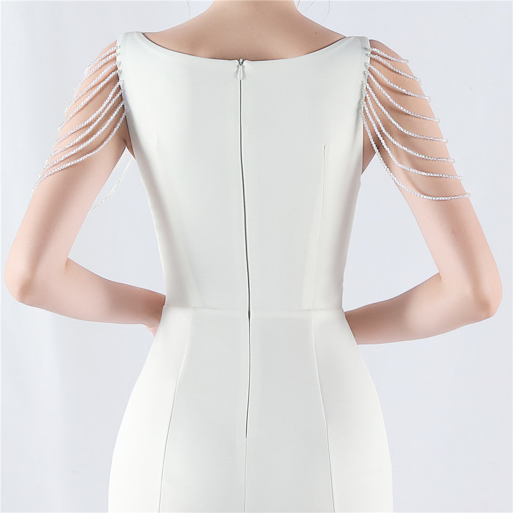 A sheer mesh maxi with a slim, body-skimming silhouette. A crew neckline and a discreet zipper are accented with rhinestones.