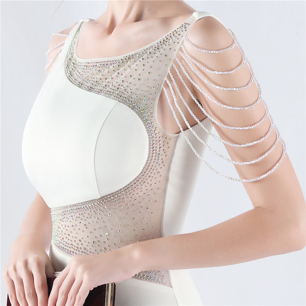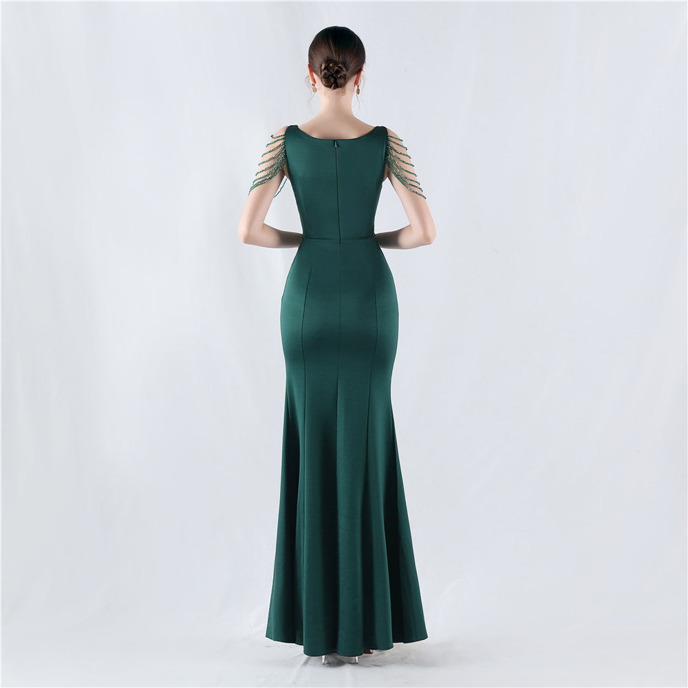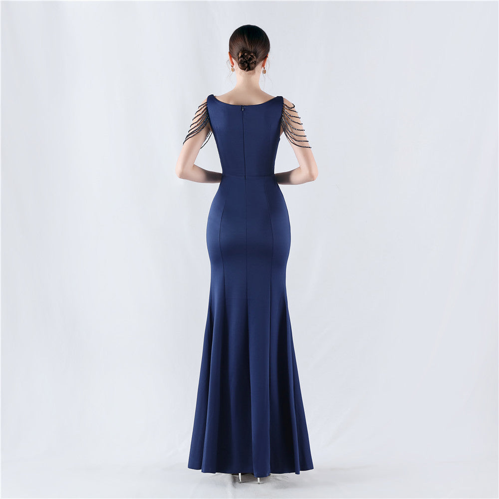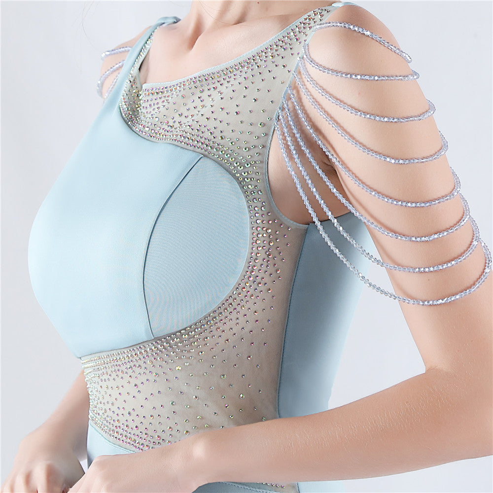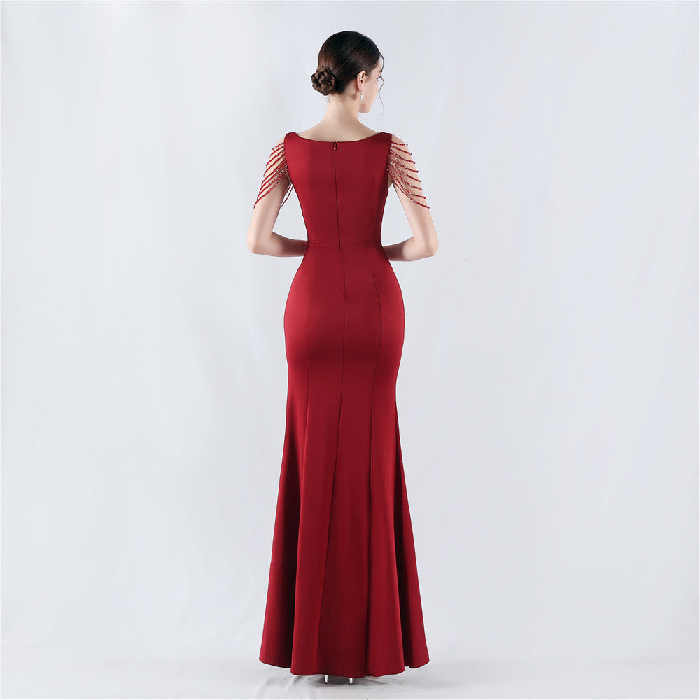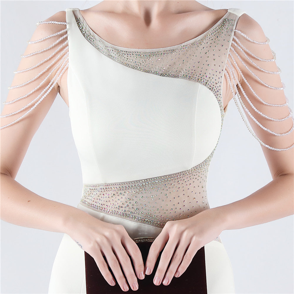 A sheer mesh maxi with a slim, body-skimming silhouette. A crew neckline and a discreet zipper are accented with rhinestones.
