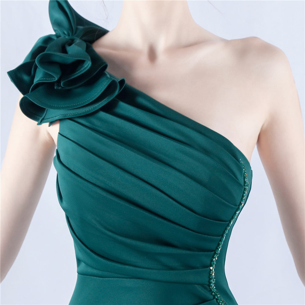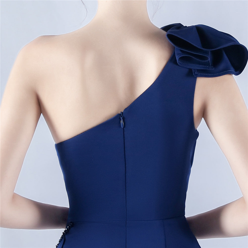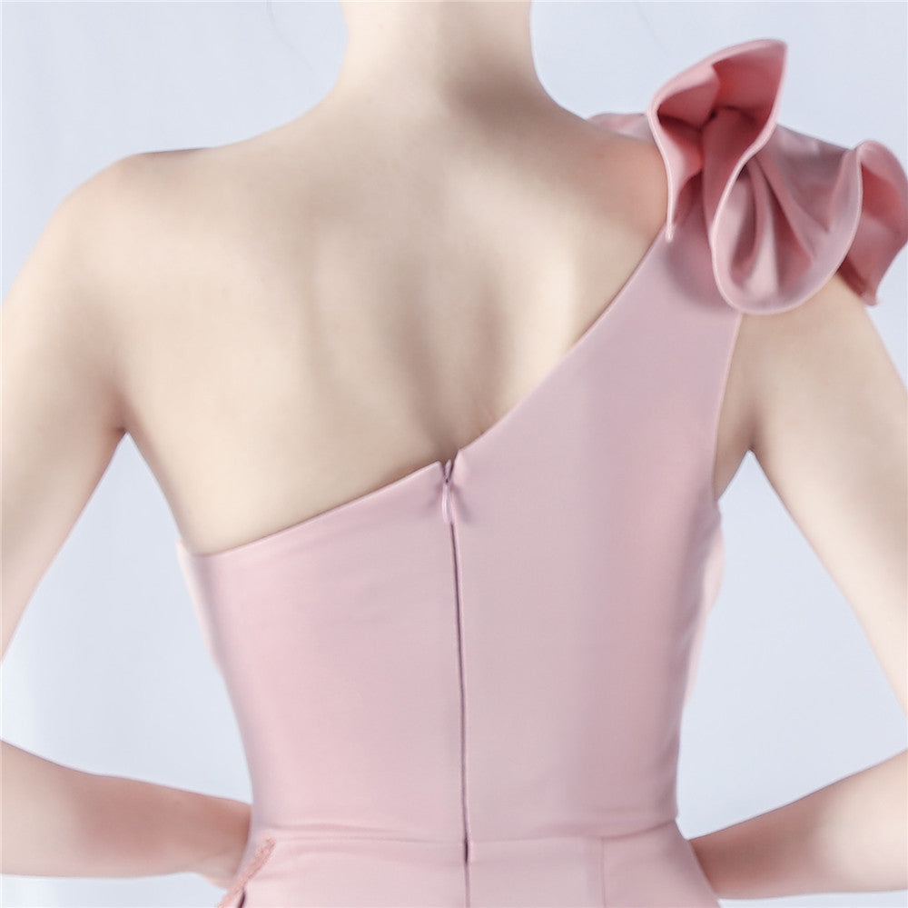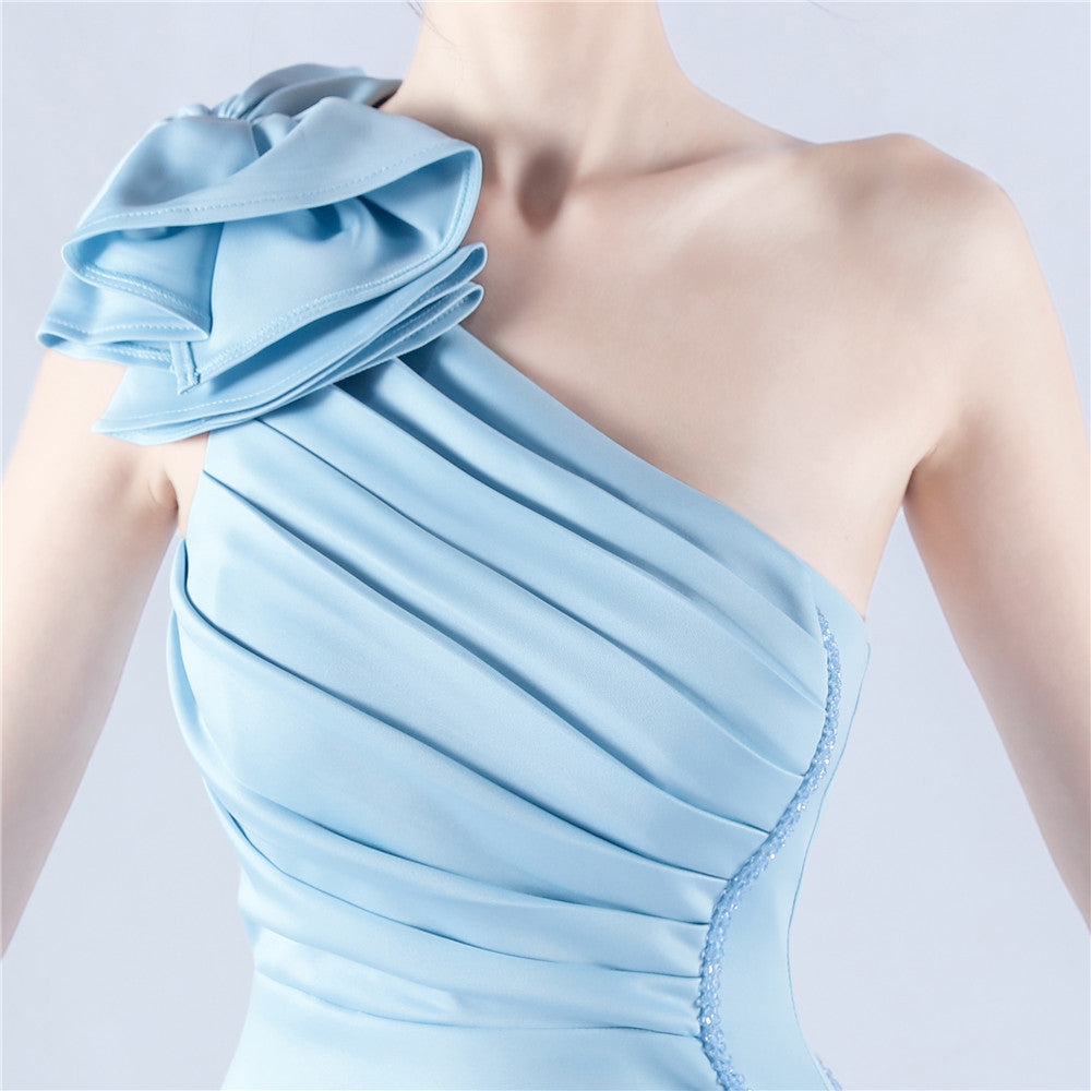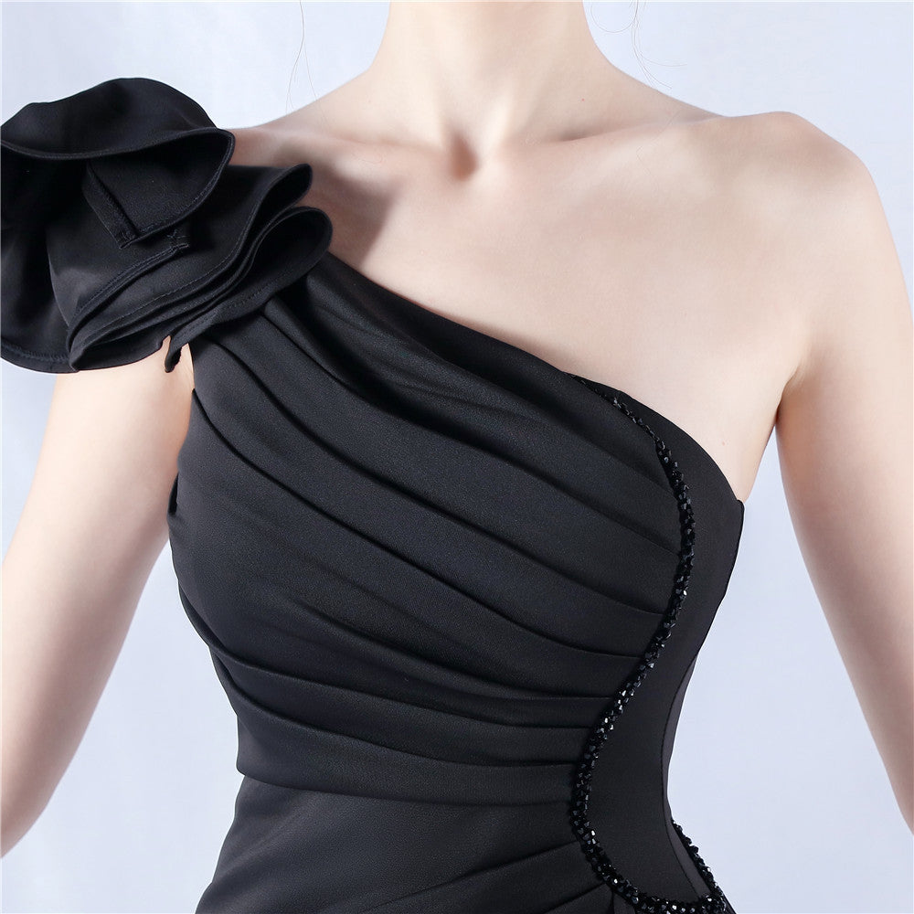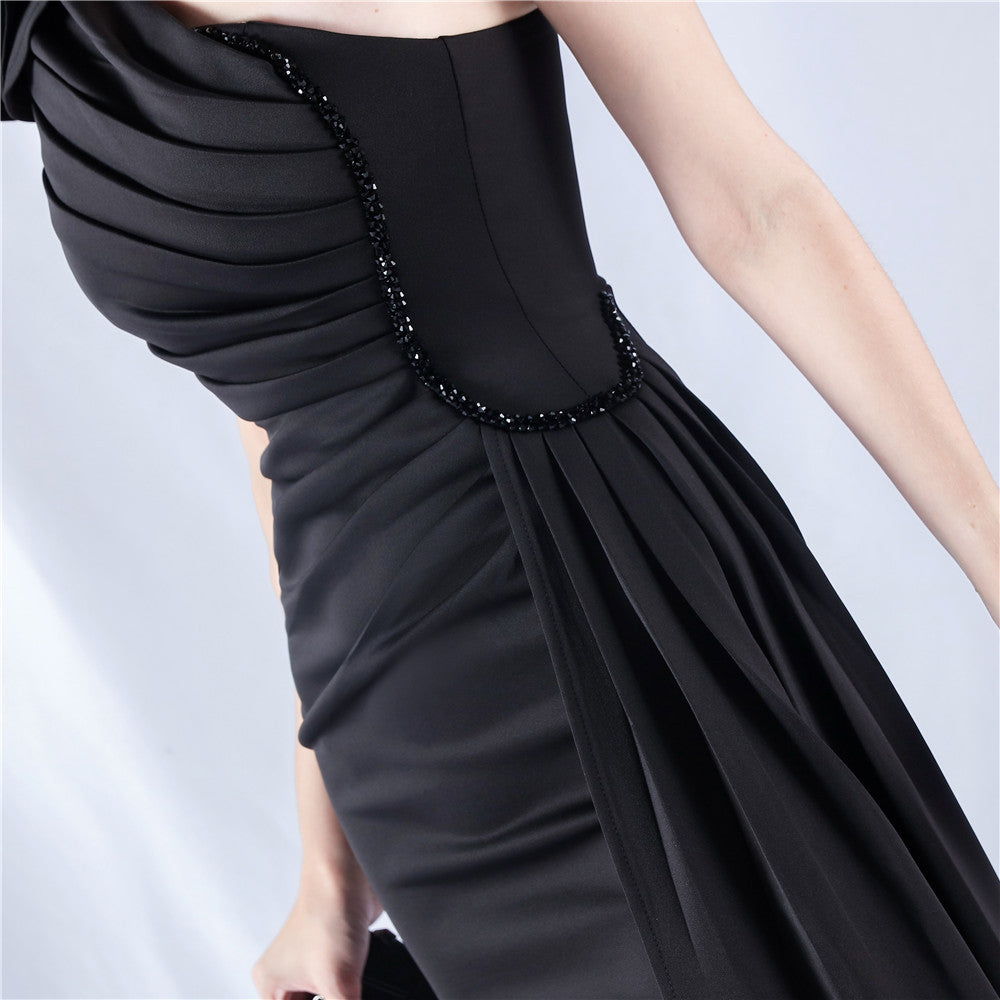 One-shoulder maxi with a slim, streamlined silhouette. Embellishment includes rhinestones and subtle folding at the bodice, with a concealed zipper.