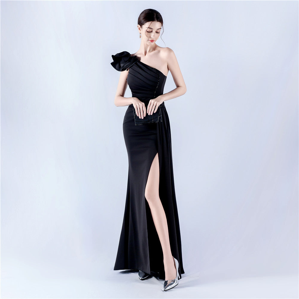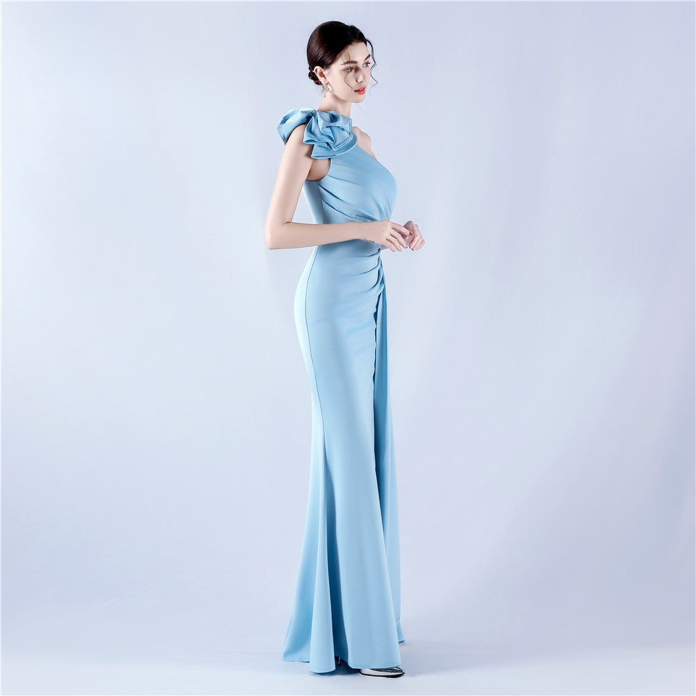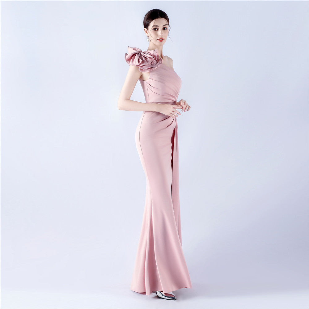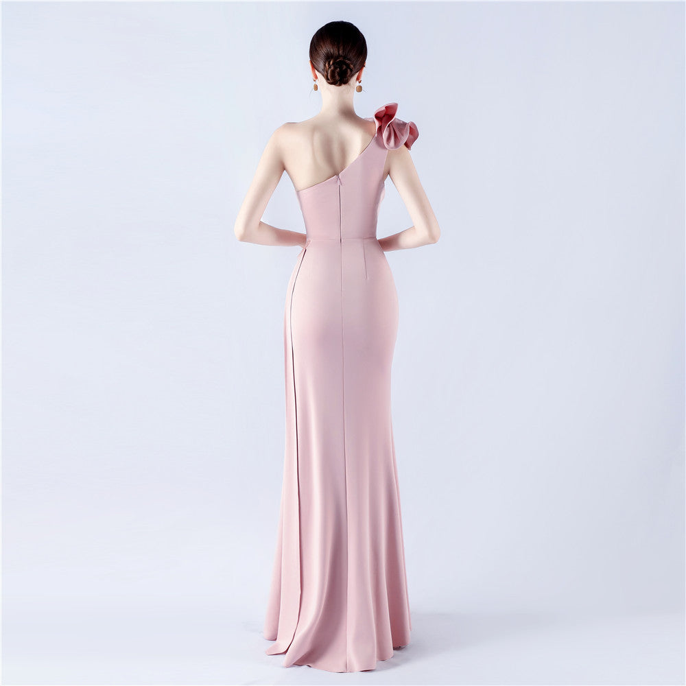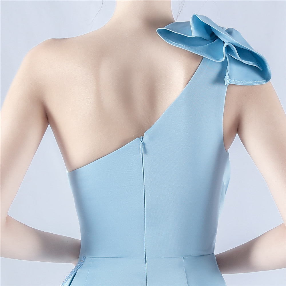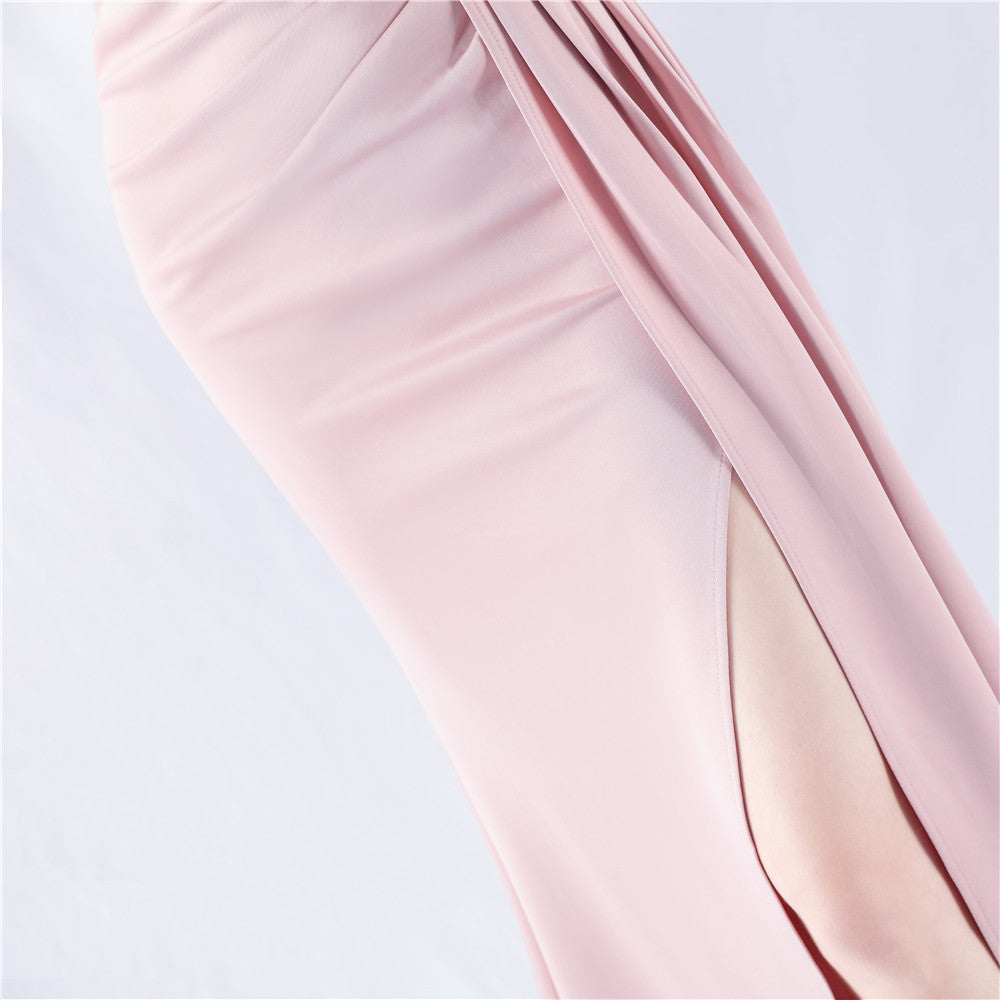 One-shoulder maxi with a slim, streamlined silhouette. Embellishment includes rhinestones and subtle folding at the bodice, with a concealed zipper.