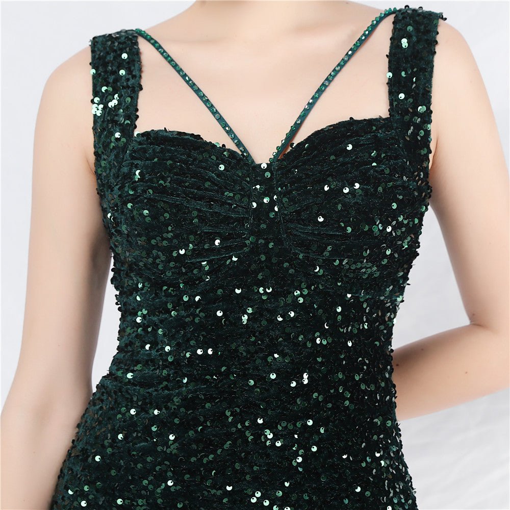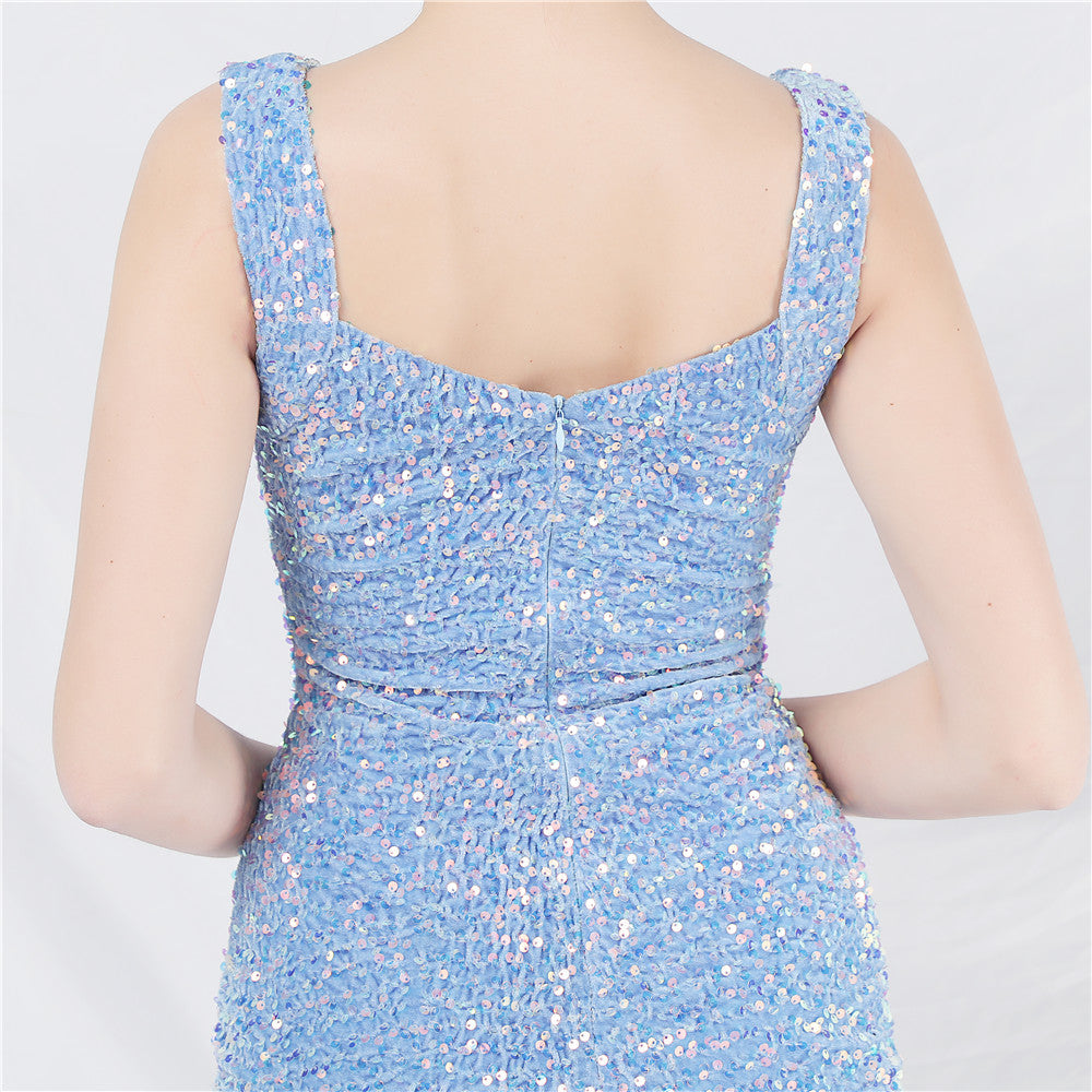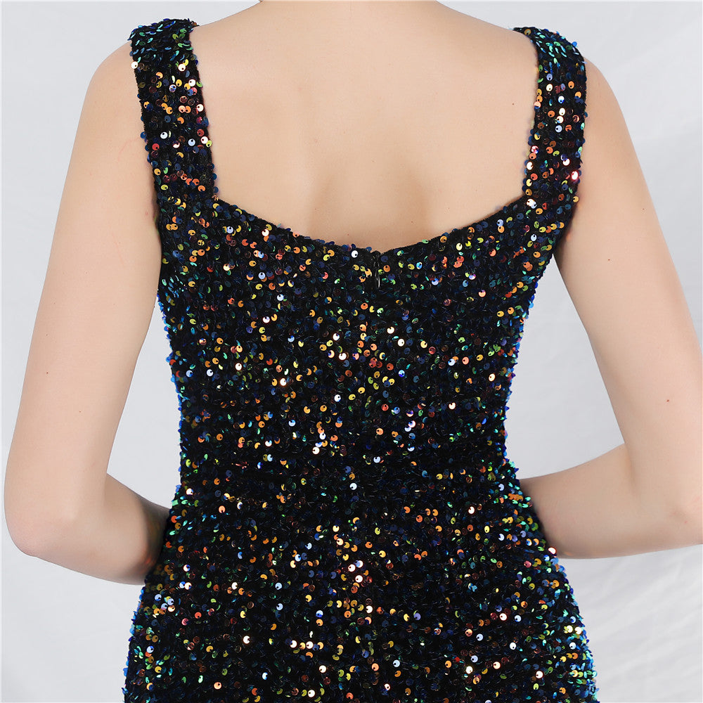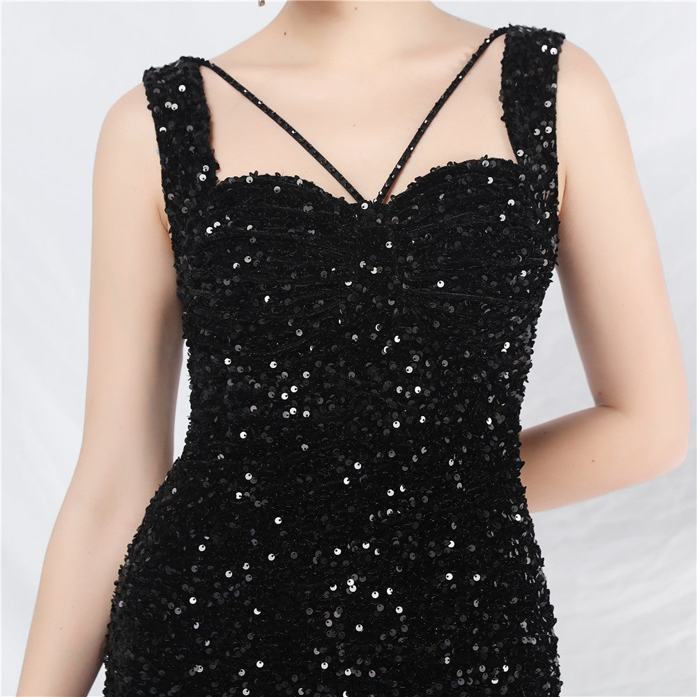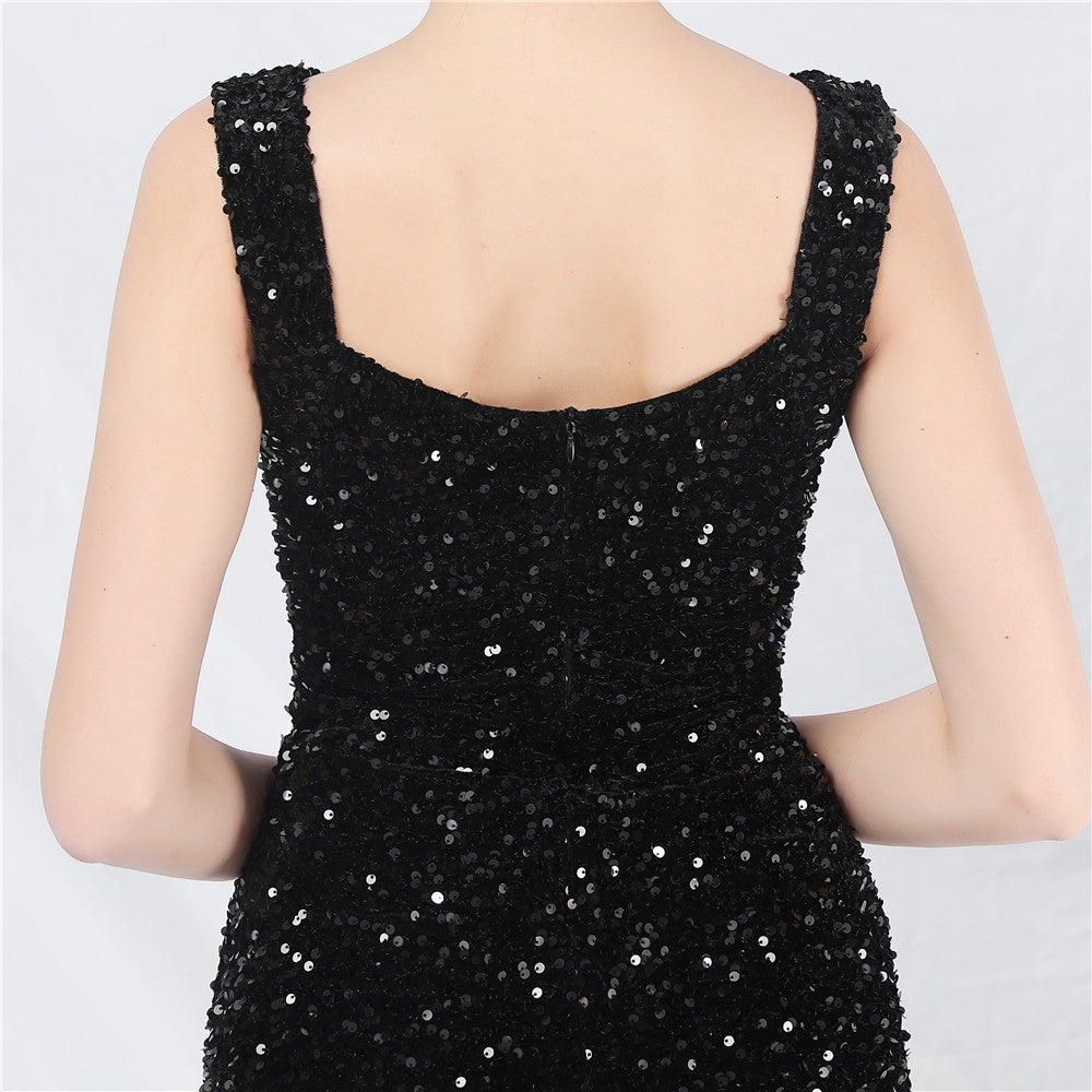 A sleek, sleeveless bodycon dress with a short, fitted silhouette and a simple neckline. Ruching and sequin embellishments run through the front, finished with a concealed zipper along the back.