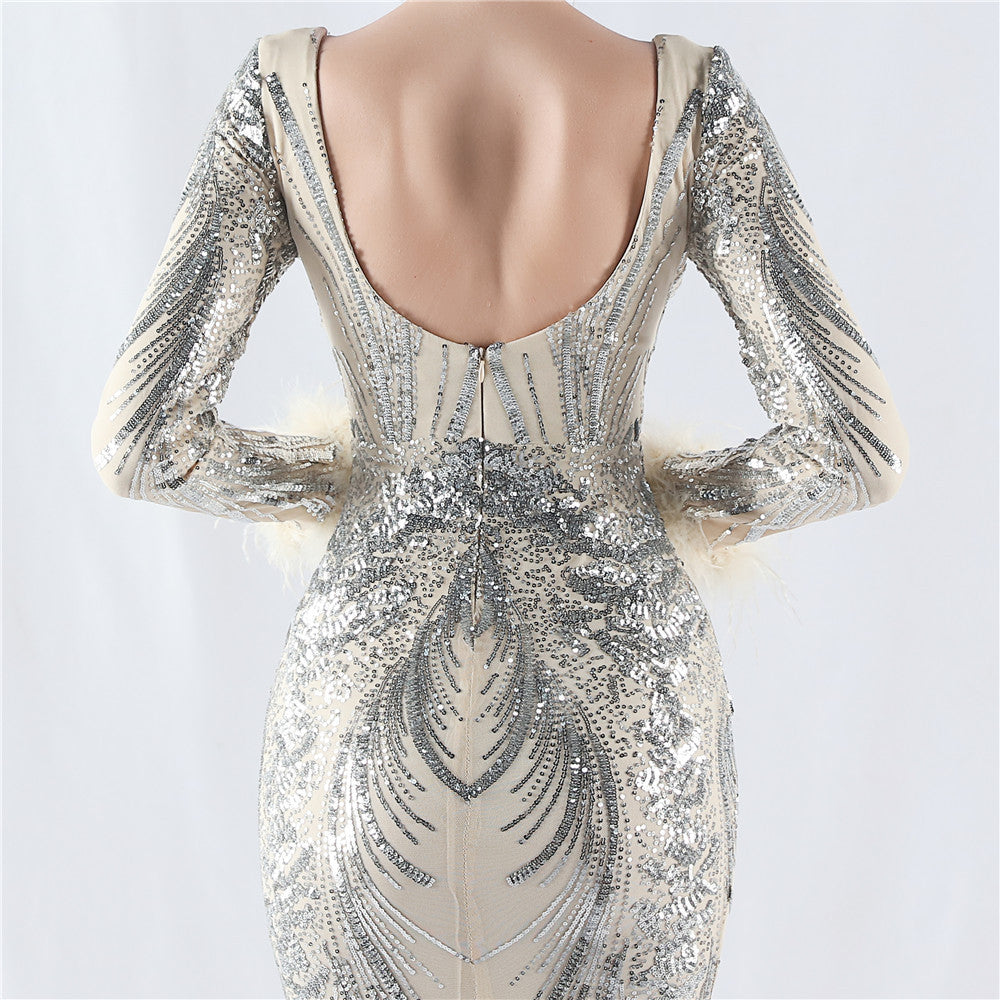 A sequin feather maxi with a slim silhouette. A V-neck, a backless bodice, and feather accents define its clean line.