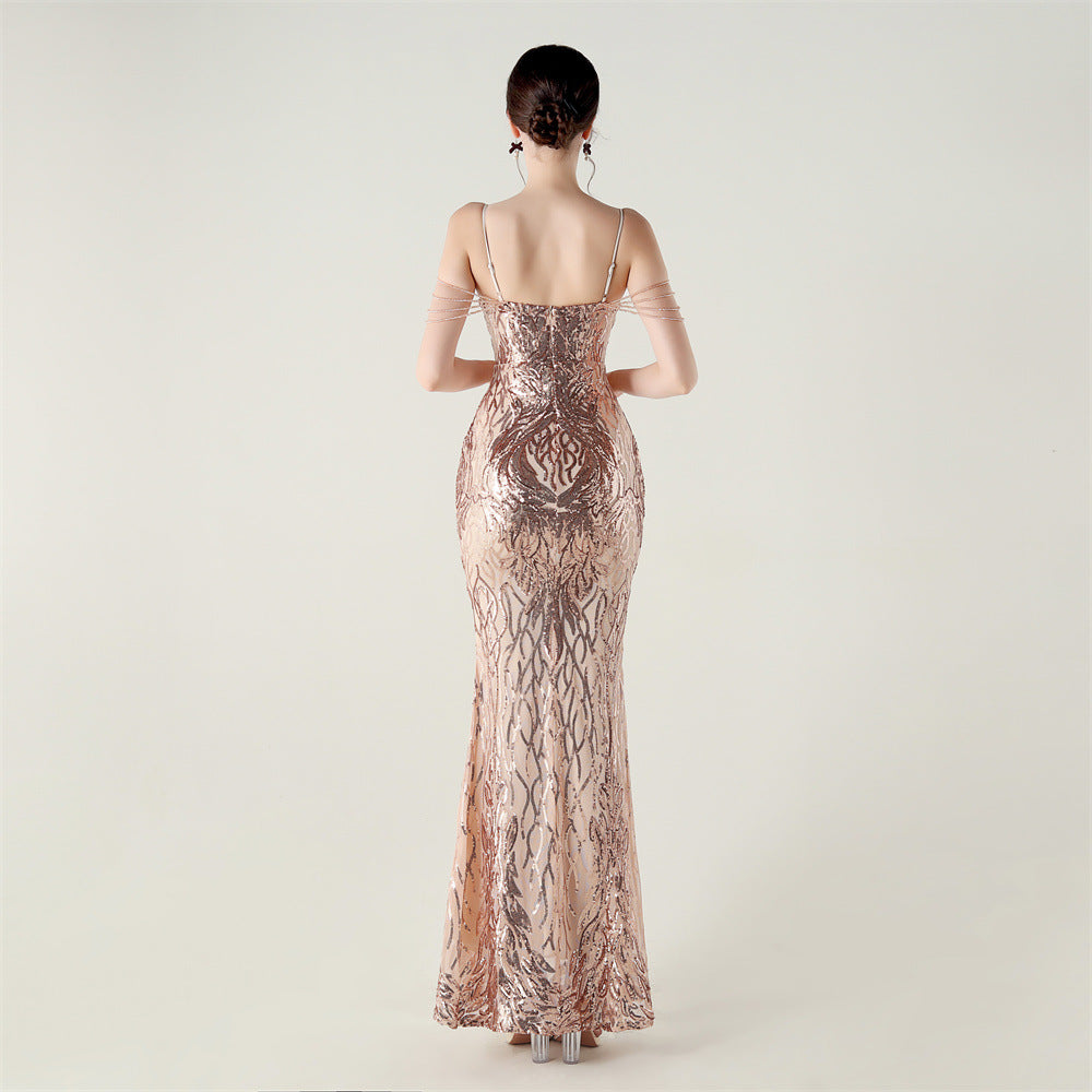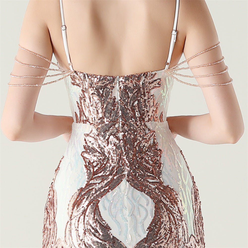 A refined maxi dress with a slim silhouette. The V-neck, sleeveless bodice features floral embroidery with bead and sequin embellishment and a discreet zipper.