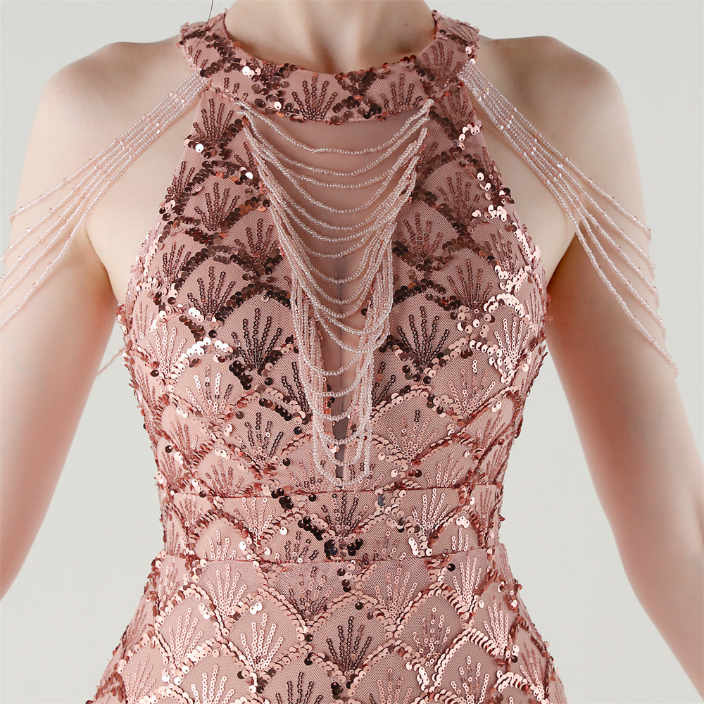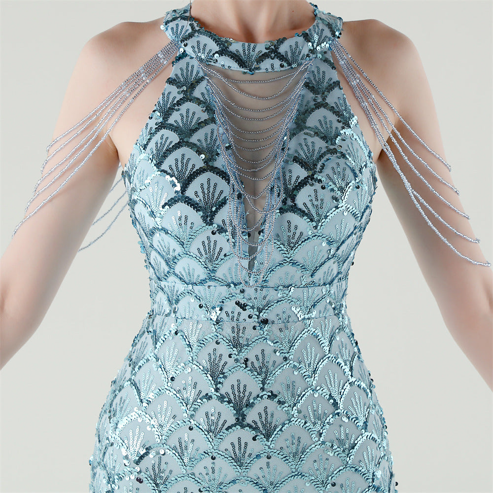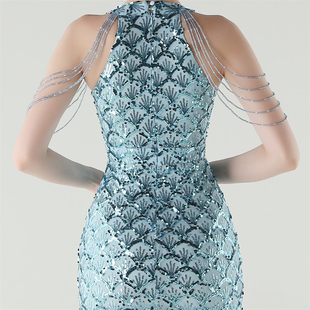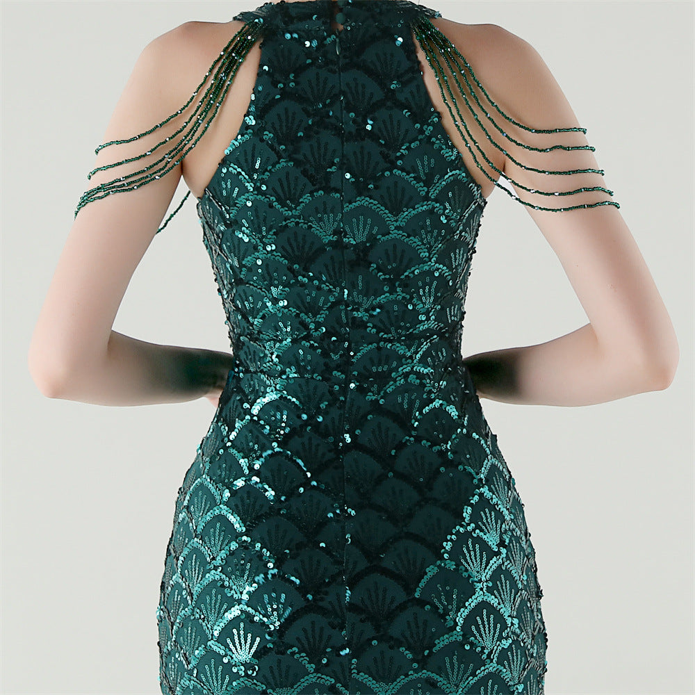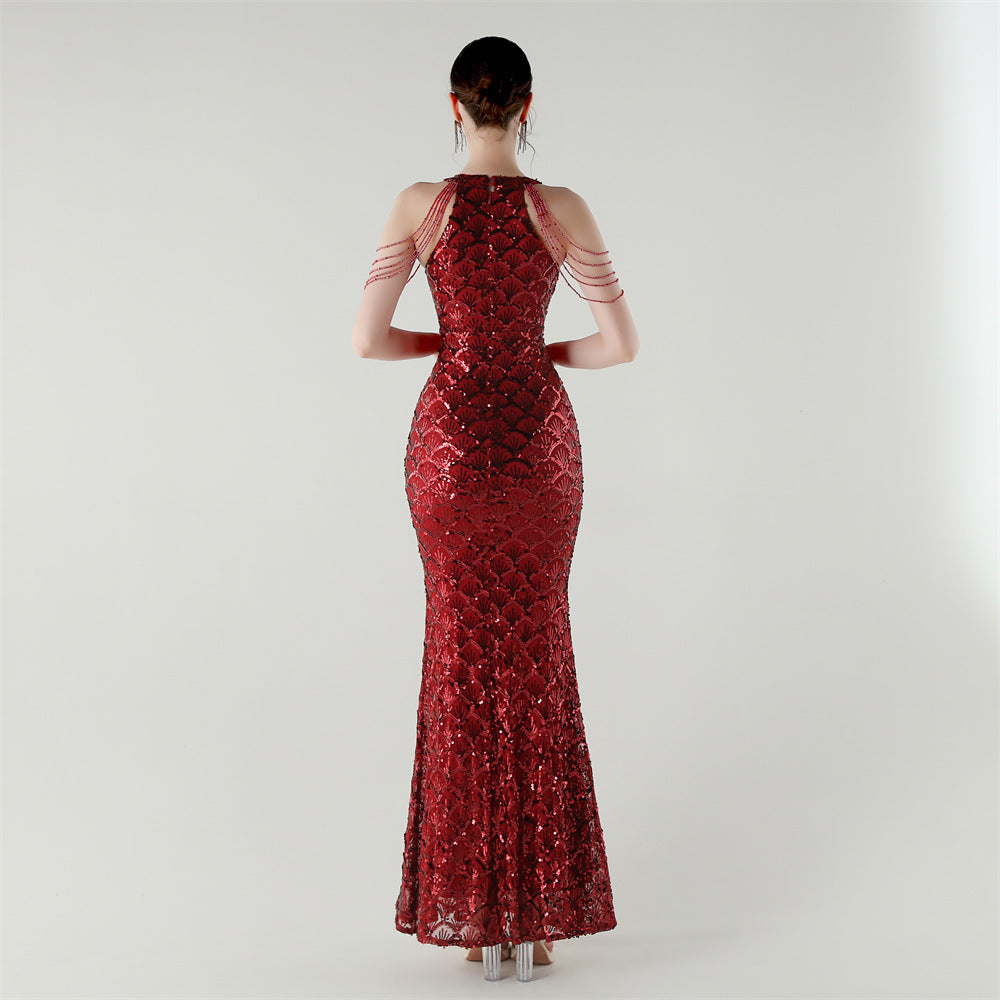 The sequined fishtail maxi offers a slim, column silhouette for formal evenings. A crew neck with subtle sequin embellishment and a structured fishtail hem complete the refined form.