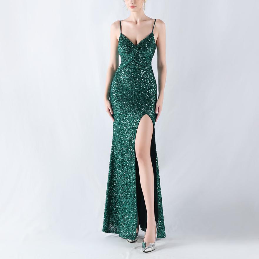 An elongated, body-skimming gown with a high-impact V-neck and a thigh-high split. The dress features ruched panels, a discreet zipper, and scattered sequins that catch the light.